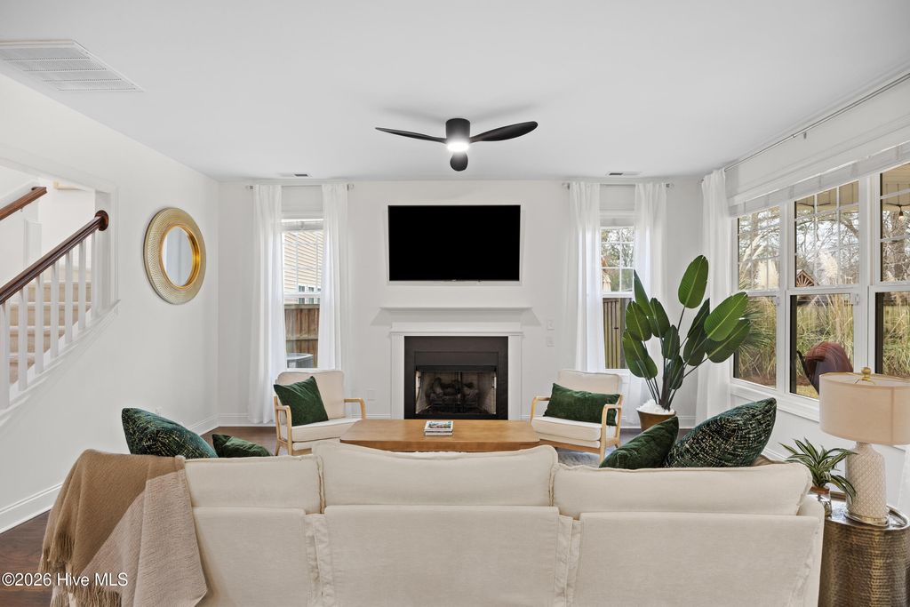With more than 4,100 square feet, this 4 bedroom, 4.5 bathroom home offers room to spread out across the thoughtfully planned layout. The primary suite is tucked away on the main level, offering privacy and easy access. Inside, you'll find a spacious ensuite complete with dual vanities, a tiled walk-in shower, and an oversized closet. The main living areas flow seamlessly together with an open-concept design and durable laminate wood flooring throughout. The kitchen is built to impress with granite countertops, a classic subway tile backsplash, and stainless steel appliances, including a double oven, vented range hood, and refrigerator. This home includes a whole house filtration system and RO system. The living room is filled with natural light from large windows and anchored by a gas log fireplace. Upstairs, one bedroom enjoys its own private bath, while two additional bedrooms share a Jack-and-Jill bathroom. A generous family room on this level offers flexibility and could easily function as a fifth bedroom, if needed with a large walk in closet. The second floor laundry room includes a utility sink for added convenience. The third floor adds even more versatility with a spacious bonus room, making the ideal space for a 6th bedroom, home office, media room, playroom, or fitness space. Recent updates include brand new carpet and fresh paint throughout, creating a bright, move-in-ready feel from top to bottom. Outside, a long driveway provides plenty of parking, while the fenced backyard backs to wooded areas for added privacy and is your own private oasis. Located in the sought-after Wyndwater community, residents enjoy sidewalks, a neighborhood pool, and access to highly regarded schools & close to the public boat ramp. This is more than just square footage, it's a home designed for the way you live.