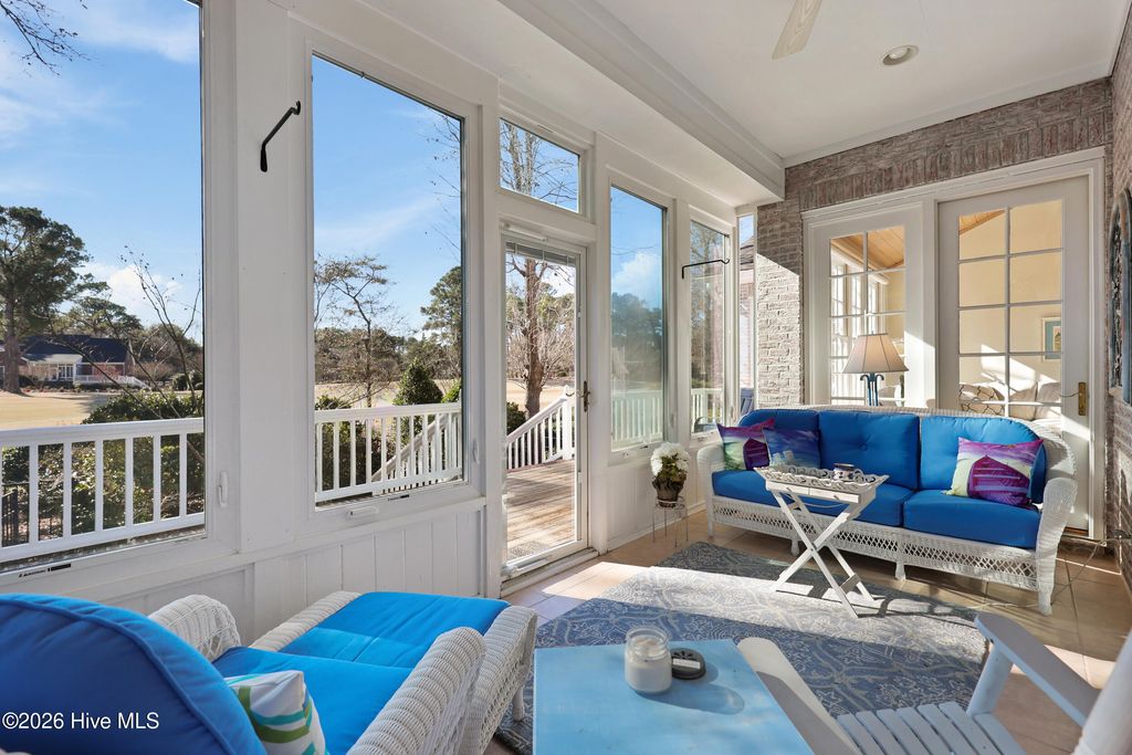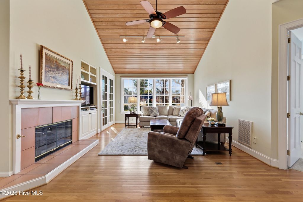 Located within the gated community of Porters Neck Country Club, this all-brick, three-bedroom, three-bath residence offers desirable first-floor living with a versatile loft and sweeping views of the 10th fairway. Ideally positioned near the clubhouse, recreation center, and pool, this home combines convenience, comfort, and golf course living. With sought-after southern exposure, natural light fills the interior while the rear deck captures picturesque fairway views--perfect for enjoying morning coffee or evening sunsets. Inside, dramatic two-story tongue-and-groove ceilings and skylights enhance the open-concept living space, creating warmth, architectural character, and an airy feel throughout. The renovated and expanded kitchen features updated cabinetry, quartz countertops, and seamless flow into the dining area and sunroom--ideal for entertaining or everyday living. A two-sided fireplace anchors the living and dining rooms, adding charm and functional elegance. The main-level primary suite allows for easy living, while a secondary bedroom with built-in shelving (currently used as a home office) offers flexibility. A spacious loft provides additional living space--perfect for a media room, creative studio, or private retreat. Enjoy access to award-winning golf, tennis, pickleball, bocce, fitness facilities, and resort-style swimming within Porters Neck Country Club. Located less than one mile from the Intracoastal Waterway, this home offers convenient access to boating and coastal recreation. A rare opportunity to enjoy golf course views, low-maintenance brick construction, and an active coastal lifestyle in one of Wilmington's premier gated communities.
