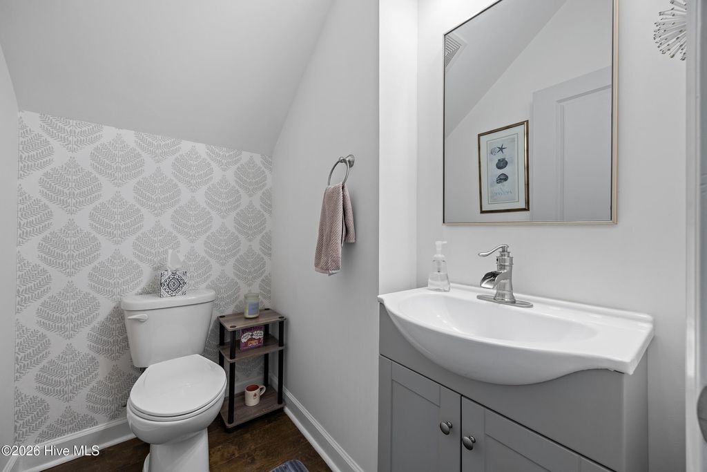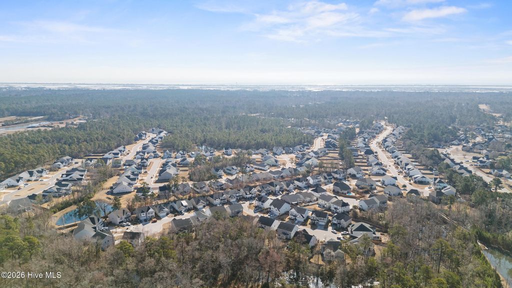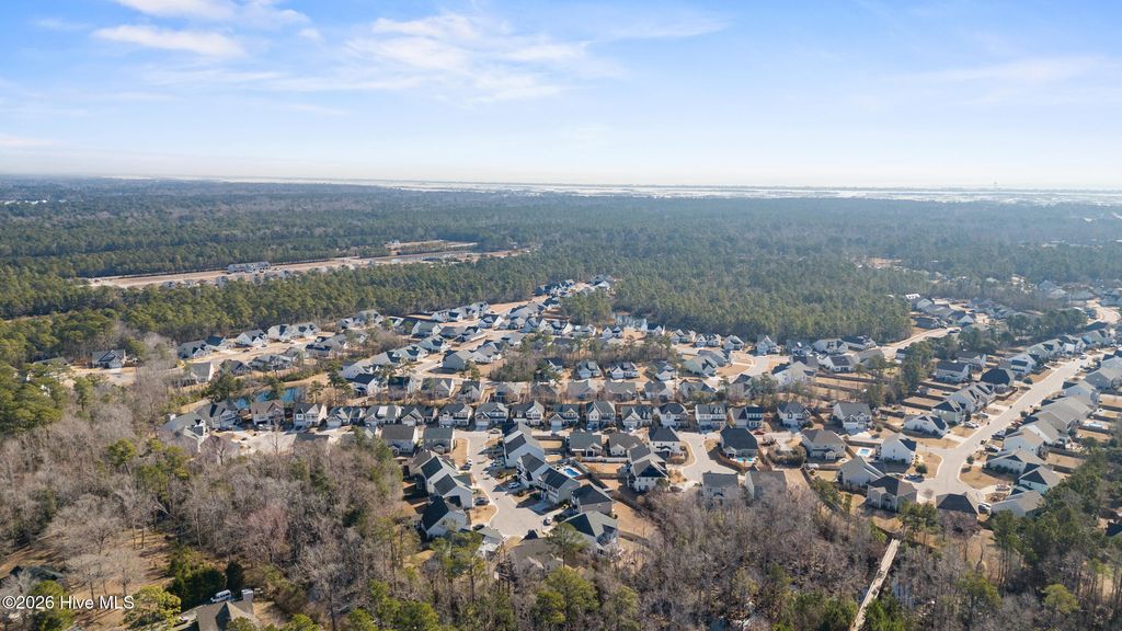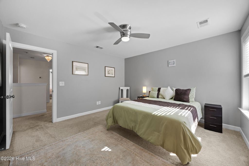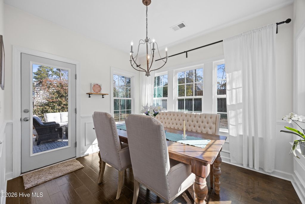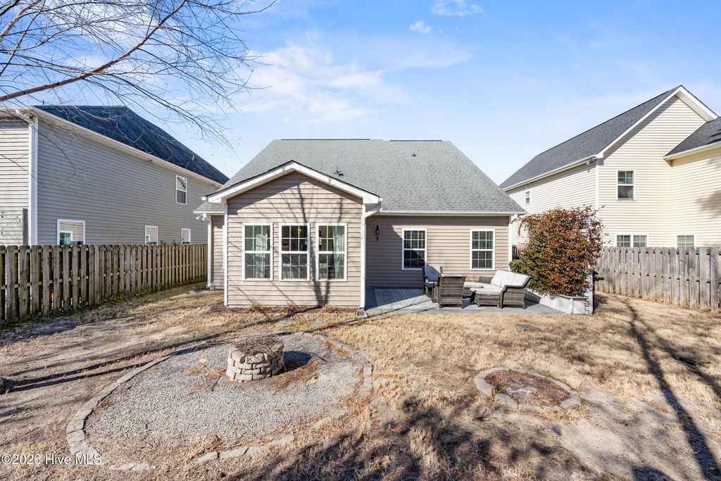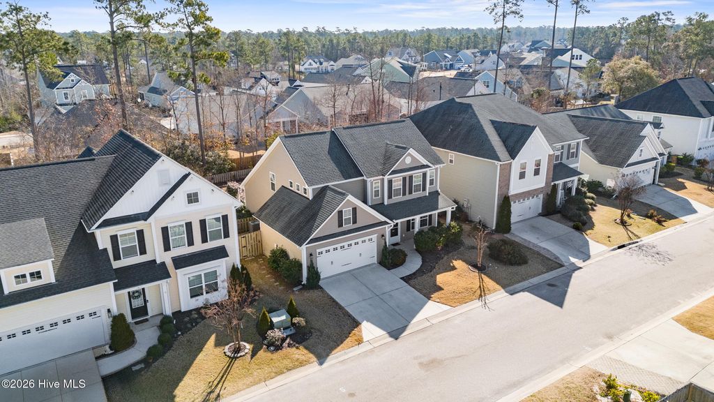 Welcome to easy living in the Villages of Olde Point, perfectly positioned in Hampstead's sought-after Topsail School District. With 2,451 square feet of space, this home offers 4 bedrooms, 2.5 bathrooms plus a bonus room. The main level features engineered hardwood floors and a spacious primary suite with a large walk-in closet and ensuite bathroom with a walk-in shower and dual vanities. The open-concept design connects the living room, dining area, and sunroom. The living room is anchored by a gas log fireplace and has built-in surround sound. The kitchen showcases crisp white cabinetry, granite countertops, a white brick-style backsplash, under-cabinet lighting, upgraded stainless appliances including a gas range, and an oversized pantry. A large eat-in bar provides the perfect spot for casual meals or morning coffee. Upstairs, you'll find three additional bedrooms plus a versatile office/bonus room that can easily adapt to your needs, whether that's a home office, playroom, or media space. A dedicated tech closet keeps everything organized and out of sight. Step outside to enjoy a beautifully maintained, fenced backyard with mature landscaping, flowering shrubs, and a private patio. Additional peace of mind comes with a transferable Choice Home Warranty in place through 2030. Conveniently located near golf, shopping, dining, boat ramps, the Intracoastal Waterway, and area beaches, this home is sure to impress.