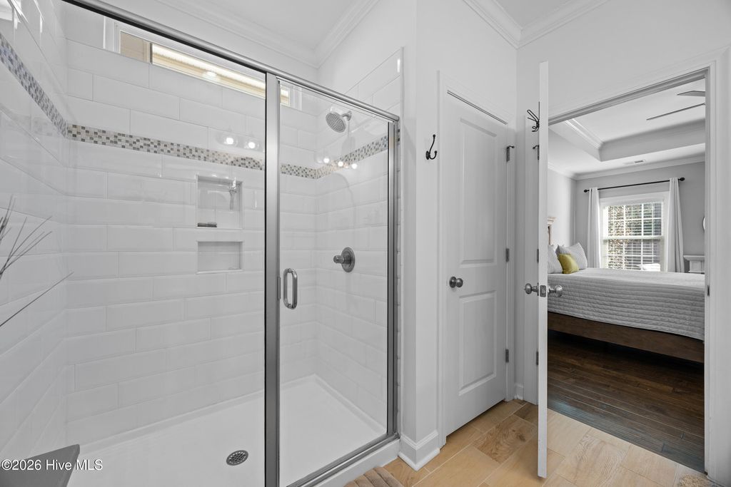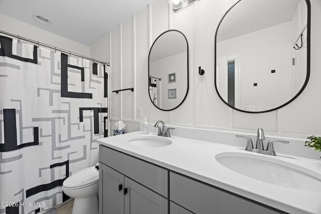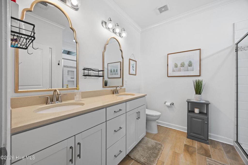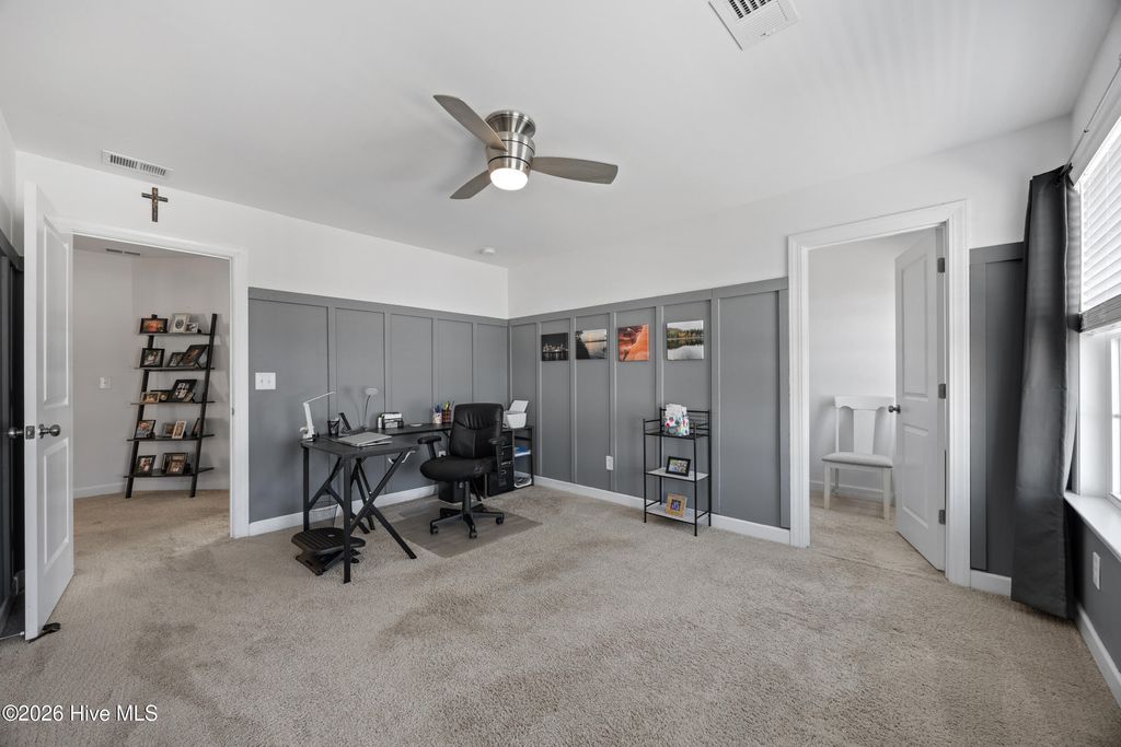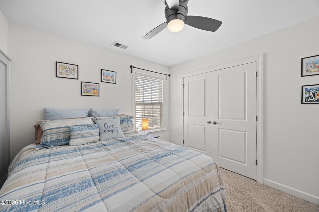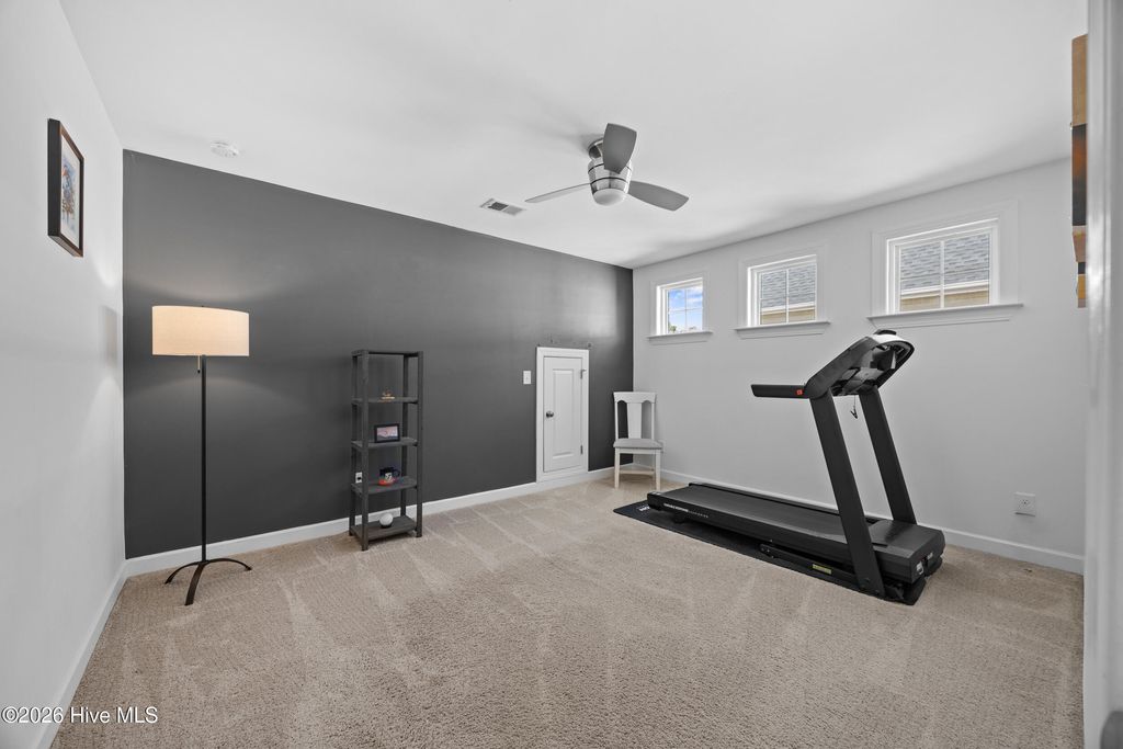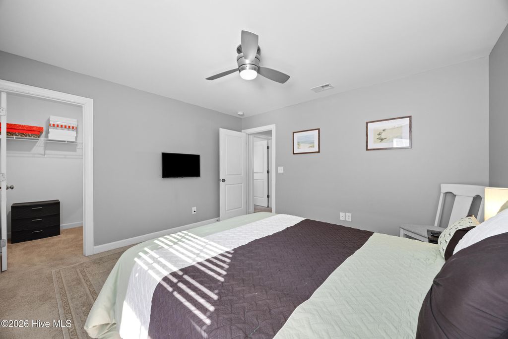 Welcome to easy living in the Villages of Olde Point, perfectly positioned in Hampstead's sought-after Topsail School District. With 2,451 square feet of space, this home offers 4 bedrooms, 2.5 bathrooms plus a bonus room. The main level features engineered hardwood floors and a spacious primary suite with a large walk-in closet and ensuite bathroom with a walk-in shower and dual vanities. The open-concept design connects the living room, dining area, and sunroom. The living room is anchored by a gas log fireplace and has built-in surround sound. The kitchen showcases crisp white cabinetry, granite countertops, a white brick-style backsplash, under-cabinet lighting, upgraded stainless appliances including a gas range, and an oversized pantry. A large eat-in bar provides the perfect spot for casual meals or morning coffee. Upstairs, you'll find three additional bedrooms plus a versatile office/bonus room that can easily adapt to your needs, whether that's a home office, playroom, or media space. A dedicated tech closet keeps everything organized and out of sight. Step outside to enjoy a beautifully maintained, fenced backyard with mature landscaping, flowering shrubs, and a private patio. Additional peace of mind comes with a transferable Choice Home Warranty in place through 2030. Conveniently located near golf, shopping, dining, boat ramps, the Intracoastal Waterway, and area beaches, this home is sure to impress.