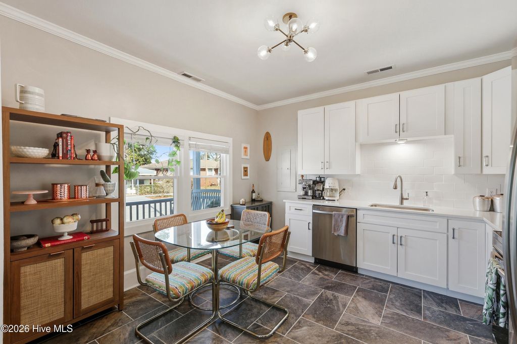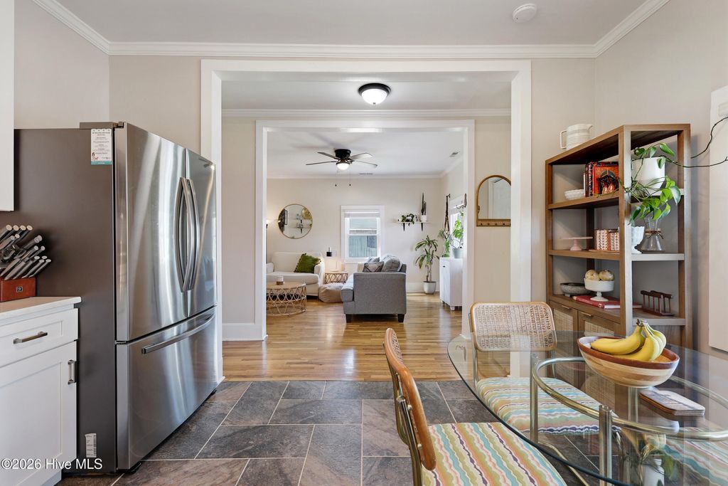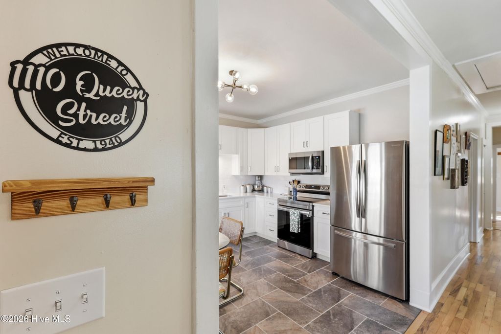 Welcome to 1110 Queen Street--a stunning downtown cottage that perfectly blends historic charm with modern, thoughtfully curated upgrades. The striking blue shake siding creates beautiful curb appeal, while the spacious covered front porch offers the perfect spot to relax and unwind. Inside, you're greeted by an abundance of natural light that highlights the open yet well-defined living spaces, creating an inviting and functional flow. You'll fall in love with the fully updated kitchen, featuring soft-close cabinetry, quartz countertops, a classic subway tile backsplash, and stainless steel appliances. Hardwood floors run throughout the living room and all three bedrooms, adding warmth and character. Both full bathrooms have been tastefully updated with stylish finishes and tile tub surrounds. Step outside to your backyard oasis, complete with a tall wooden privacy fence, a patio and newly installed sod--perfect for pets, gatherings, or quiet evenings outdoors. Located in the rapidly growing Cargo District, you'll love being just blocks from popular shopping, restaurants, coffee shops, and trendy nightlife. The home also includes its own off-street parking, a rare and valuable find for downtown living. This is the perfect opportunity to own a move-in-ready home in one of the city's most vibrant locations.