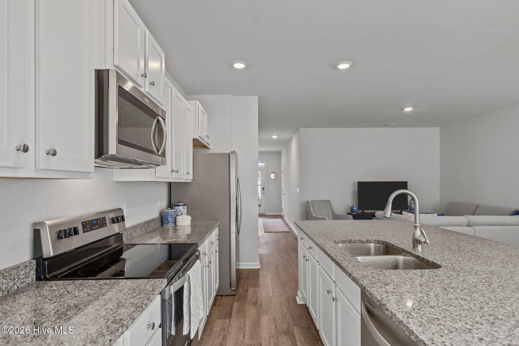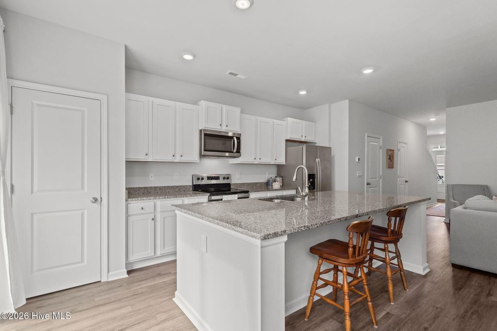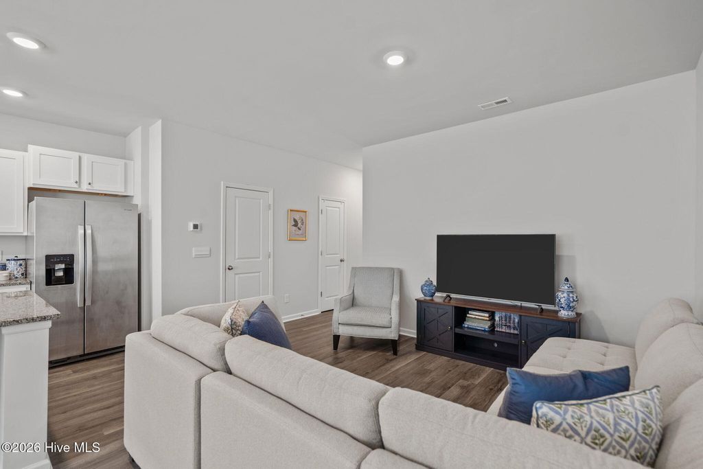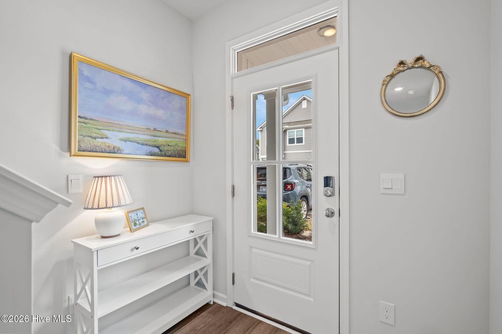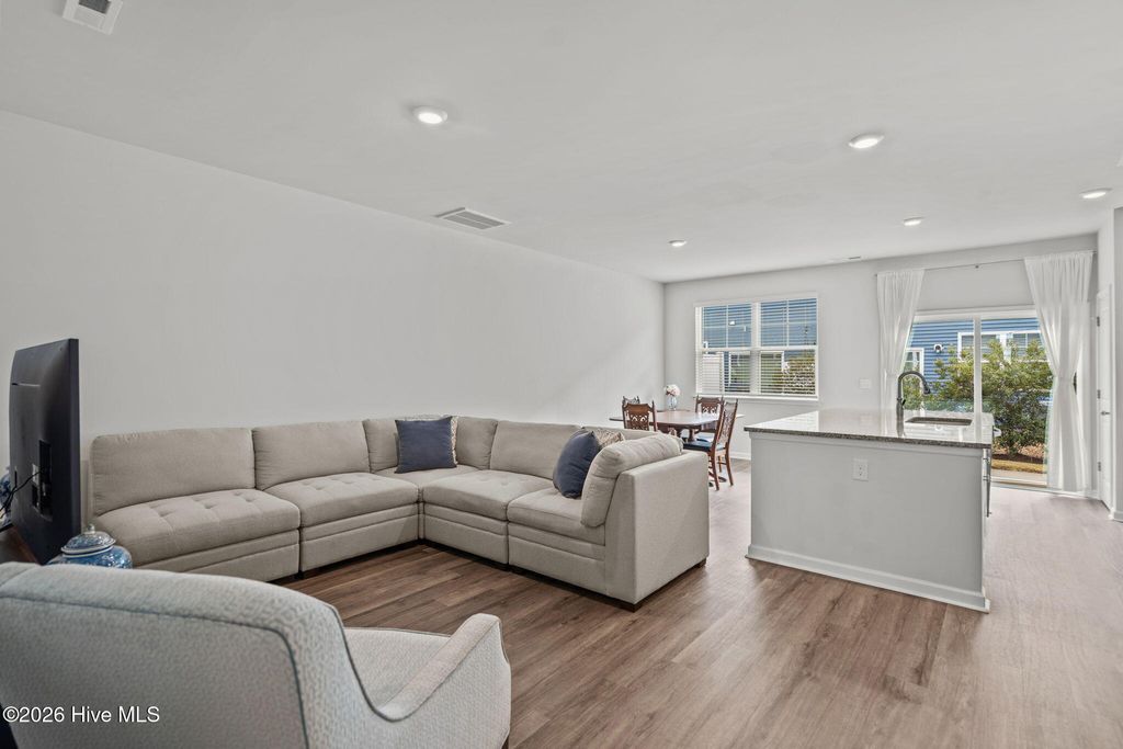 Low-maintenance living meets riverfront lifestyle in this 3-bedroom, 2.5-bath townhome in the Grand Bay community. With water access and a pool overlooking the Cape Fear River, this is coastal living designed to be easy. The main level offers a well-designed open floor plan that feels both functional and inviting. The kitchen anchors the space with an oversized island, quartz countertops, stainless steel appliances, and a pantry for extra storage. It flows seamlessly into the living and dining areas, making everyday living and entertaining feel effortless. Just off the main space, step outside to your private patio, perfect for quiet evenings or weekend grilling. A half bath, additional storage closet, and access to the one-car garage complete the first floor. Upstairs, the primary suite features cathedral ceilings, a spacious walk-in closet, and an en suite bath with a double vanity, walk-in shower, and linen closet. Two additional bedrooms, a full bath, a convenient laundry closet, and extra linen storage provide flexibility and function for guests, family, or a home office setup. Grand Bay residents enjoy resort-style amenities including a community pool overlooking the river, kayak launch and storage, and a riverfront boardwalk and gazebo - ideal for taking in the incredible sunsets. Conveniently located just minutes from Carolina Beach and a short drive to Downtown Wilmington and Wrightsville Beach, you'll have easy access to dining, shopping, groceries, and medical facilities while still enjoying a peaceful coastal setting.