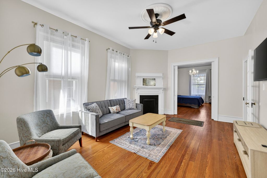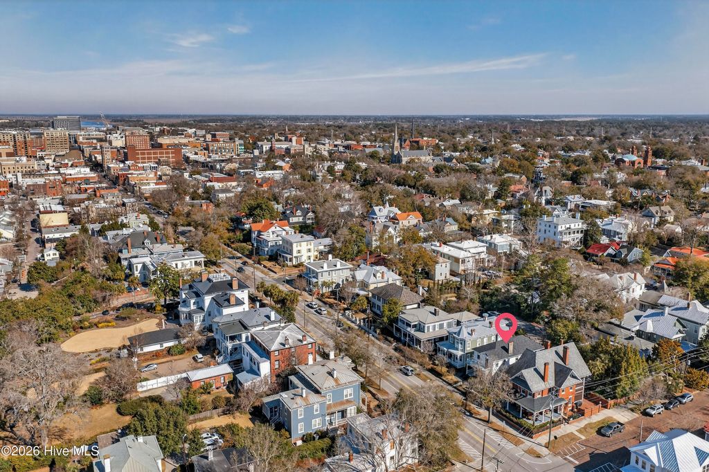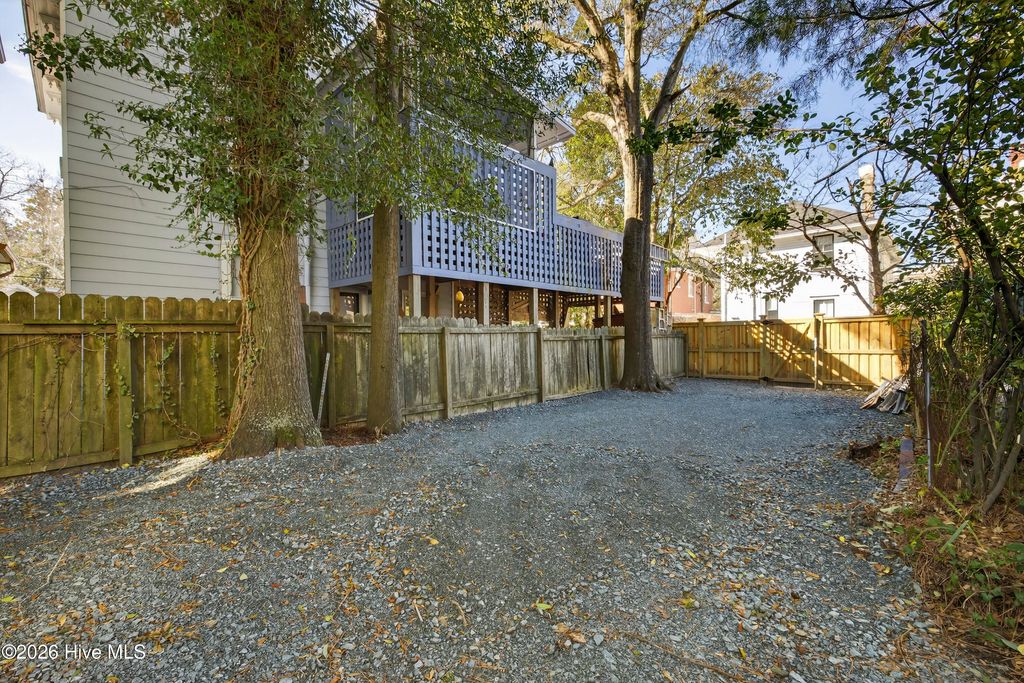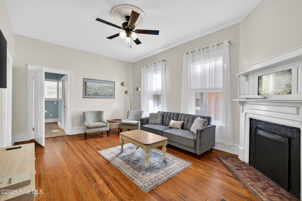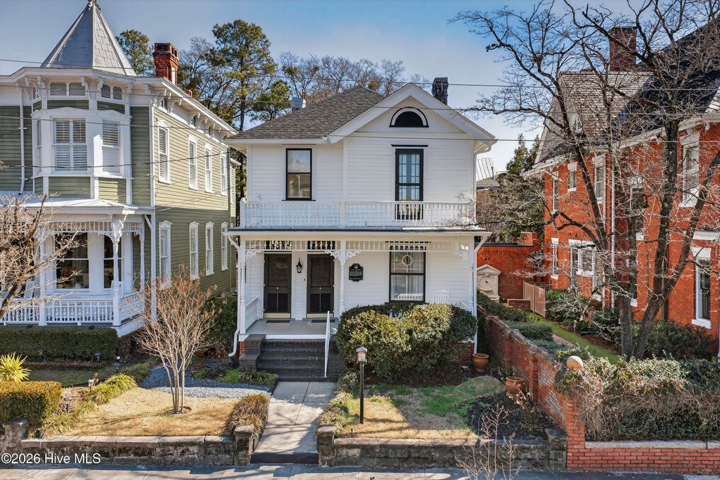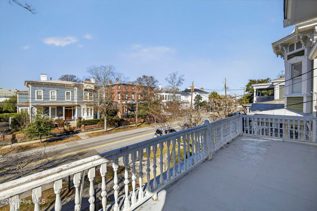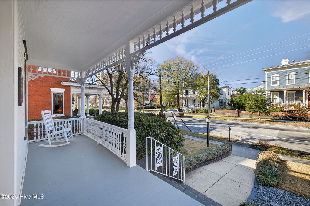 Stunning 120+ year old home in Historic downtown Wilmington being sold fully furnished! This home is currently split into 2 separate units however potential to be converted back to a single family home by opening up the entry hallway between them if desired. The old post previously used to tie up horses out front welcomes you to walk up to the covered rocking chair front porch where you can sit & watch the horse drawn carriage meander by. The inside of this well cared for home is filled with character and has been carefully maintained to keep the integrity of the historic charm. New roof was put on in 2024, most of the home has been re-wired, & the whole exterior has recently been painted. The upstairs unit has been updated with an on demand water heater. All appliances seen remain including the fridges, washers, & dryers. With natural gas hookups, both kitchens have gas stoves. Additional details throughout include hardwood flooring, high ceilings, & finished trim work. Spacious backyard with an extended paver patio, new decking, a newly installed privacy fence that has a tucked away treasure behind it - off street parking in back via alley access. Crawl space has been encapsulated & a dehumidifier installed, professionally done by ServPro. This home is conveniently nestled downtown within walking distance to many wonderful restaurants, coffee spots, & the historic USO building for community theatre shows. With all furnishings included, it's ready to go to generate air b&B or vrbo income.