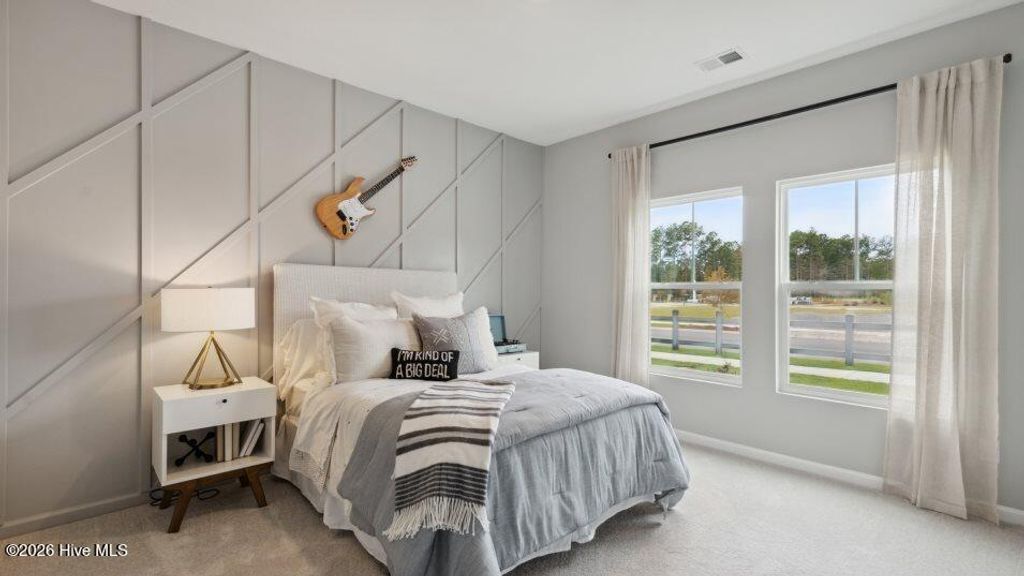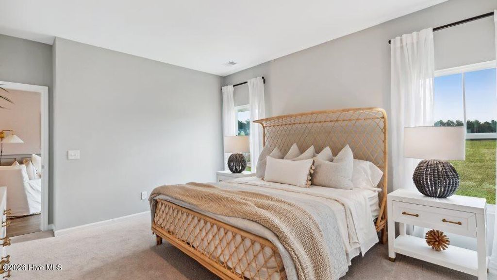 This single-story home features a foyer that opens to a combined kitchen, dining area and family room with sliding doors leading to the patio. The layout includes four bedrooms, offering flexible space for household members or guests. The owner's suite includes a private bedroom, attached bathroom and walk-in closet. A two-car garage provides additional storage and parking. Hunters Trace is a single-family home community located in Calabash, NC. The community offers estate-style homesites and is approximately 15 minutes from Sunset Beach. Conveniently located near shopping, dining, grocery stores, golf courses and medical facilities. Situated approximately two miles from Highway 17, providing access to North Myrtle Beach, SC and surrounding areas.