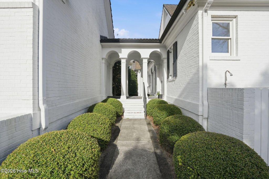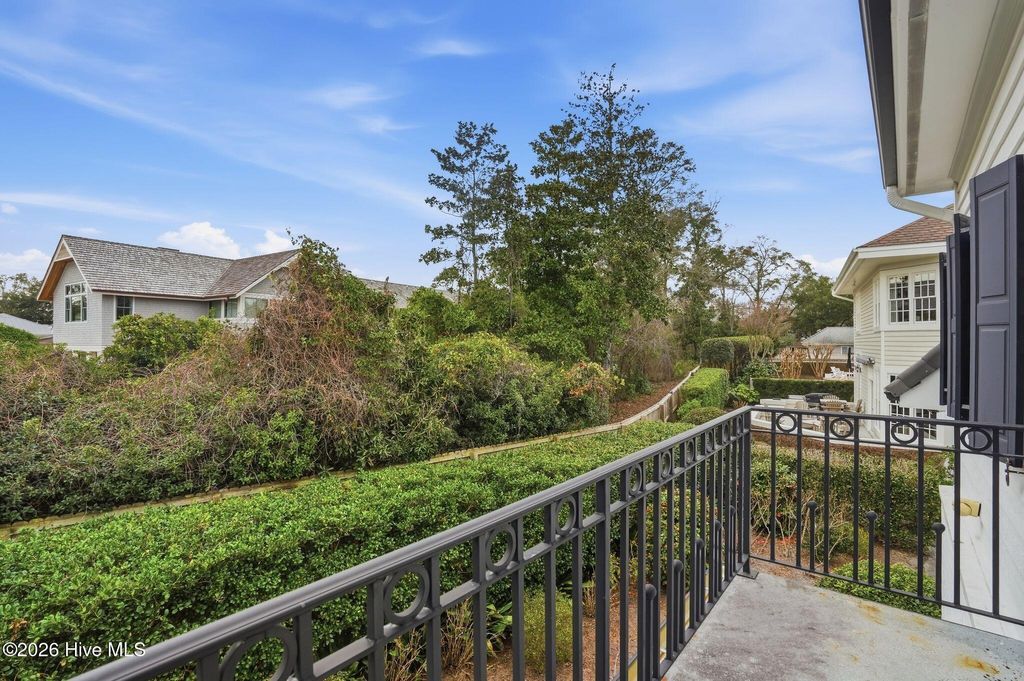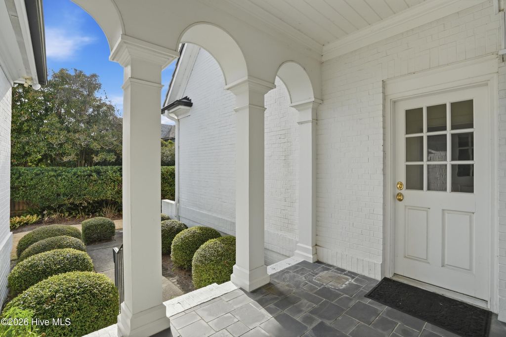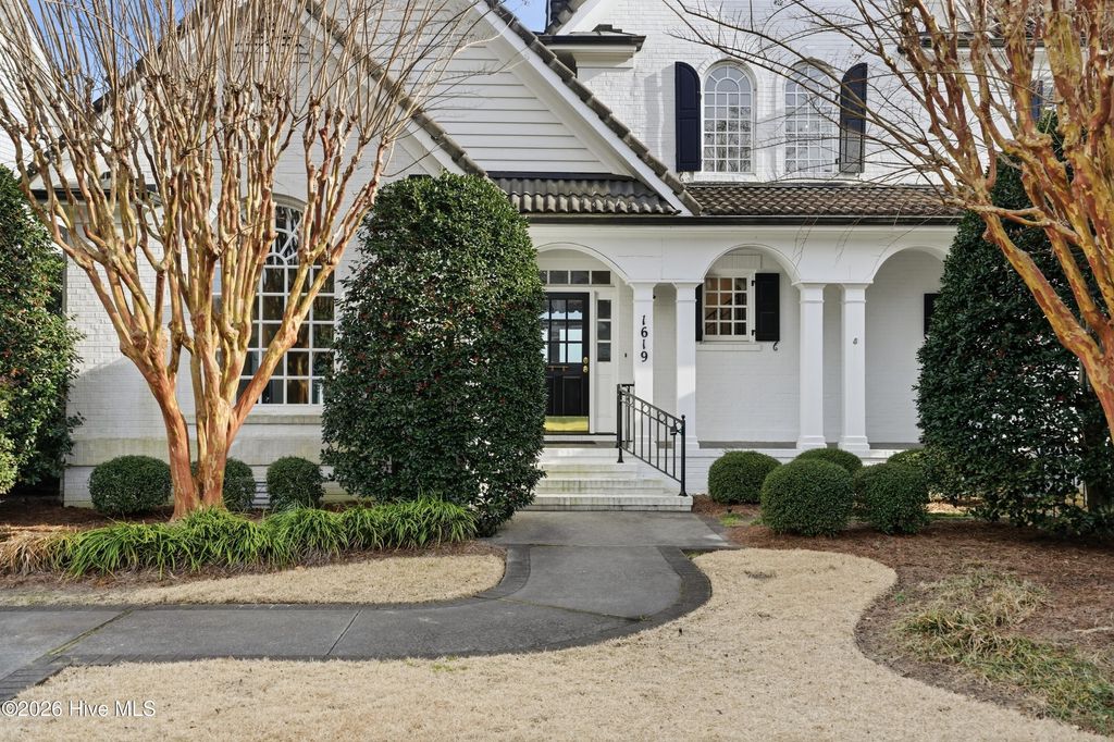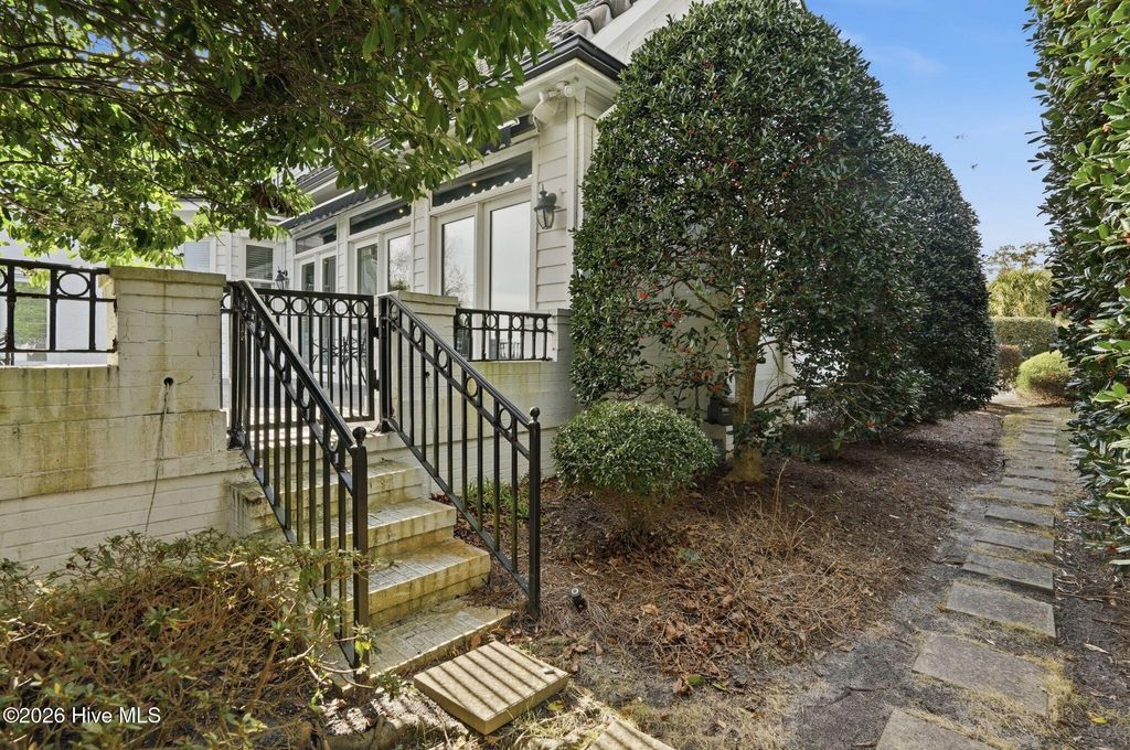 Experience timeless architecture and refined coastal living in this stunning brick residence located within the prestigious gated community of Landfall. Tucked into a lush, wooded setting with manicured gardens and Intracoastal views, this home offers approximately 3,100 sf, including a private (586sf) guest apartment above the detached garage ~ complete with full bath and kitchenette, ideal for extended stays or multigenerational living. Inside, cathedral ceilings with exposed beams create an unforgettable first impression in the main living areas. Rich hardwood flooring, custom millwork, and elegant formal living and dining rooms blend seamlessly with comfortable everyday spaces. The bright white kitchen features custom cabinetry and thoughtful built-ins. A gracious first-floor primary suite provides privacy and convenience, while expansive porches and terrace spaces invite effortless indoor-outdoor entertaining. Walls of windows frame the serene landscape, filling the home with natural light and Intracoastal views. Every detail reflects quality craftsmanship and distinctive European charm. Located just minutes from Wrightsville Beach, shopping and dining at Mayfaire Town Center, this exceptional property offers the perfect balance of luxury, lifestyle, and location!