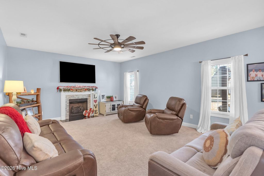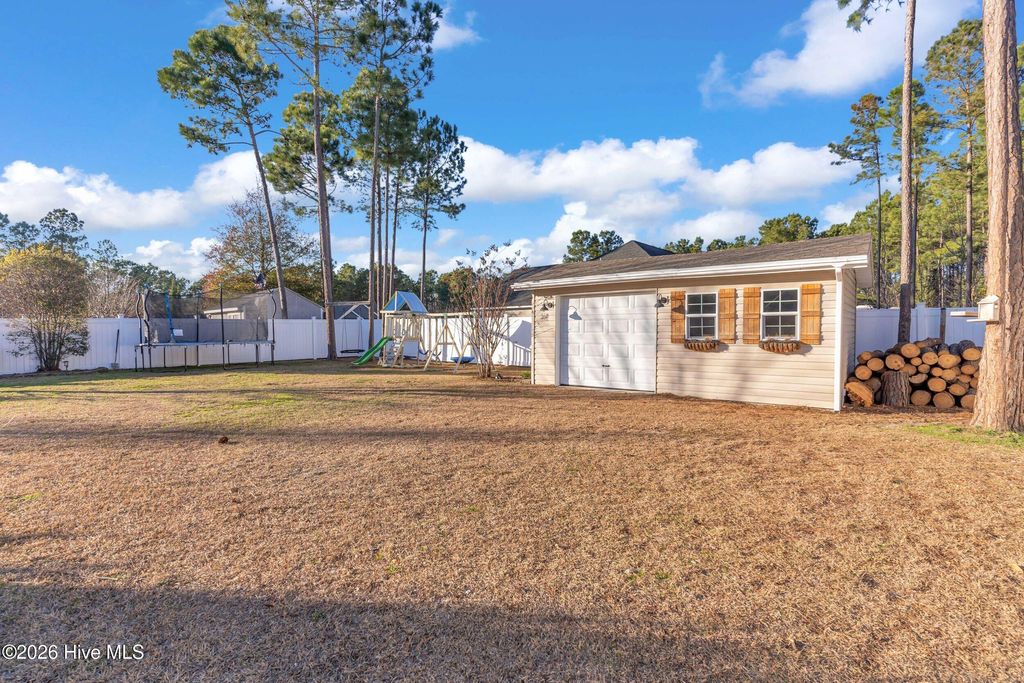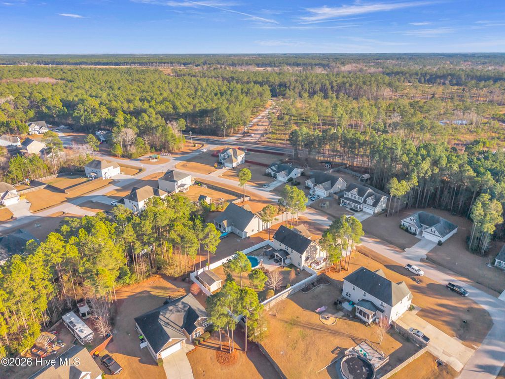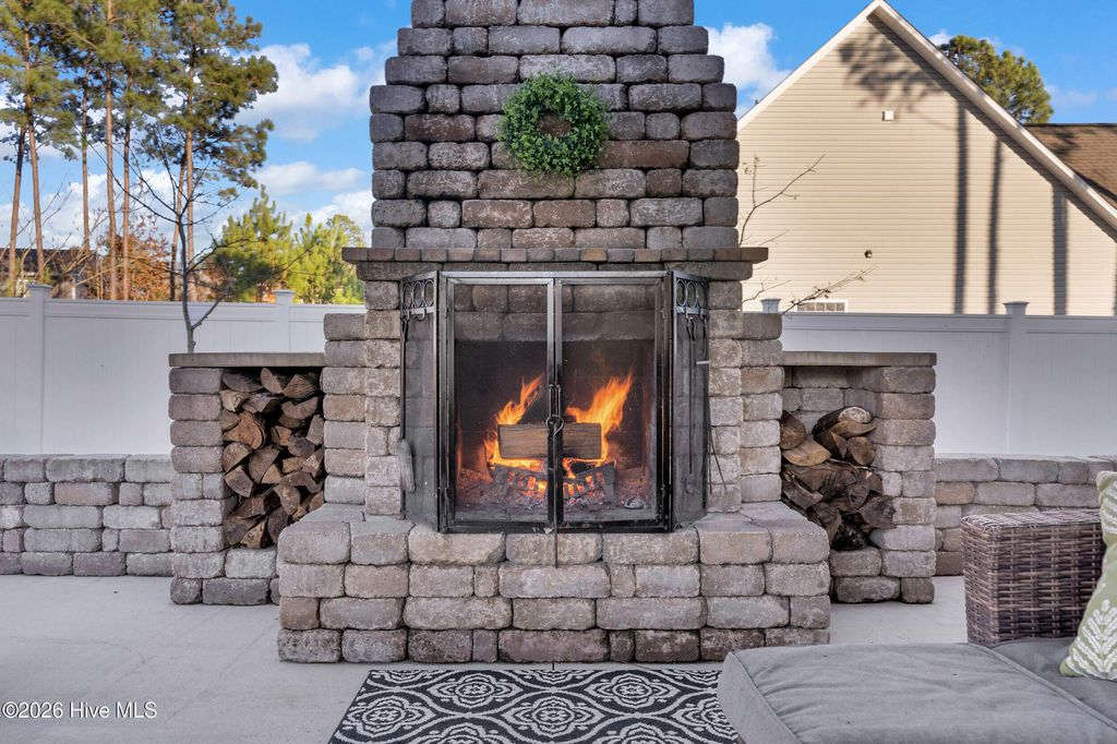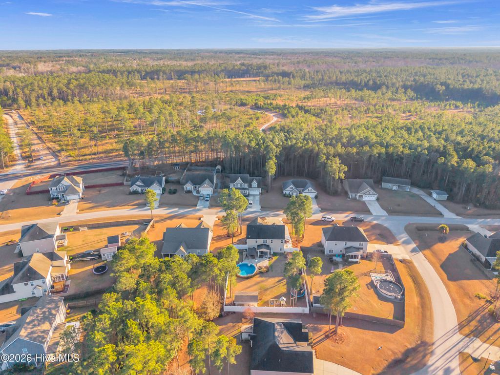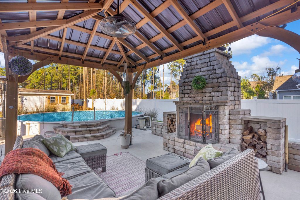 Welcome to a home defined by scale and presence from the moment you enter. A soaring 20-foot foyer creates an immediate sense of arrival and sets the tone for the thoughtful design carried throughout. Just off the entry, the formal dining room wrapped in classic wainscoting offers a refined space for hosting and gathering. The main living area is anchored by an expansive open-concept layout where the kitchen flows seamlessly into a substantial living room centered around a gas fireplace. Upstairs, all four bedrooms are thoughtfully positioned for privacy. The owner's suite delivers the retreat buyers are searching for - generous in size and complemented by a striking spa-style bath featuring a large tile shower, freestanding soaking tub, and elevated finishes. A spacious walk-in closet offers ample storage, plus additional attic storage tucked away for maximum usable living space. Three additional bedrooms are well-proportioned and share a beautifully finished hall bath with statement tile detail. The exterior was designed for lifestyle. The backyard offers room to spread out and entertain, enhanced by a new white vinyl privacy fence and a custom outdoor brick fireplace feature that anchors the space. The pool, complete with a new liner, is ready for summer. A shed hardwired with electricity provides versatility for storage, hobbies, or workshop use. Established landscaping and intentional plantings thrive in their placement. Additional features include a large front porch ideal for rocking chairs, a three-car driveway, and tall-ceiling garage. Located in a community with a low HOA, this property delivers neighborhood structure without excessive restrictions. Positioned just 10 minutes to Hampstead and 15 minutes to Wilmington, the location offers accessibility while maintaining a sense of privacy.
