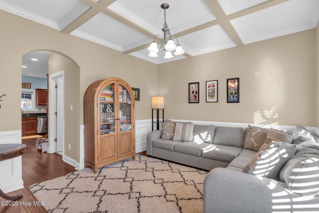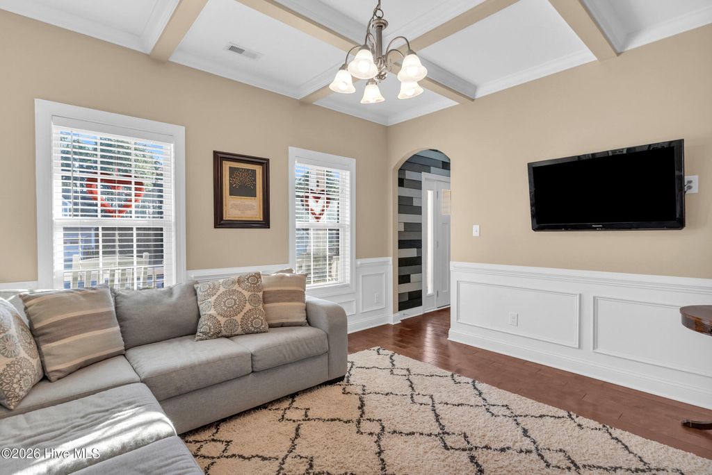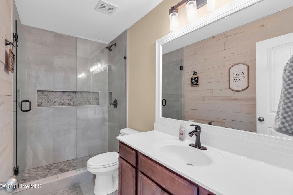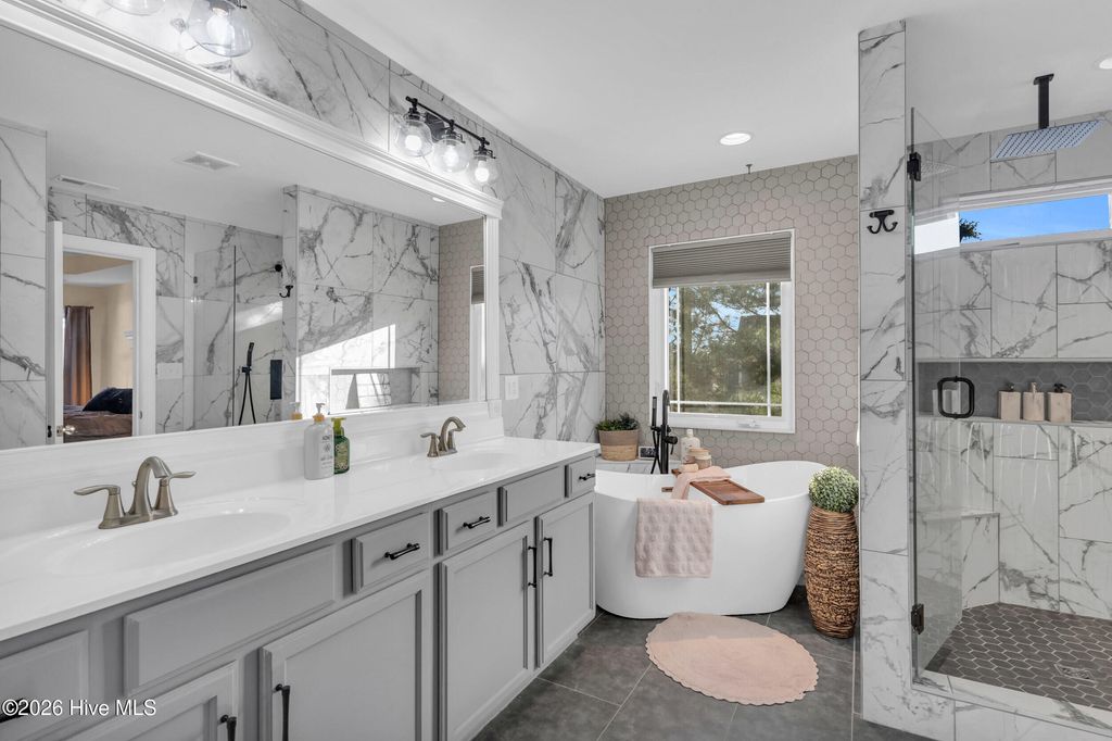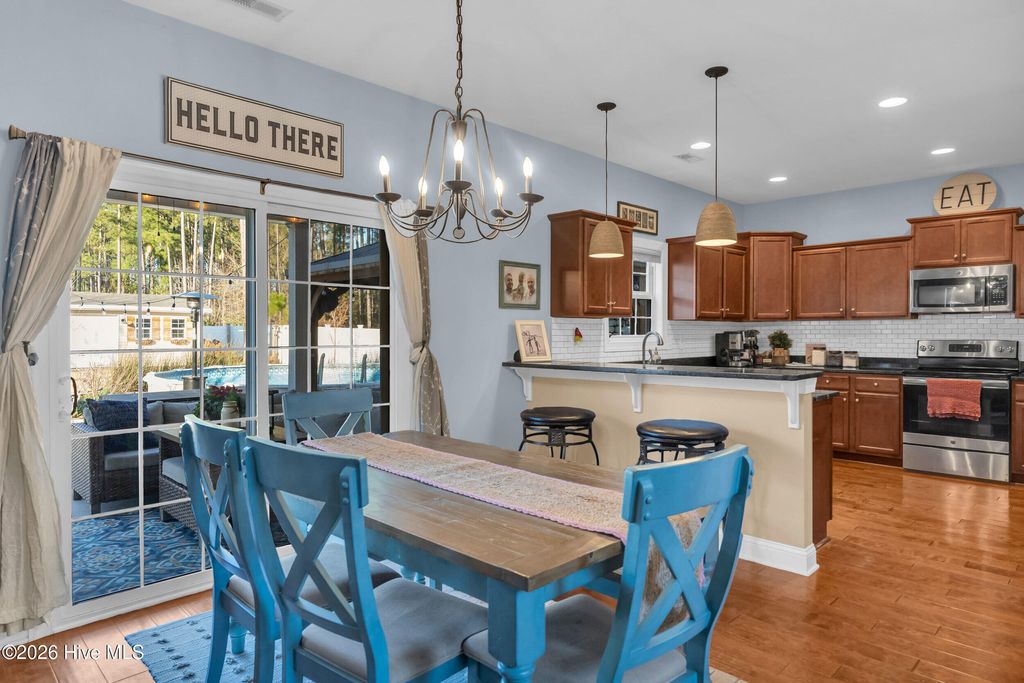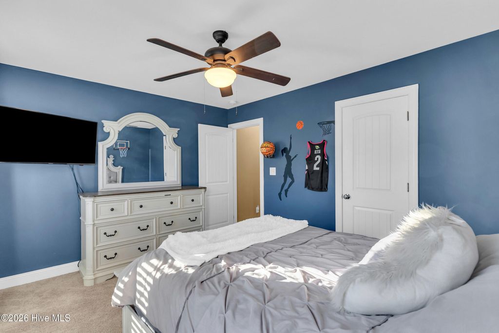 Welcome to a home defined by scale and presence from the moment you enter. A soaring 20-foot foyer creates an immediate sense of arrival and sets the tone for the thoughtful design carried throughout. Just off the entry, the formal dining room wrapped in classic wainscoting offers a refined space for hosting and gathering. The main living area is anchored by an expansive open-concept layout where the kitchen flows seamlessly into a substantial living room centered around a gas fireplace. Upstairs, all four bedrooms are thoughtfully positioned for privacy. The owner's suite delivers the retreat buyers are searching for - generous in size and complemented by a striking spa-style bath featuring a large tile shower, freestanding soaking tub, and elevated finishes. A spacious walk-in closet offers ample storage, plus additional attic storage tucked away for maximum usable living space. Three additional bedrooms are well-proportioned and share a beautifully finished hall bath with statement tile detail. The exterior was designed for lifestyle. The backyard offers room to spread out and entertain, enhanced by a new white vinyl privacy fence and a custom outdoor brick fireplace feature that anchors the space. The pool, complete with a new liner, is ready for summer. A shed hardwired with electricity provides versatility for storage, hobbies, or workshop use. Established landscaping and intentional plantings thrive in their placement. Additional features include a large front porch ideal for rocking chairs, a three-car driveway, and tall-ceiling garage. Located in a community with a low HOA, this property delivers neighborhood structure without excessive restrictions. Positioned just 10 minutes to Hampstead and 15 minutes to Wilmington, the location offers accessibility while maintaining a sense of privacy.