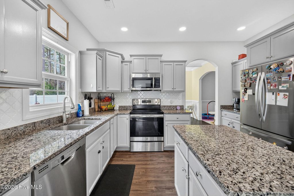 Located in the desirable Reserve at Island Creek in Rocky Point and zoned for the highly sought-after Topsail School District, this beautifully cared-for home sits on a generous .44-acre corner lot. Built in 2018, this 4-bedroom, 2.5-bath residence offers the perfect mix of space and style. A covered front porch greets you upon arrival. Inside, a two-story foyer creates a welcoming first impression. The layout flows effortlessly, featuring a living room that connects to the kitchen area. A formal dining room just off the kitchen provides an intentional space for meals. The kitchen serves as the centerpiece of the home, complete with modern appliances, abundant cabinetry, and a large center island. It overlooks the comfortable family room, with a gas fireplace, for everyday living and entertaining. Step outside to enjoy the backyard, fully enclosed with a privacy fence for added seclusion. The covered rear porch offers a great setting for outdoor dining, entertaining, or simply unwinding at the end of the day. With its prime location, spacious lot, and well-designed floor plan, this Rocky Point home combines convenience, comfort, and timeless appeal. It boasts a brand-new refrigerator, washer & dryer, and generator. Schedule your showing today and see all it has to offer!