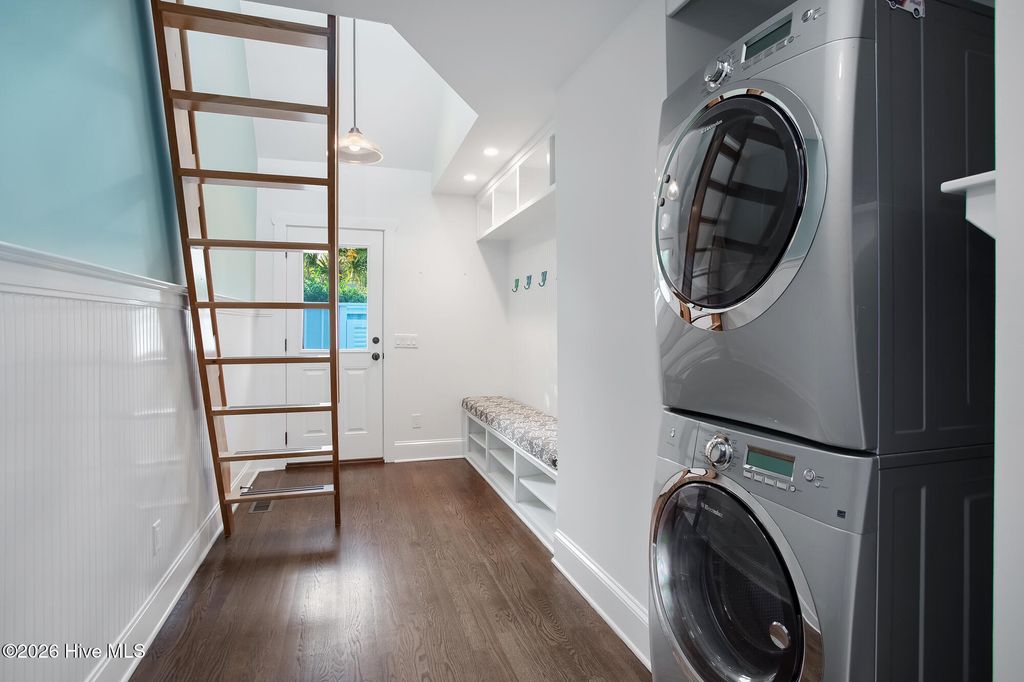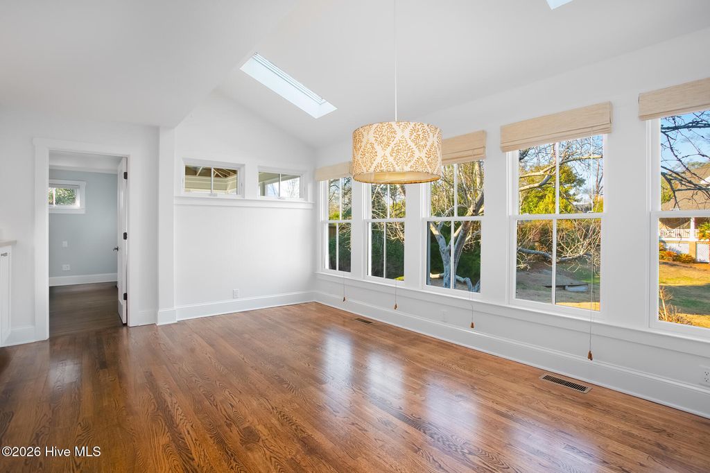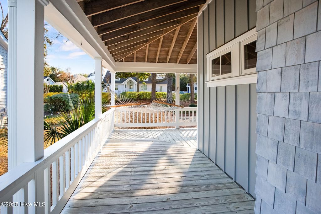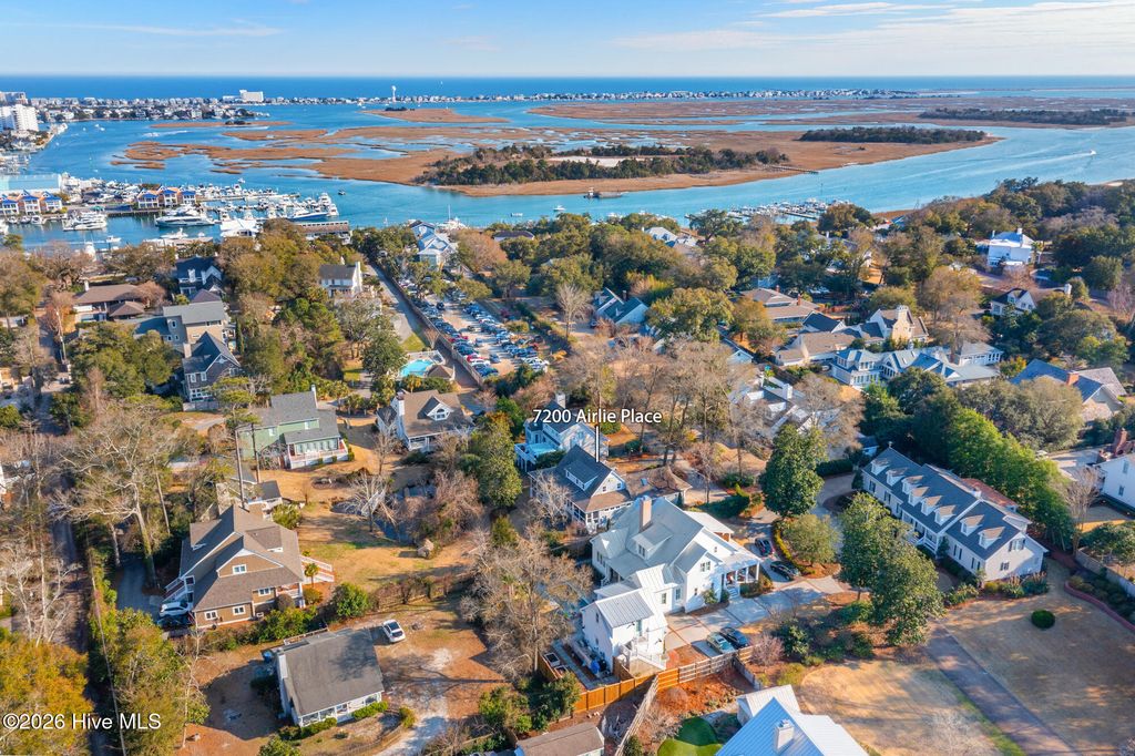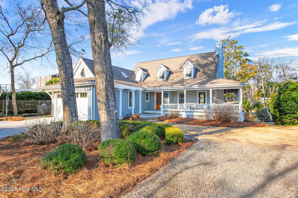 Located in Airlie Place just off iconic Airlie Road, this charming coastal residence offers the rare opportunity to live within walking distance from sound side restaurants, nearby marinas, and other conveniences, all within the highly desirable Wrightsville Beach Elementary School district. Airlie Place is an intimate nine-home enclave featuring a community pool and tranquil natural pond with fountain aeration. This completely reimagined low country coastal cottage was substantially remodeled in 2010 by respected local craftsman Ralph Konrady, and blends timeless coastal character with thoughtful modern updates. Renovations include hurricane-rated impact windows and doors, new wiring, plumbing and siding, creating a residence that is both beautiful and highly functional. The light infused living area opens through French doors to a spacious screened porch with exposed rafters and vaulted ceiling, providing a grand outdoor living space. The kitchen is warm and inviting, featuring granite countertops, stainless appliance package with a gas range, farmhouse sink, and abundant custom cabinetry. Hardwood flooring flows throughout the entire home, enhancing the coastal aesthetic. The primary suite located on the main level offers a modern ensuite bath, transom windows, and access to a private screened porch retreat where soothing sounds and peaceful views of the community pond can be enjoyed. Clever built-in features add a high level of practical functionality, including a home office nook near the kitchen creating a convenient backpack and shoe drop zone adjacent to the laundry. A nautical ship's ladder leads to approximately 150 square feet of additional interior space not included in the reported heated square footage, ideal for a playroom, office, or storage area. Additional amenities include a spacious two-car garage, and outdoor shower. Boatslip lease/purchase options possible in the marina district just a short walk away.