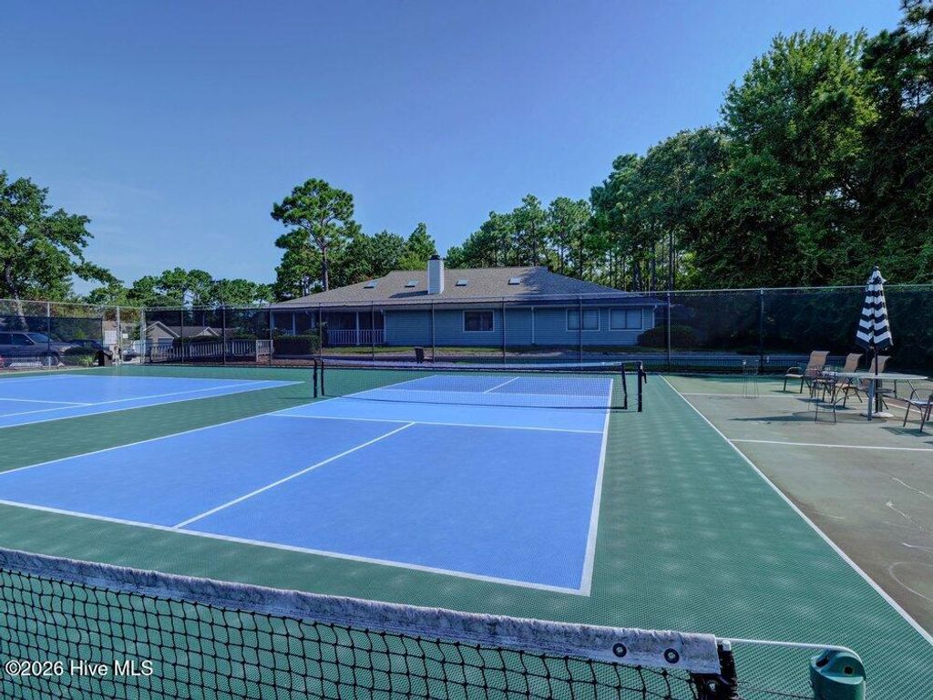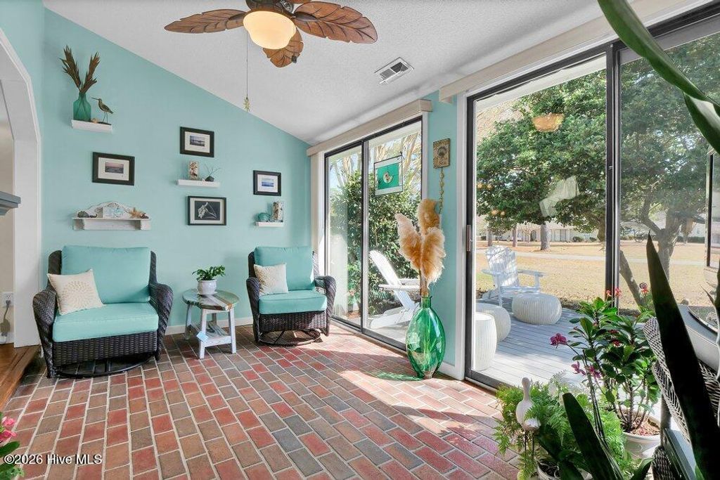 Sunny and bright townhome just minutes from Wrightsville Beach offering a wonderful blend of comfort, style, and coastal convenience. An inviting fenced brick courtyard patio welcomes you into this charming home featuring a casual open floor plan and a dramatic living room with soaring ceilings and skylights that fill the space with natural light (skylights and roof replaced in 2025). The living area showcases attractive bamboo flooring and a striking fireplace with classic brick surround and traditional mantle. Also you will note the crisp white moldings added throughout the home. The beautifully remodeled kitchen is sure to impress with rich wood cabinetry featuring soft-close drawers, two Lazy Susans and pull-out shelving, stainless appliances including a smooth-top double oven range, quartz countertops, tile backsplash, and tile flooring. A casual dining area open from the kitchen and flows into living areas which include a heated and cooled sunroom with charming brick flooring--an ideal space to relax with a good book while overlooking the peaceful rear yard and park-like setting with walking trail. The spacious primary suite offers a beautifully renovated bath with oversized tile shower, frameless glass enclosure, granite vanity, and tile flooring. Bedroom two overlooks the courtyard and has access to a full bath with shower, granite vanity, and tile floor. Bedroom three is currently utilized as an office and gym with tile flooring. Lighting fixtures, ceiling fans, and plumbing fixtures have been updated throughout. Additional highlights include a two-car garage and access to exceptional community amenities including a pool, clubhouse, tennis and pickleball courts, walking trails, and optional boat/RV storage (fee and availability apply). Golf enthusiasts will appreciate the nearby Inland Greens Municipal Golf Course, while outdoor lovers can easily access the Gary Shell Cross-City Trail for biking or walking all the way to the beach. Townhome exteriors are currently being freshly painted. A fantastic opportunity for a primary residence or the perfect coastal getaway close to beaches, shopping, dining, and everything Wilmington has to offer. Convenient access to I-40 and Market street to Historic downtown Wilmington