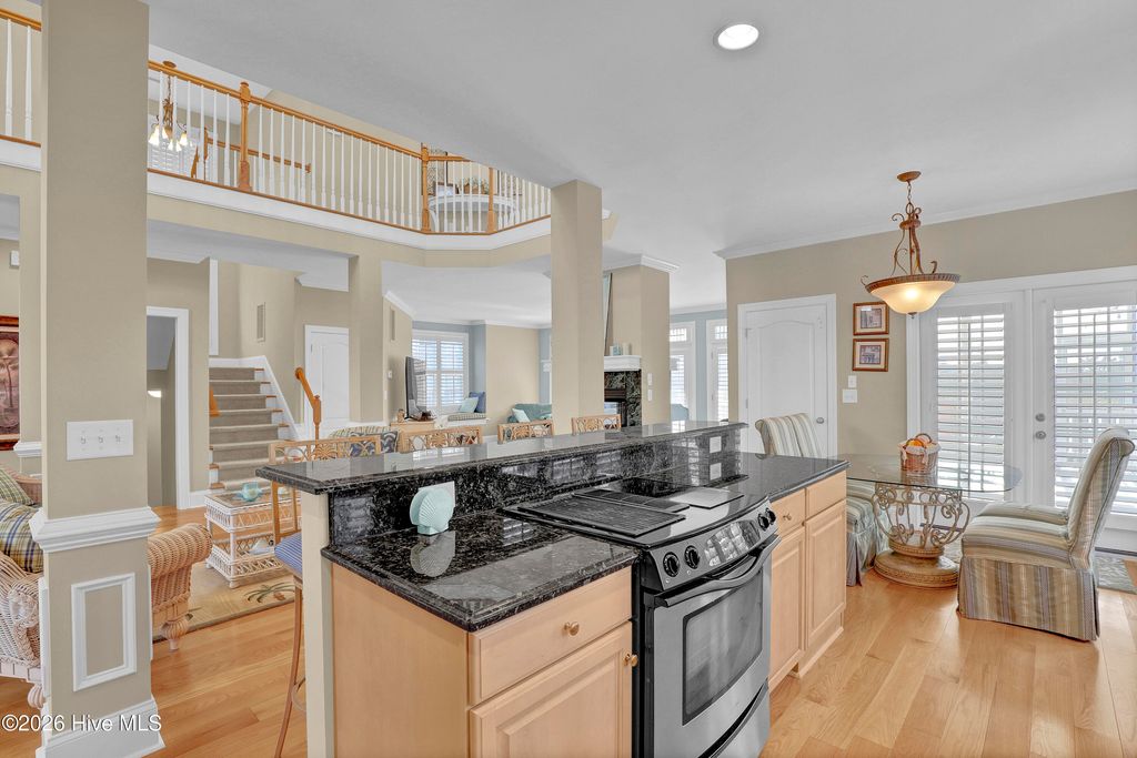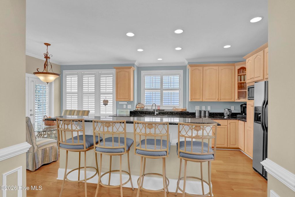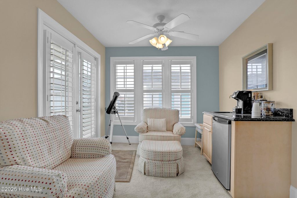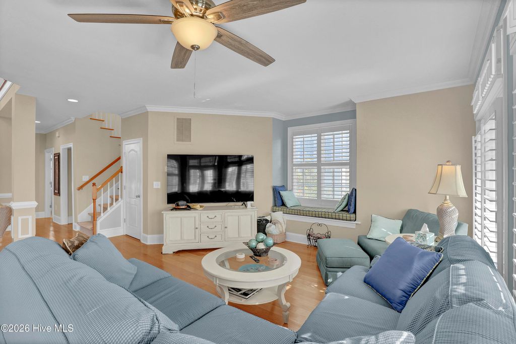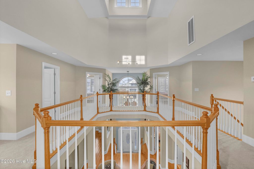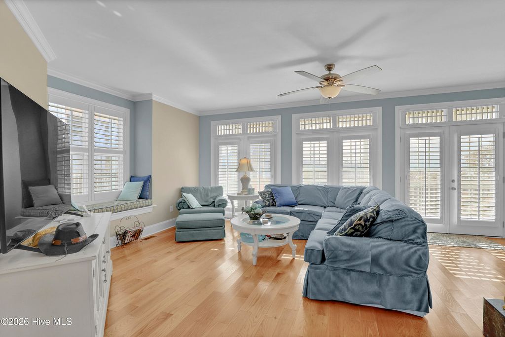 Stunning sound views and spectacular sunsets from this beautiful custom home in the highly sought after community of Sandy Ridge in Surf City. The home's features include an elegant foyer leading up to the open great room with soaring ceilings. The wide open space is illuminated by the crow's nest of windows flooding both floors with natural light, creating a grand 2 story living space. The 2nd story catwalk view of both floors is punctuated with a cozy sitting area. Throughout the elegant and charming interior are walls of windows with custom plantation shutters, timeless oak hardwood floors, and panoramic water views from the two expansive sound side decks. Updates in the past several years include new roof, new interior paint throughout, new hardwood floors, carpet and renovated master bath. The elevator provides easy access to all three levels. The ground floor boasts a double enclosed garage, ideal for storage and parking. The home has never been rented, lovingly maintained and professionally decorated. Beach access is just steps from the door, and Sandy Ridge has no HOA dues. This unique Topsail Island beach home in a conveniently located residential setting with easy beach access can become your dream home, family getaway or investment property.