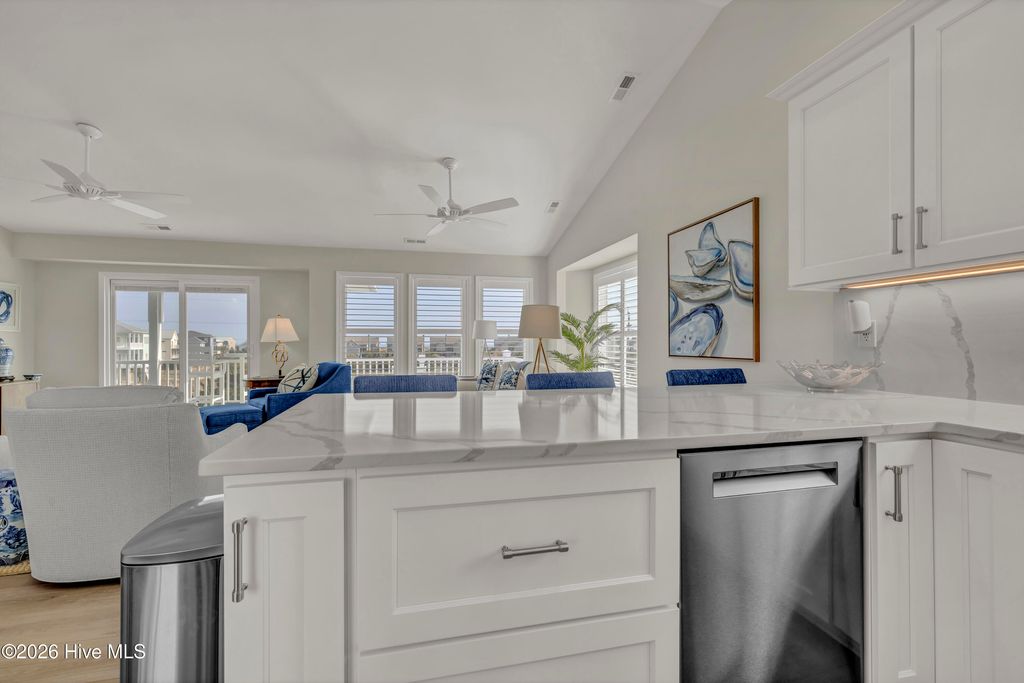 Stunning, newly remodeled beach home located in the coveted and tranquil south end of Topsail Beach. This elegantly upgraded 4-bedroom, 3-bathroom beach paradise has magnificent sunrise views over the ocean and spectacular sunsets over Banks Channel. Fully updated kitchen with beautiful quartz countertops, and large peninsula, all new sliding doors with built-in blinds, brand new luxury vinyl plank floors, all new appliances including tankless water heater, remodeled bathrooms and new elegant, custom furnishings. With beautifully upgraded landscaping and new irrigation system, this home has barely been occupied since the renovations with flawless interiors! Both HVAC units were replaced in 2021 and the roof was replaced in 2018. Just a 5-minute stroll to the nearest beach access at the serene southern end of the island, you'll enjoy one of the most private and peaceful stretches of sand. Savor the most beautiful piece of Topsail Island as you walk the loop from this house around the inlet back to the ocean side. All furnishings convey except for a small exclusion list.