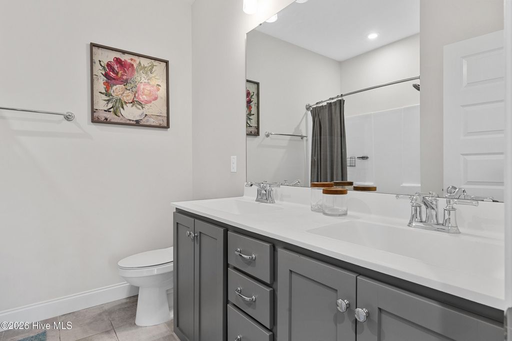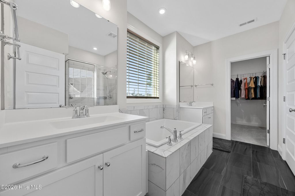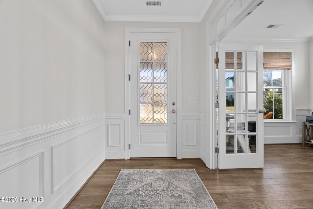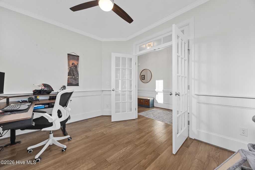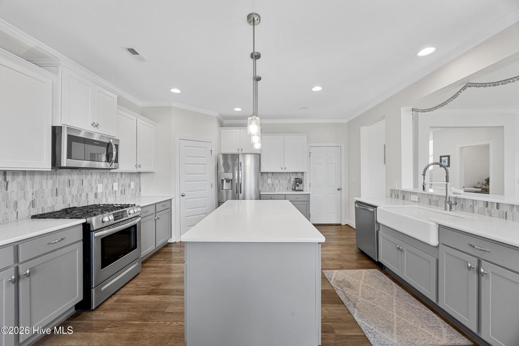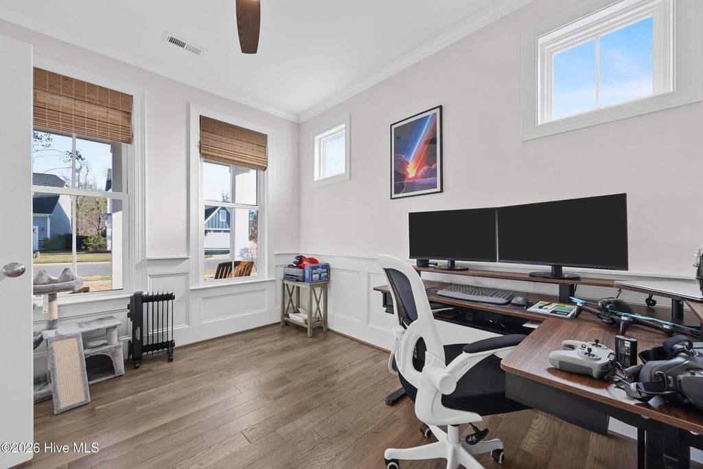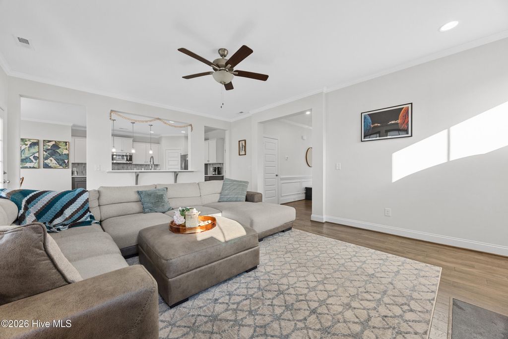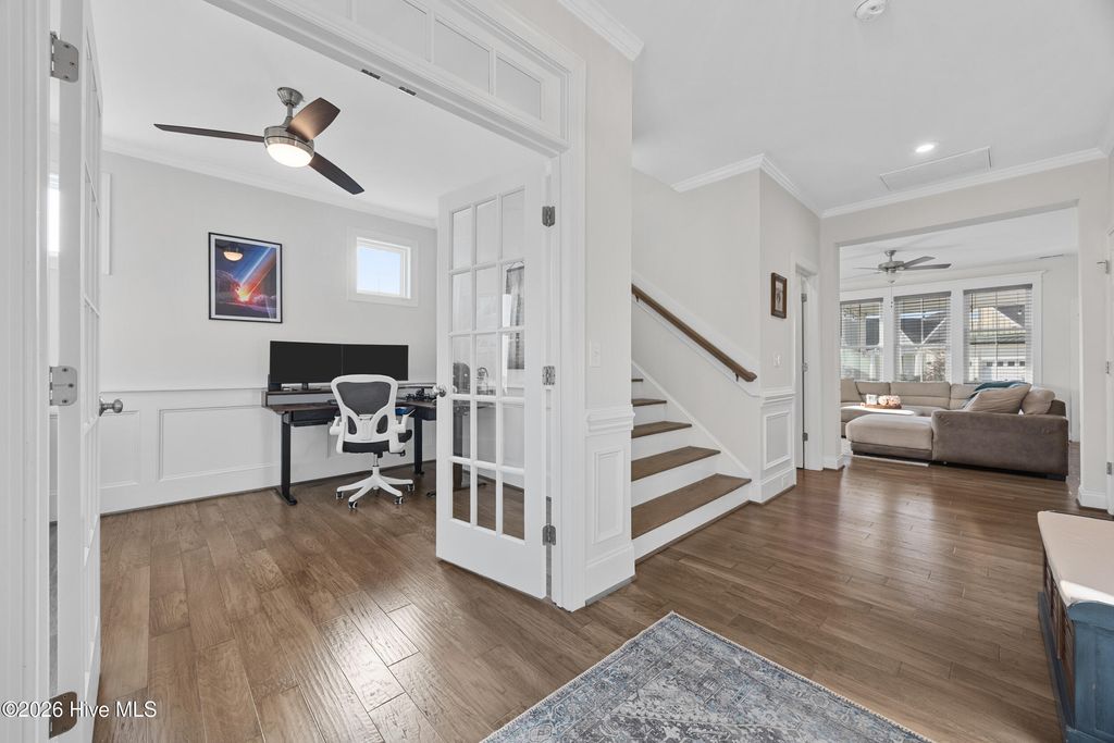 Welcome to 812 W. Craftsman Way, where thoughtful design meets relaxed coastal living. This bright and spacious home offers four second-floor bedrooms, a first-floor office or flex room with French doors, and a fully finished third floor complete with a full bath and storage--ideal as a media room, guest retreat, or fifth bedroom. The main living area feels warm and inviting, anchored by a well-appointed kitchen featuring an apron-front sink, a large prep island, and a walk-in pantry--perfect for everyday living and entertaining. Upstairs, the primary suite offers a spa-like escape with a walk-in hand-tiled shower, separate garden tub, dual vanities, and a generous walk-in closet. Three additional bedrooms, each with walk-in closets, share a full bath with dual vanities, and a conveniently located laundry room completes the second floor. Designed for both comfort and functionality, this home provides ample space to live, work, and unwind. Start your mornings on the fully screened back porch overlooking the fenced backyard with mature landscaping, or relax on the front porch in the evening and take in the sunset. Located within walking distance to neighborhood amenities and in the highly sought-after Topsail School District, this home offers the perfect blend of lifestyle and location.