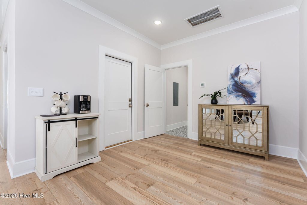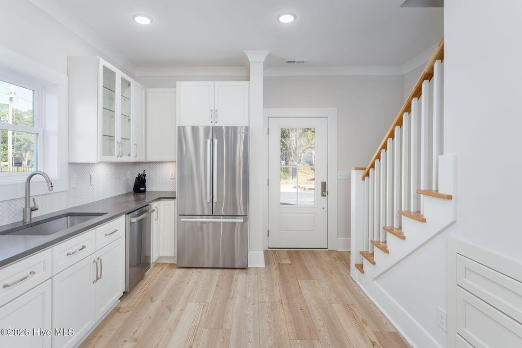 New Townhome near Wrightsville Beach. Seagate Place is a luxury coastal living community 5 minutes to Wrightsville Beach with remarkable floor plans designed for dynamic living spaces. The natural gas community townhomes are 2528 Square Feet with four or five bedroom and four and a half bedrooms. These units feature a blended coastal and modern style. The clean and bright walls feature sherwin Williams elder white paint color which adds a lightness to every room. Craftsman style white trim and doors throughout. Cove crown on the first floor. Porcelain and ceramic tiles in the bathrooms and laundry area. A wide open kitchen layout with solid hardwood cabinets and metro quartz countertops. Bosch stainless steel appliances including a 36'' gas range with a matching chimney hood above. A peninsula built in GE microwave for maximum countertop space and 21 cubic feet of counter depth refrigerator with French doors and freezer below. A Monessen gas fireplace and mantle in the living room. Satin nickel and brushed brass fixtures and hardware throughout including the innovative and reliable plumbing fixtures by Moen.