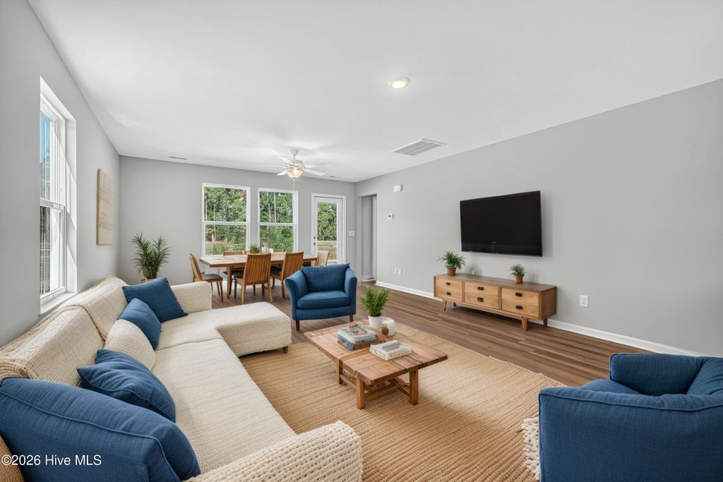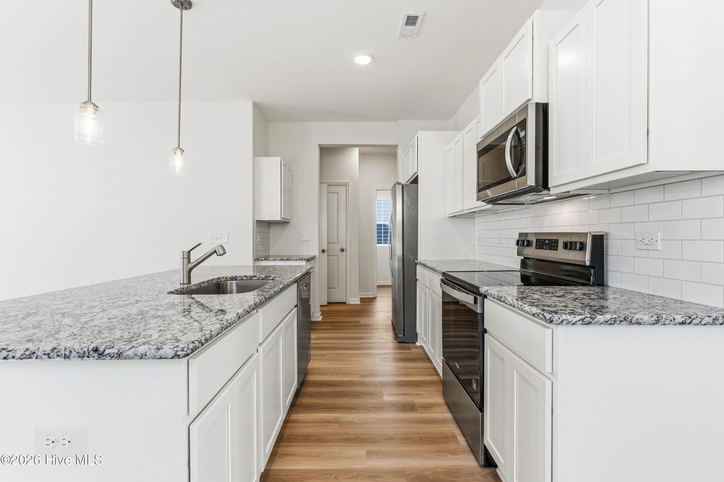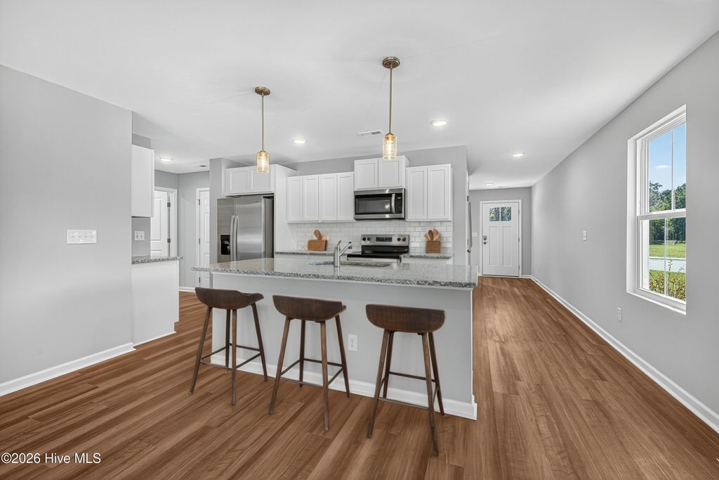 This beautifully designed Honeybird floor plan with charming Coastal elevation offers the perfect blend of style, comfort and thoughtful upgrades. Featuring 9 foot ceilings and a finished bonus room, this home provides flexible living space ideal for a home office, guest retreat or media room. The primary suite is conveniently located on the first floor, creating easy everyday living and added privacy. The kitchen is the heart of the home with 36 inch upper white shaker cabinets, granite countertops and stainless steel appliances. Elegant pendant lighting adds warmth and character while the open layout flows seamlessly into the main living areas. Bathrooms feature quartz countertops and comfort height toilets for both style and convenience. The Cottage trim package throughout the home enhances window jambs and cased openings, adding architectural detail and a polished finish. Enjoy premier landscaping with irrigation in the front, sides and backyard, making maintenance simple while keeping your lawn lush year round. Exterior flood lights at the front and rear provide added security and peace of mind. Located in the desirable Brookfield Branch community, this home offers timeless design, modern upgrades and exceptional value in Hampstead. Schedule your private tour today.
