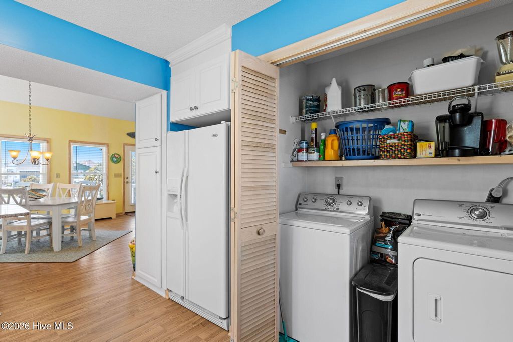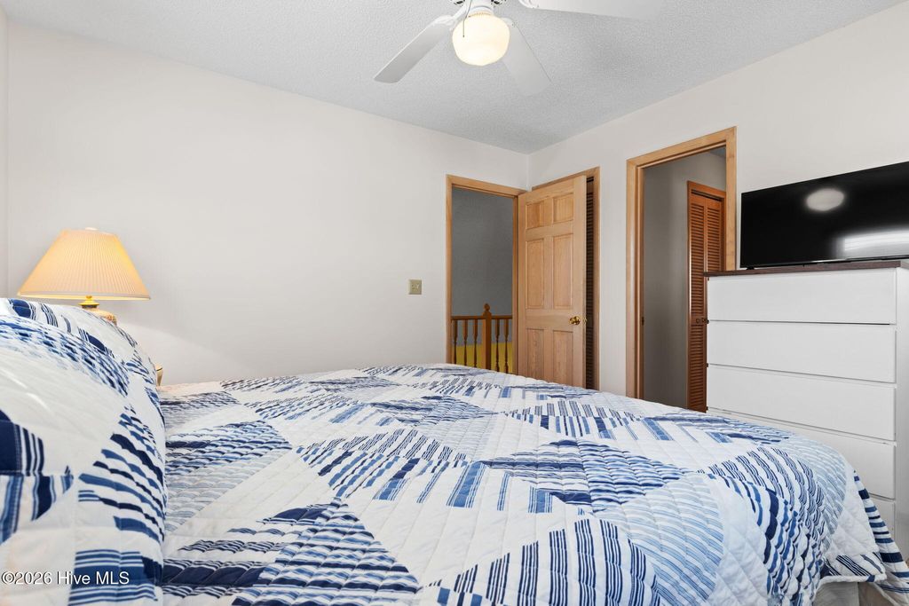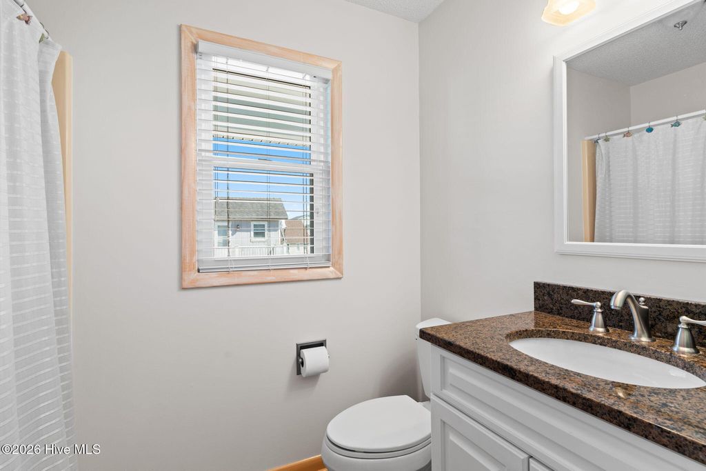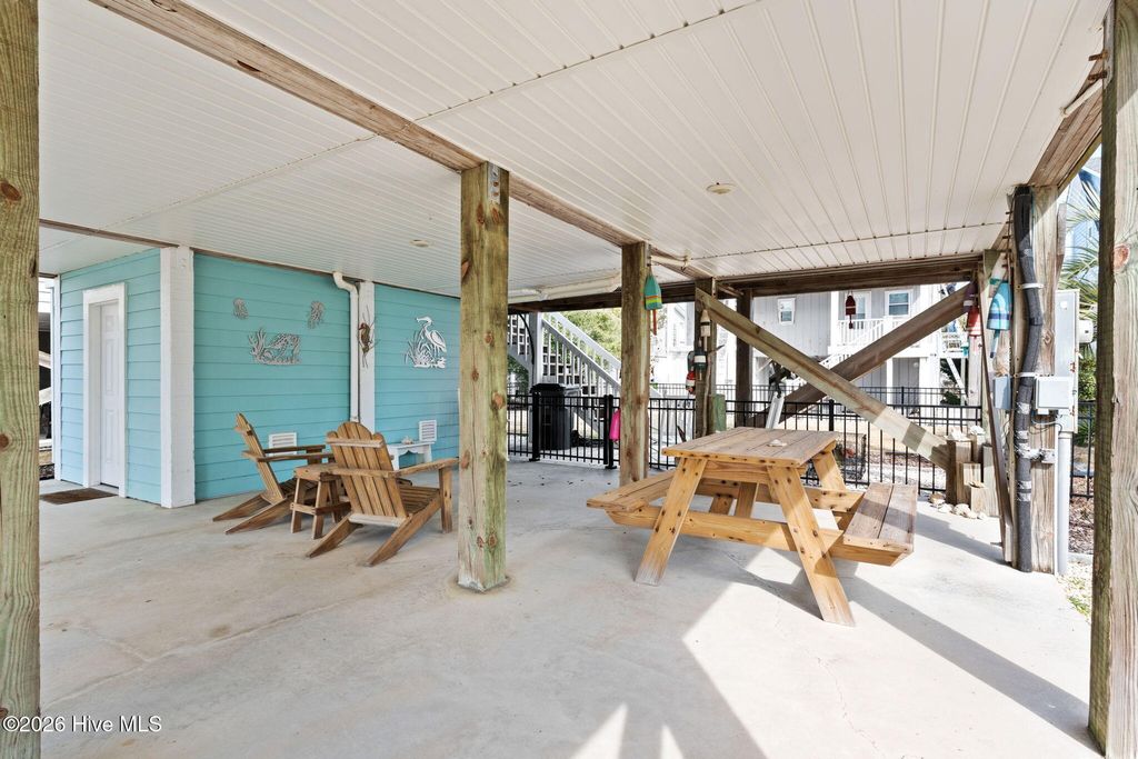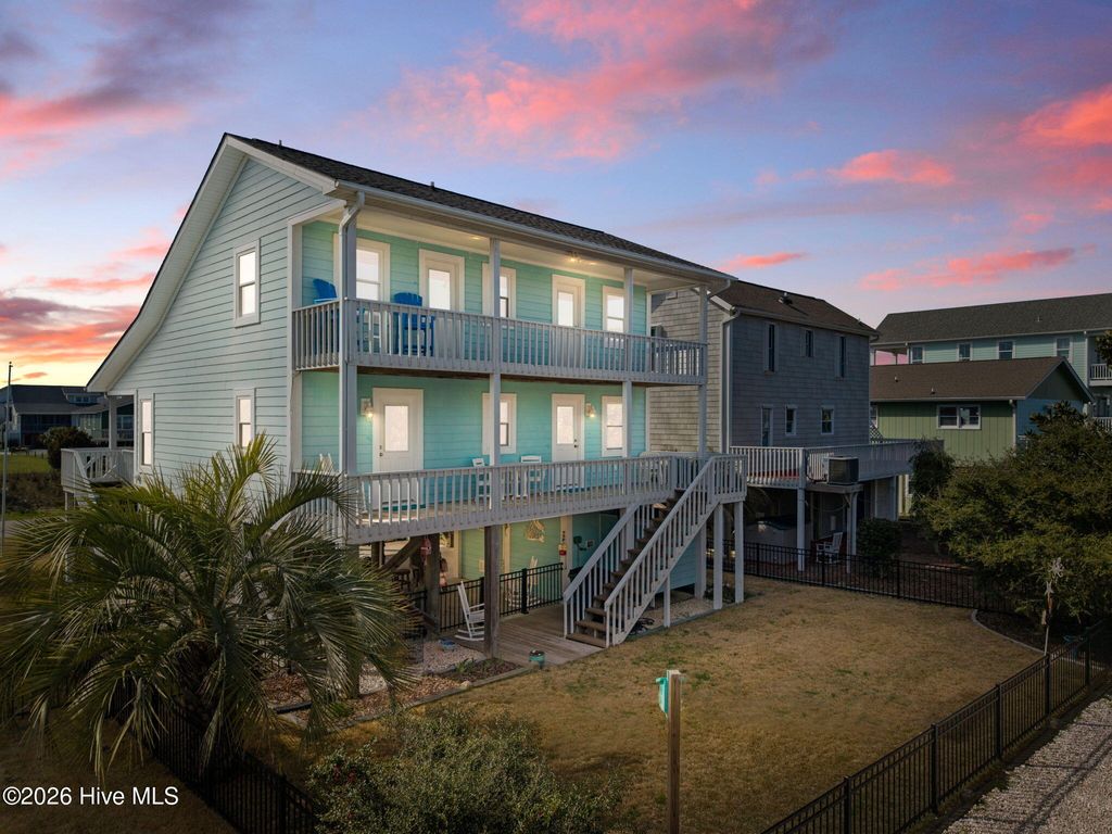 Your coastal dream begins here in this adorable 3-bedroom, 2-bath beach cottage which is perfectly located just steps from the private Sunshine Lane beach access, making it easy to enjoy morning walks along the shore and relaxing days by the ocean. The expansive front porch welcomes you with the perfect spot to enjoy your morning coffee or unwind in the evening while taking in the ocean breeze and beautiful sunsets. Inside, vaulted ceilings, abundant natural light, and an open-concept design create a bright and inviting space. The spacious living and dining areas flow seamlessly together, making this home ideal for entertaining and gathering with family and friends. The kitchen features quartz countertops, a tile backsplash, beautiful cabinetry, and a convenient eat-in bar. The spacious main bedroom, located on the main level, offers direct access to the large back deck overlooking the fenced backyard--perfect for relaxing after a day at the beach. The main-level bathroom features a tiled walk-in shower and a granite vanity. Upstairs you will find two generously sized guest bedrooms and a shared full bath, providing comfortable space for visitors. The ground level includes a large storage area for beach gear along with a convenient outdoor shower for rinsing off after time in the sand and surf. Additional features include a fenced backyard and irrigation system. With private beach access just steps away, this charming coastal cottage is ideal as a full-time residence, vacation getaway, or investment opportunity.