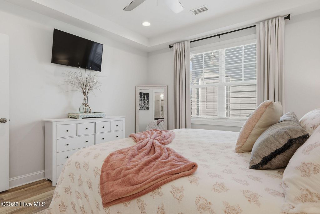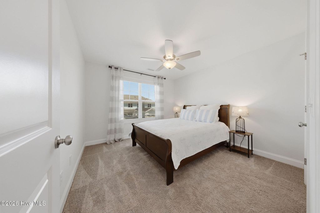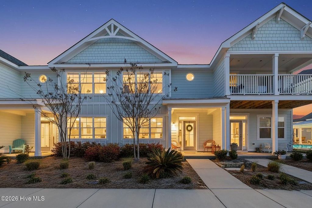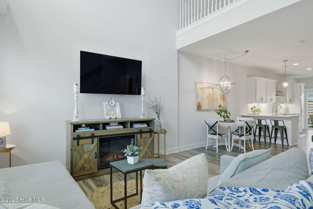 This home is a rare opportunity for the discerning buyer as this ''Schooner'' floor plan featuring, a primary bedroom on the main floor, a detached 1 car garage, and a living area w/ 20' ceilings. This western facing townhome is well appointed. The design and selections are clean and flexible to accommodate many décor & color preferences. The primary bedroom on the main floor features an en-suite bath with dual vanity, large shower w/ tile surround, and walk-in closet. The kitchen is bright and white w/ quartz countertops, tile backsplash, under cabinet lighting, soft close doors/drawers, crown molding, and pantry cabinets. Move-in ready w/ all appliances: gas range, refrigerator, washer, and dryer. The expansive ceiling lets the light pour in. A second story loft is ample space for home office, reading or hobbies. A large walk-in closet can be found in one of the two upstairs secondary bedrooms that share a full bath. Sliding doors lead to a private fenced-in patio. Neighborhood amenities include: the lake, club house, fitness center, salt water zero entry pool, billiard room, playgrounds, parks, firepits, oyster pits, crabbing pier, kayak launch on river and lake, community commercial spaces, dog parks, & bocce courts. New Amenity Center, ''The River House'' includes pickleball, outdoor pool, fitness center and gathering space with fire place. There are trails, sidewalks, street lights throughout the neighborhood. Adjacent to the lake is a 3.4-mile trail and expansive green spaces. The community offers access to many events, along with restaurants and retail. Low maintenance living with exterior maintenance, landscaping, and Master Insurance (w/wind & hail) included in the reasonable HOA fees. Min. 6-month lease per HOA rules and regulations. Nothing left to do but move in and take advantage of all that RiverLights, nearby downtown Wilmington and the local beaches have to offer.