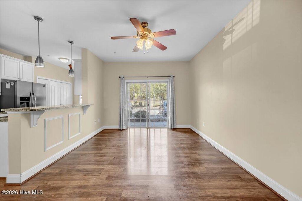 This first-floor condo offers a practical layout and a location convenient to Wrightsville Beach, downtown Wilmington, and UNCW. Inside, the open-concept floor plan combines the living room and dining area, creating a comfortable main living space for everyday living and entertaining. Wood laminate flooring runs through the main living areas for a clean, cohesive look. The galley kitchen features granite countertops, a hop-up counter with room for stools, a pantry, and a laundry closet, making good use of the space. Just outside, the patio adds a spot to enjoy fresh air or a quiet morning coffee. The condo includes 2 bedrooms and 2 full bathrooms. Both bedrooms have carpet. The primary suite features a walk-in tiled shower, while the second bathroom has a tub/shower combo and can be accessed from both the guest bedroom and the hallway for added convenience. At the center of the community, a swimming pool offers a place to relax and cool off. The HOA covers water, sewer, and trash, along with cable TV and internet, maintenance of the common areas, the building, and the community pool; the master insurance policy for the building; and a property management fee. With its first-floor location, functional floor plan, and easy access to beaches, downtown Wilmington, shopping, dining, and UNCW, this condo offers low-maintenance living in a convenient Wilmington location.