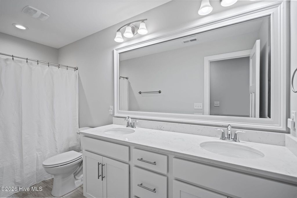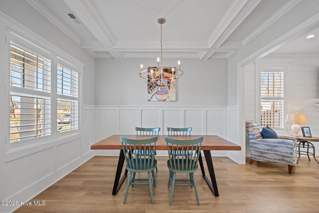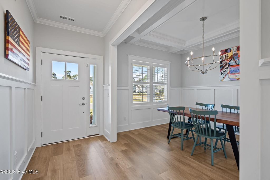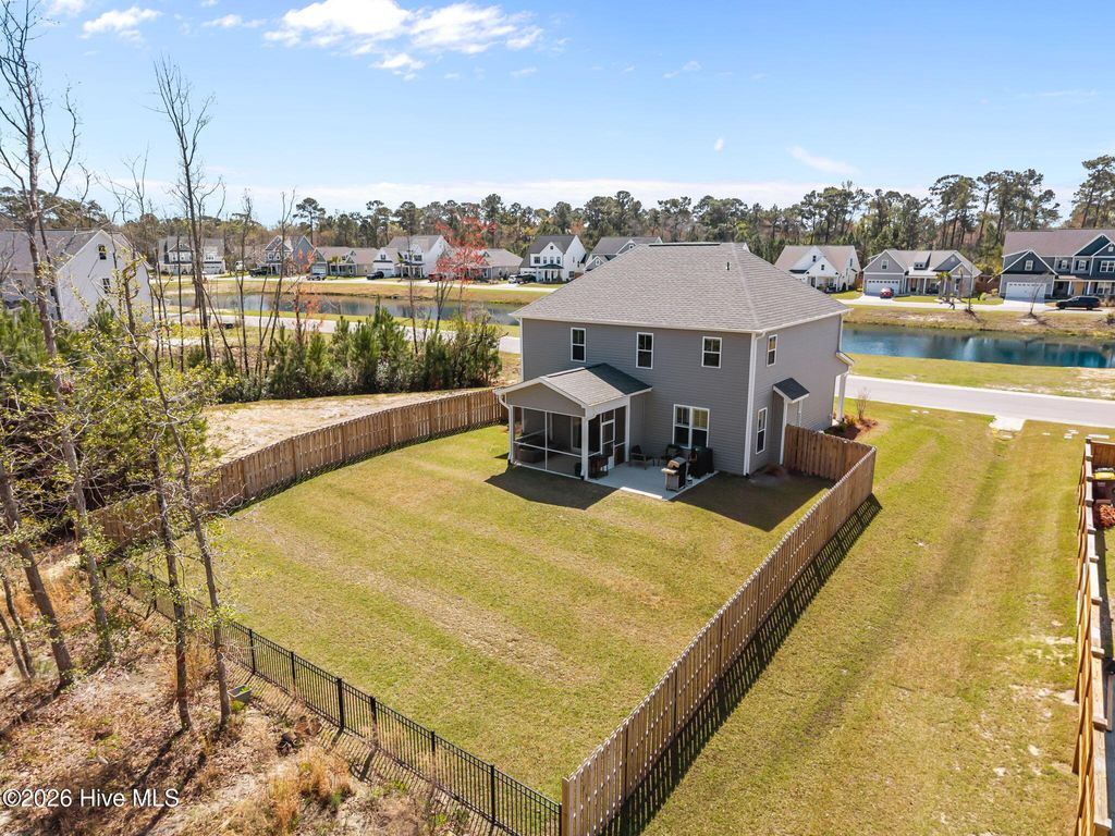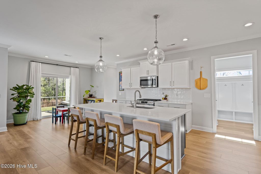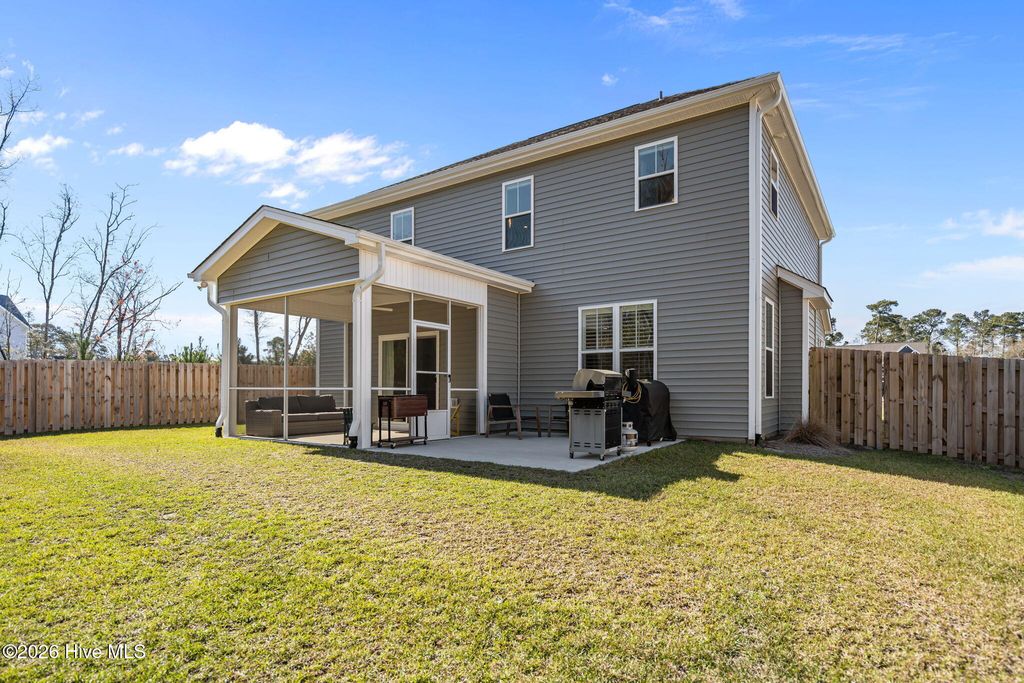 Built by local renowned builder Hardison Building, this beautifully designed home offers 4 bedrooms, 3.5 bathrooms, and 2,556 sq ft, set on a spacious .38 acre lot backing to a wooded area and positioned across from a peaceful neighborhood pond. A covered front porch welcomes you inside, where luxury vinyl plank flooring carries throughout the main living areas. Just off the entry, a formal dining room with board and batten wainscoting and a coffered ceiling flows into the open living room, anchored by a gas fireplace with a shiplap accent wall. The kitchen showcases a natural gas range, stainless steel appliances, quartz countertops, tile backsplash, solid wood soft-close cabinetry, a large walk-in pantry, and additional pantry cabinets. A sunny breakfast nook overlooks the backyard, while the nearby mudroom with a built-in hall tree adds everyday convenience and storage. Upstairs, the spacious 19 x 15 primary suite offers a tray ceiling, LVP flooring, two walk-in closets, and a private en suite bath with dual vanities and a tiled walk-in shower. The suite overlooks the wooded backdrop, creating a quiet and private retreat. Three additional bedrooms are situated on the opposite side of the second floor--each enjoying peaceful pond views--including one with its own en suite bath, while another full bath with double vanities and a laundry room with built-in cabinetry complete the level. Outdoor living is just as enjoyable, with a screened porch perfect for relaxing year-round and an adjacent patio ideal for grilling and entertaining. The fenced backyard provides ample space for pets, play, or gardening. Additional features include a Rinnai tankless natural gas water heater, whole-house gutters, plantation shutters throughout the main level, and custom window treatments upstairs. Located just one mile from Hampstead Marina and close to area beaches, dining, and everyday conveniences. Call today to schedule your private showing!
