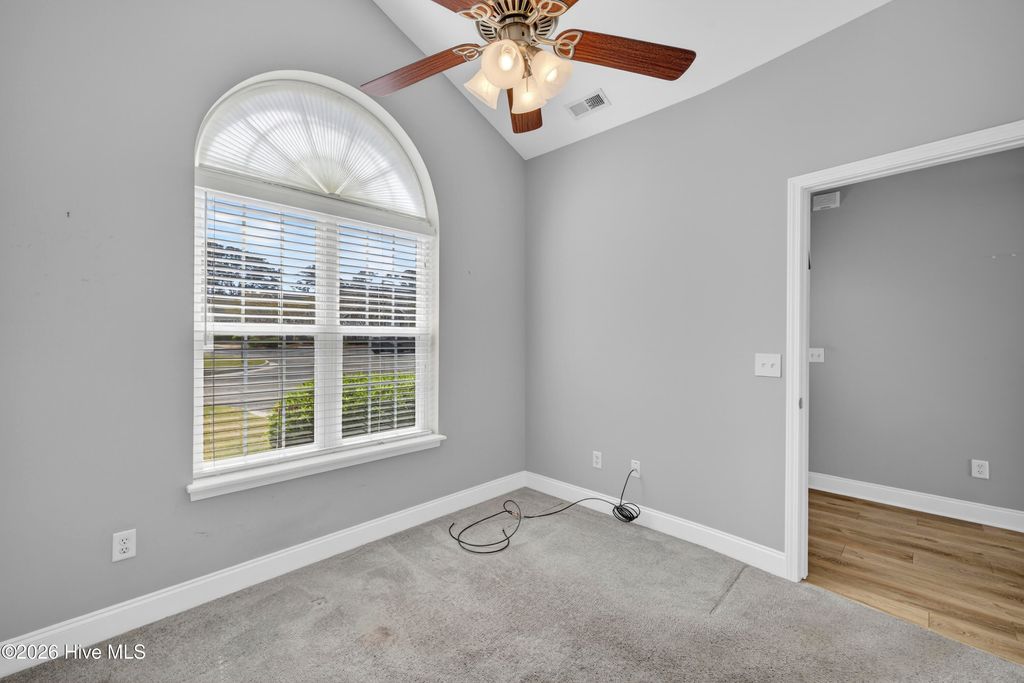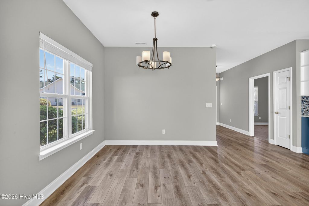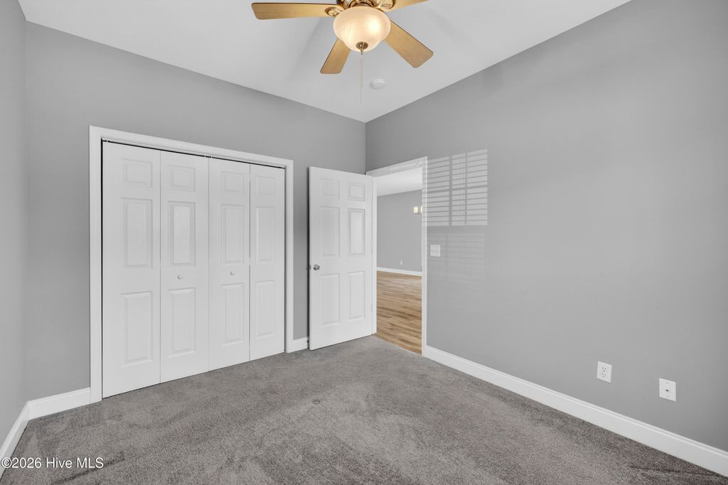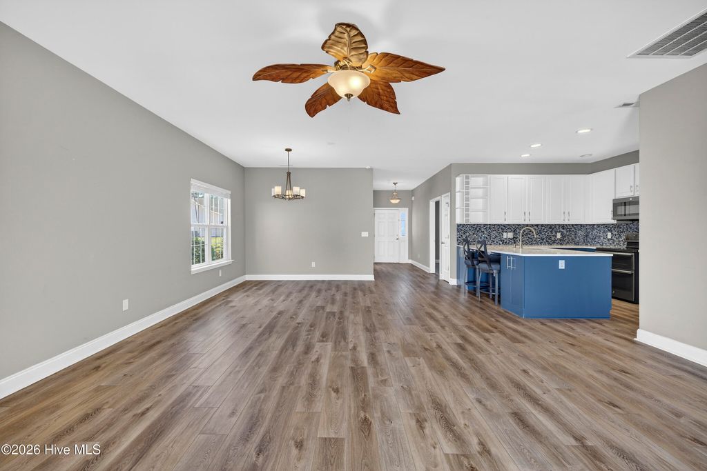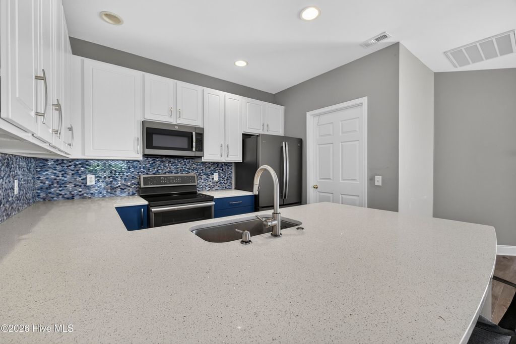 Welcome to a rare opportunity to own a beautifully updated one-story, end-unit brick condo in the highly desirable Willoughby Park community in Wilmington--where you truly have no one living above you, offering a level of privacy and quiet that's hard to find in condo living. Combined with its end-unit positioning and additional windows, this home is filled with natural light and lives more like a private residence than a typical condo . Step inside to a spacious, open-concept layout featuring wide-plank luxury flooring, soft neutral tones, and a seamless flow between the living, dining, and kitchen areas. The oversized living room is anchored by a cozy fireplace and enhanced by high ceilings, creating an open yet comfortable space for everyday living or entertaining. Large sliding glass doors bring in natural light and lead to a private outdoor area, extending your living space outdoors. The kitchen has been thoughtfully updated with a clean, modern design, showcasing solid surface countertops, stainless steel appliances, a stylish blue-toned tile backsplash, and a striking combination of white upper cabinetry and blue lower cabinets. A generous bar area provides additional seating and connects effortlessly to the main living space, making it a true focal point of the home. The split-bedroom layout offers both comfort and privacy, with a well-sized primary suite and two additional bedrooms that work perfectly for guests, a home office, or hobbies. Both bathrooms maintain a fresh, neutral aesthetic, and a dedicated laundry room adds convenience and extra storage. Additional highlights include central heating and air, natural gas service, assigned parking, and move-in ready condition. Willoughby Park provides a truly low-maintenance lifestyle--as well as access to a community pool and common areas . Ideally located near Monkey Junction, this home is just minutes from shopping, dining, medical facilities, and a short drive to Carolina Beach, downtown Wilmington, and The Pointe at Barclay. If you've been searching for low-maintenance living without sacrificing privacy, space, and comfort, this one-story brick end unit with no upstairs neighbors stands out in a big way.