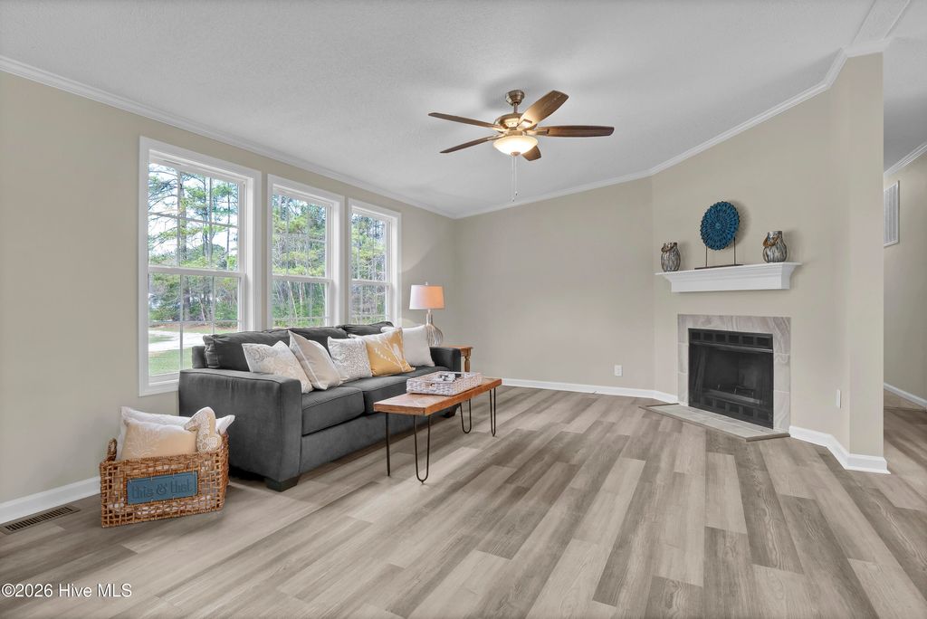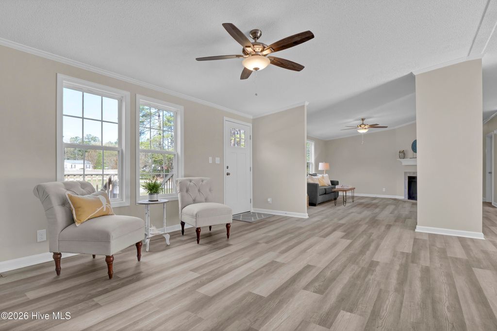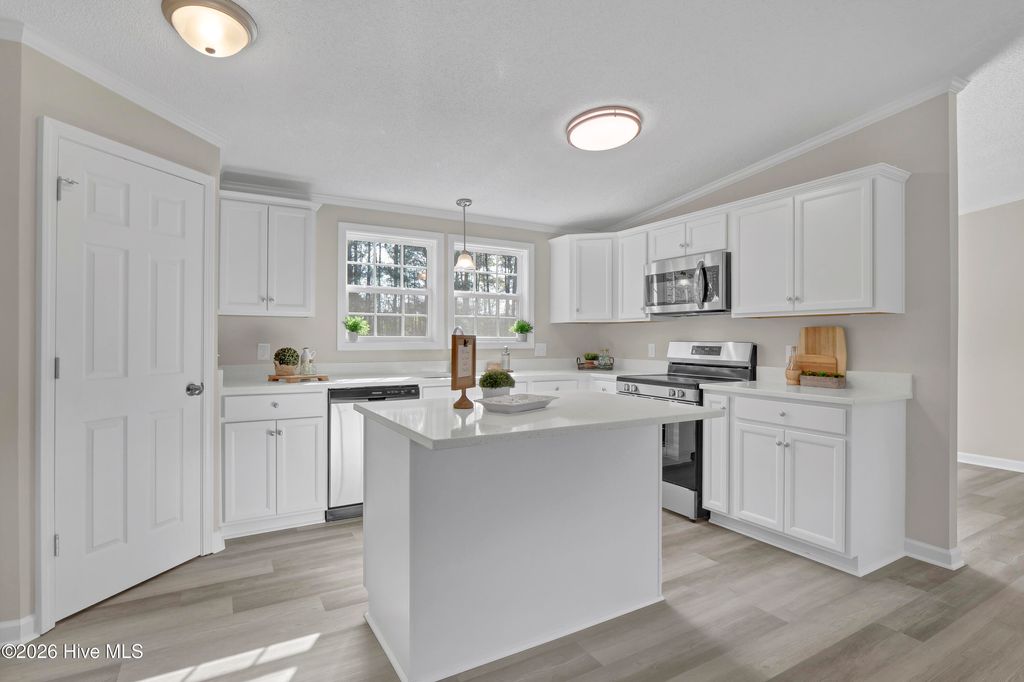 Like NEW!!! This beautifully renovated 4 bed, 2 bath home with NEW windows sits on a spacious 1.79 acre lot and is conveniently located to local businesses, schools, and shopping! Upon entering, you will appreciate the modern open floor plan with a vaulted ceiling and cozy wood-burning fireplace in the living room! Stylish NEW LVP floors extend into the dining room nook and kitchen which features brand NEW white kitchen cabinetry and a kitchen island with NEW quartz countertops and sleek NEW stainless appliances, as well as NEW plumbing and lighting fixtures! Also, there's plush NEW carpet, fresh paint and much more throughout! The primary suite features a vaulted ceiling, walk-in closet and a roomy master bath with a separate walk-in shower and soaking tub and a NEW premium height dual sink vanity with a NEW quartz top! When outside, enjoy the privacy of the large lot and view of the mature landscaping from the comfort of the 10' x 17' front porch or the 16' x 21' back deck! This one is move-in ready and priced to sell! Set up your own private showing today!