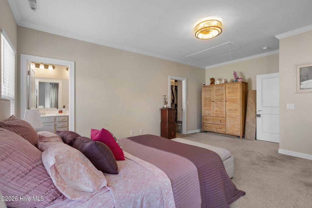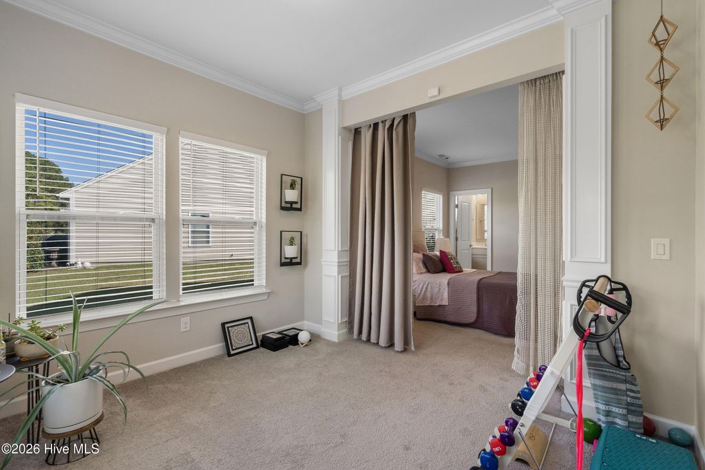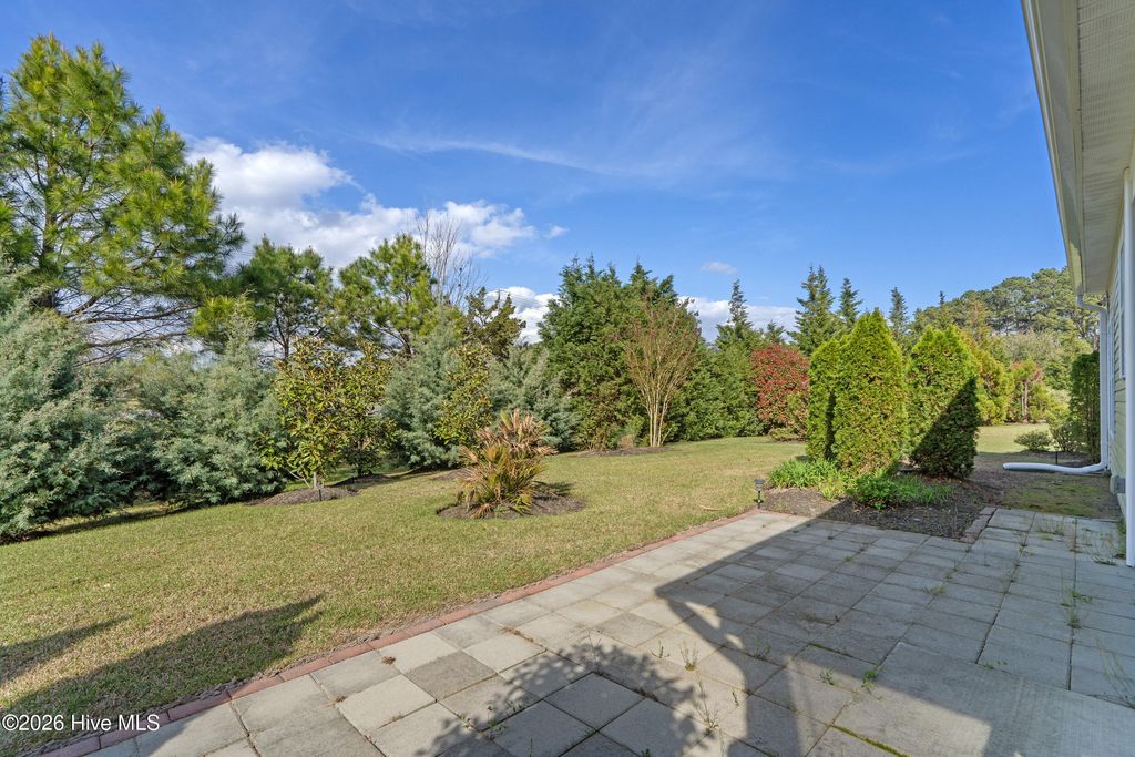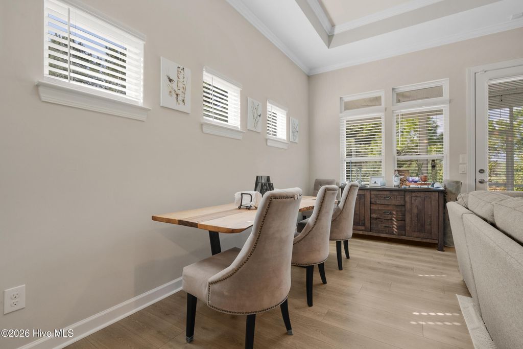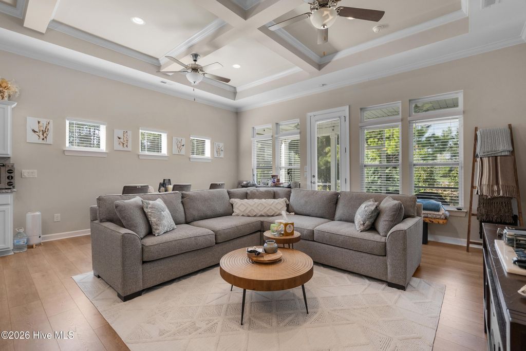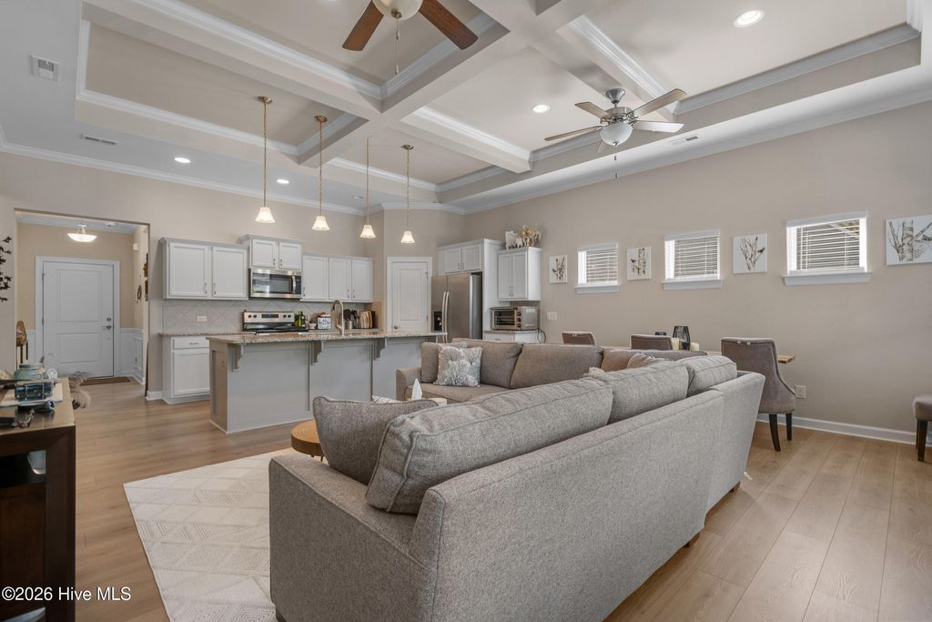 Welcome to refined coastal living in the highly sought-after Meadowlands Golf Course community! Built in 2019 and meticulously maintained, this beautiful three-bedroom, three-bathroom home with a two-car garage offers the perfect blend of style, comfort, and functionality. Designed with an open-concept layout, the home features soaring 10-foot ceilings in the living area with elegant coffered accents reaching 11 feet, crown molding, box molding, ceiling fans, and abundant natural light throughout. The chef's kitchen is a true centerpiece, showcasing granite countertops, an eight-foot center island, staggered cabinetry, stainless steel appliances, backsplash, pendant lighting, and a spacious pantry, ideal for both everyday living and entertaining. Durable LVP flooring enhances the main living areas, adding both beauty and practicality. The spacious first-floor owner's suite is a private retreat, complete with a cozy sitting area, custom walk-in closet with cedar backing, and a spa-inspired bath featuring a double vanity and a tiled walk-in shower with a rain head. There is also convenient walk-up access to a floored attic space above the primary bedroom, providing additional storage. Thoughtful upgrades continue with a well-appointed laundry room featuring a sink, drying rack, wine refrigerator, and extra storage. Connected to county water and sewer, with an active termite bond in place. Step outside to enjoy a screened-in porch and beautifully landscaped patio, perfect for relaxing mornings or entertaining evenings. Located on a spacious lot at the end of a quiet cul-de-sac, this home is part of a lively golf course community offering resort-style amenities. Just minutes from beaches, shopping, and dining, it perfectly blends convenience with coastal charm. Move-in ready and outside of any flood zone, this is the ultimate coastal Carolina lifestyle. Don't miss out! Schedule your private showing today!