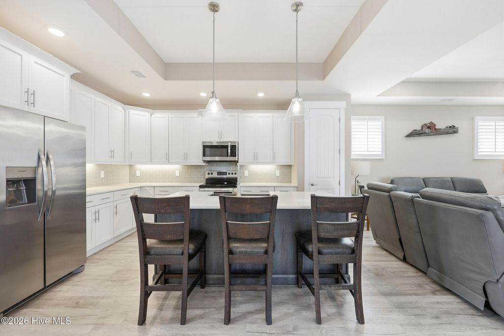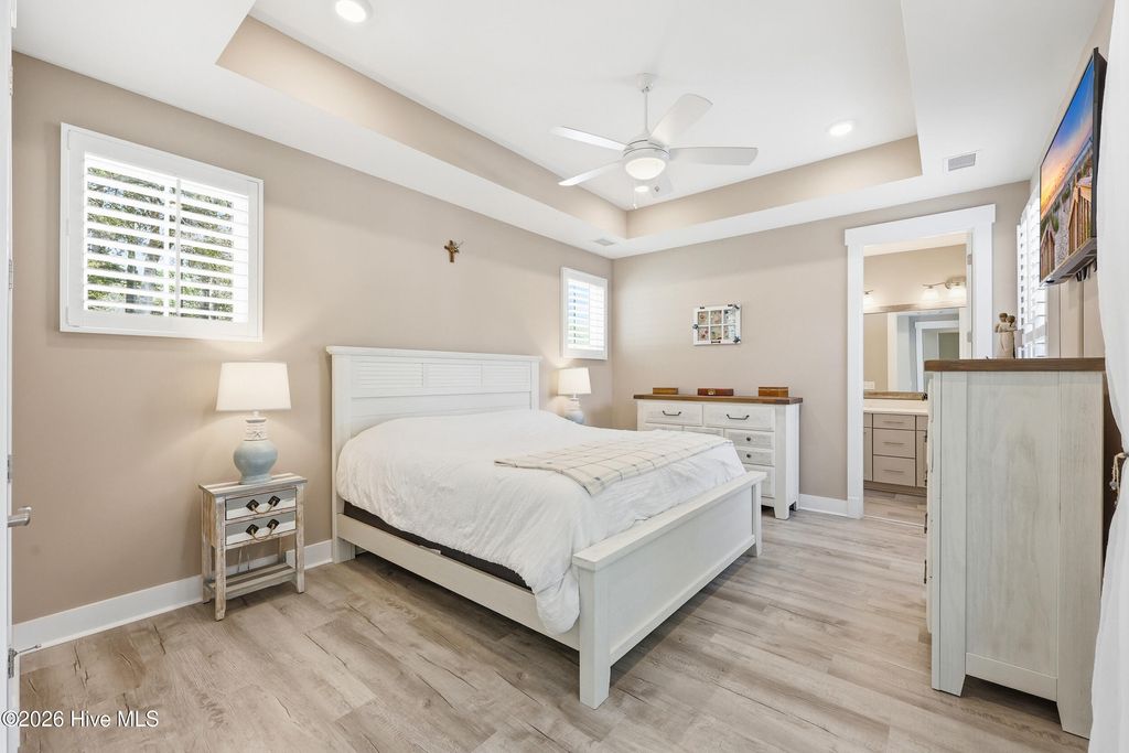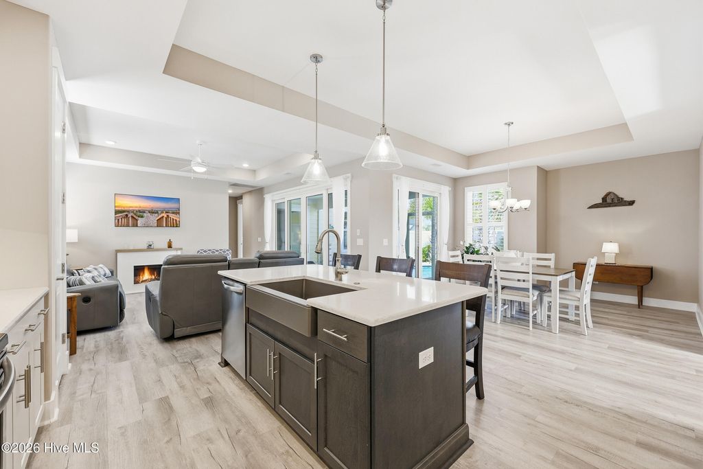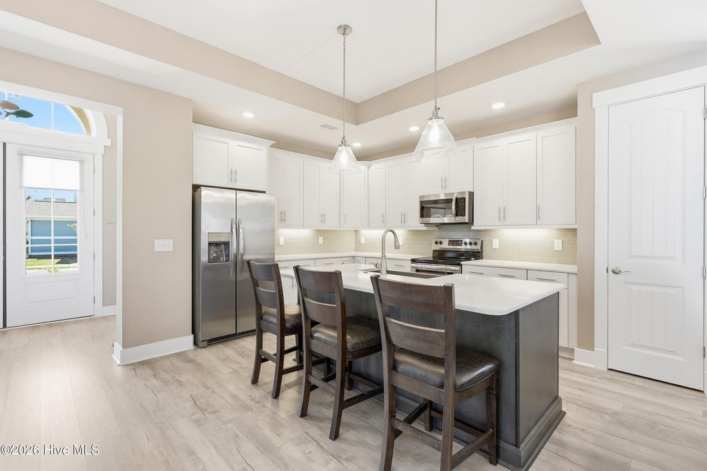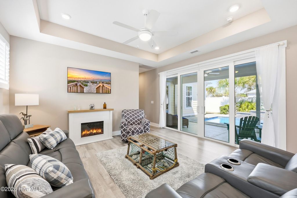 Welcome to this beauty, nestled within the gated waterfront community of Kingfish Bay in Calabash, NC. Yellowtail I floor plan offers true turn-key living with modern coastal elegance, thoughtful upgrades, and your own private backyard retreat. From the moment you arrive, the home makes a statement. Step through the double-door entry into a breathtaking foyer with soaring, nearly two-story ceilings--setting the tone for the light-filled, open-concept design that follows. The main living area is both stylish and functional, featuring tray ceilings, luxury vinyl plank flooring, smooth rounded corners, and abundant natural light throughout. The seamless flow between living, dining, and kitchen spaces creates the perfect setting for everyday living and entertaining. The home has Plantation Shutters throughout. The gourmet kitchen is a standout, complete with stainless steel appliances, a built-in microwave, range hood, granite countertops, and a classic subway tile backsplash--designed to impress while remaining highly functional. This thoughtfully designed 3-bedroom, 2-bath home offers privacy and comfort with a split-bedroom layout. The primary suite is a true retreat, showcasing a tray ceiling, custom closet, and a spa-inspired bath featuring dual vanities, and a tiled walk-in shower. Private in-ground pool with water and fire features, enhanced by upgraded pool finish and designer patio tile. Professionally landscaped with upgraded palm trees, shrubs, and custom exterior lighting on both the home and surrounding trees (front and back). Screened-in patio with durable epoxy flooring--perfect for year-round outdoor living ! Whether you're sipping your morning coffee, hosting friends, or unwinding after a beach day, this space offers the ultimate blend of relaxation and privacy. The fenced backyard adds an extra layer of comfort for pets and outdoor living. The garage is fully equipped with epoxy flooring, built-in shelving, and added laundry cabinetry and shelving for optimal organization and functionality. As a resident of Kingfish Bay, you'll enjoy unmatched amenities, including a private oceanfront clubhouse on Sunset Beach with dedicated parking, a resort-style community pool and spa, fitness center, cinema room, and a riverfront park with kayak launch--offering the ultimate coastal lifestyle.