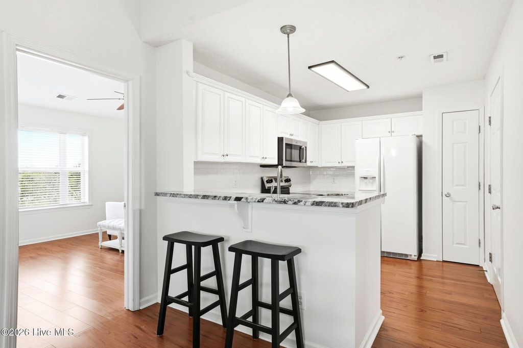 Experience coastal living at its finest in this beautifully updated top-floor, end-unit condo located at 625 Spencer Farlow Drive in Carolina Beach, NC. This light-filled residence offers two spacious bedrooms and two full bathrooms, thoughtfully designed with an open floor plan and fireplace enhancing both comfort and functionality. Vaulted ceilings create an airy, expansive feel, while fresh paint throughout gives the home a crisp, modern look. The kitchen is a standout feature, showcasing elegant granite countertops, a custom backsplash, and a full suite of brand-new appliances installed in 2025, including a stove, microwave, and dishwasher which are perfect for both everyday living and entertaining. Generous closet space provides ample storage, complemented by additional dedicated storage for all your beach gear and extras. Step outside to your private screened-in porch, an ideal spot to unwind and enjoy the coastal breeze. The home also features a new HVAC system installed in 2025, offering peace of mind and energy efficiency year-round. Residents enjoy access to a community pool, and the location is unbeatable. Just minutes from shopping, dining, and the scenic Carolina Beach Greenway. With easy access on and off the island, this condo perfectly balances convenience with the relaxed charm of coastal living.