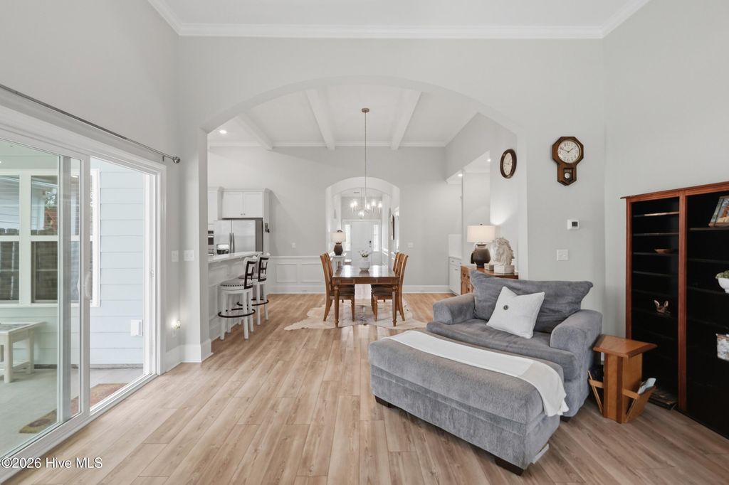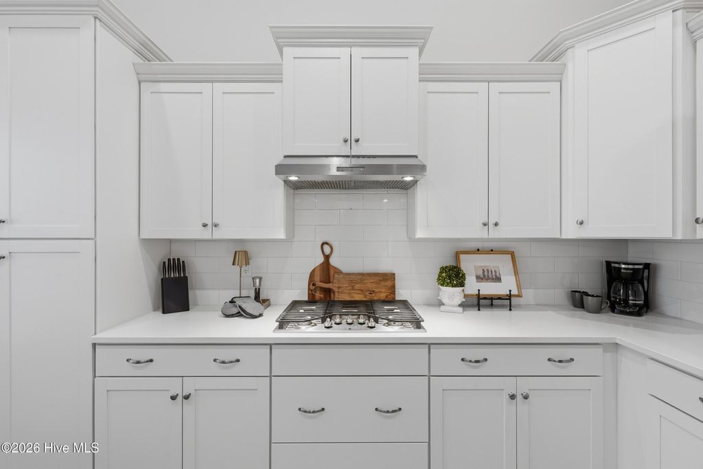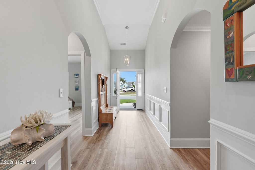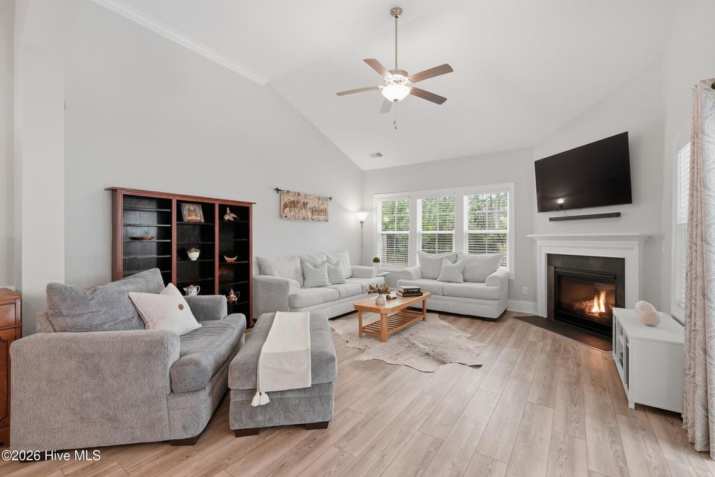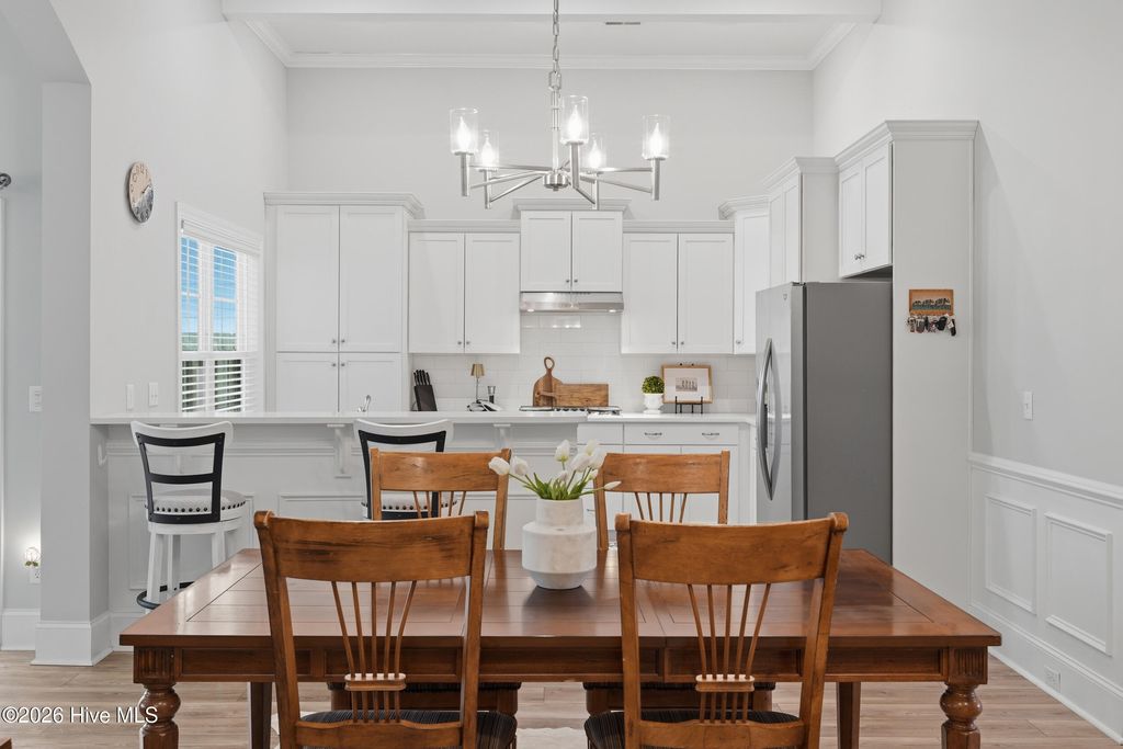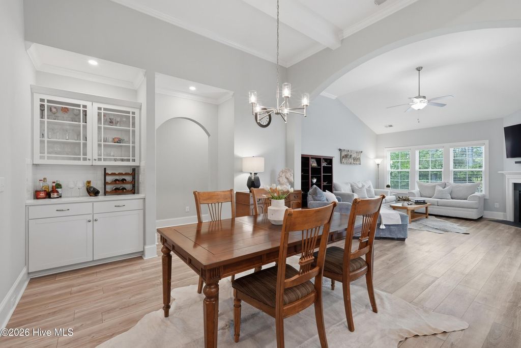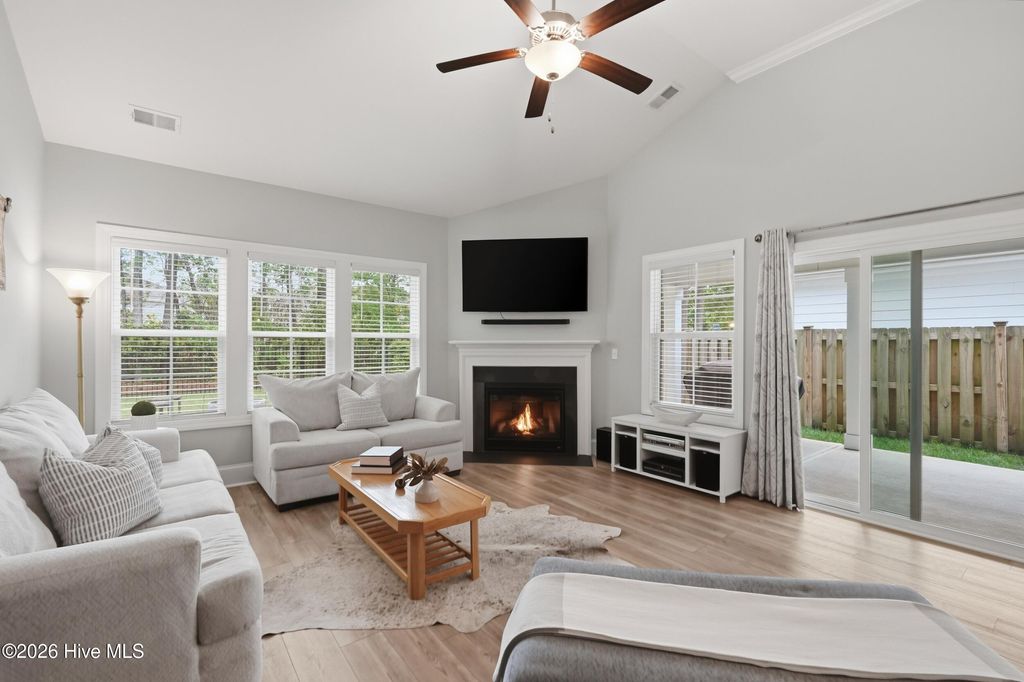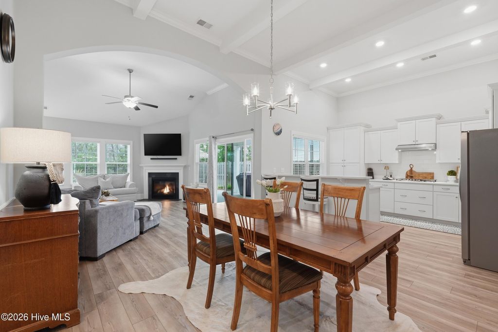This meticulously maintained 3 bedroom, 3.5 bath home with elevated finishes is located in 28409's highly desirable Congleton Farms--a natural gas community with a pool, playground, walkable sidewalks, and access to highly regarded schools. County-only taxes & Wilmington, North Carolina's beaches, dining, + shopping just a short drive away. Your home sets itself apart with Hardi plank siding and charming double garage doors, delivering strong curb appeal with a coastal craftsman presence. Architecture elevates every space--wainscoting, crown molding, custom millwork, beams, & arched openings create depth + character. Vaulted ceilings enhance natural light. The chef's kitchen is designed for both performance and presentation: farmhouse sink, natural gas range + vent hood, tile backsplash, extended high-end stone surfaces, and top-tier glass-face soft-close cabinetry, along with a dry bar area. The space opens seamlessly to the dining area and a large great room with 12-ft ceilings and a natural gas log fireplace. The floor plan offers a dual suite configuration on the main level, featuring a spacious primary and a junior suite--each with double vanities, tiled showers, and walk-in closets. Upstairs, a private guest room with a full bath adds valuable separation for guests or work-from-home needs. The first-floor laundry room is oversized and well-equipped with a folding counter and cabinetry, positioned just off the garage entry for convenience. Outdoor living - covered porch and grilling patio extension overlook a fully fenced backyard with a wooded backdrop--providing privacy and a natural setting. The custom cobblestone patio with water feature creates a defined entertaining space, while the fully sodded and irrigated yard keeps maintenance streamlined. Your tankless water heater and oversized, finished 2-car garage with epoxy floor round out a home that balances design, function, and long-term livability in one of South Wilmington's most desirable neighborhoods.