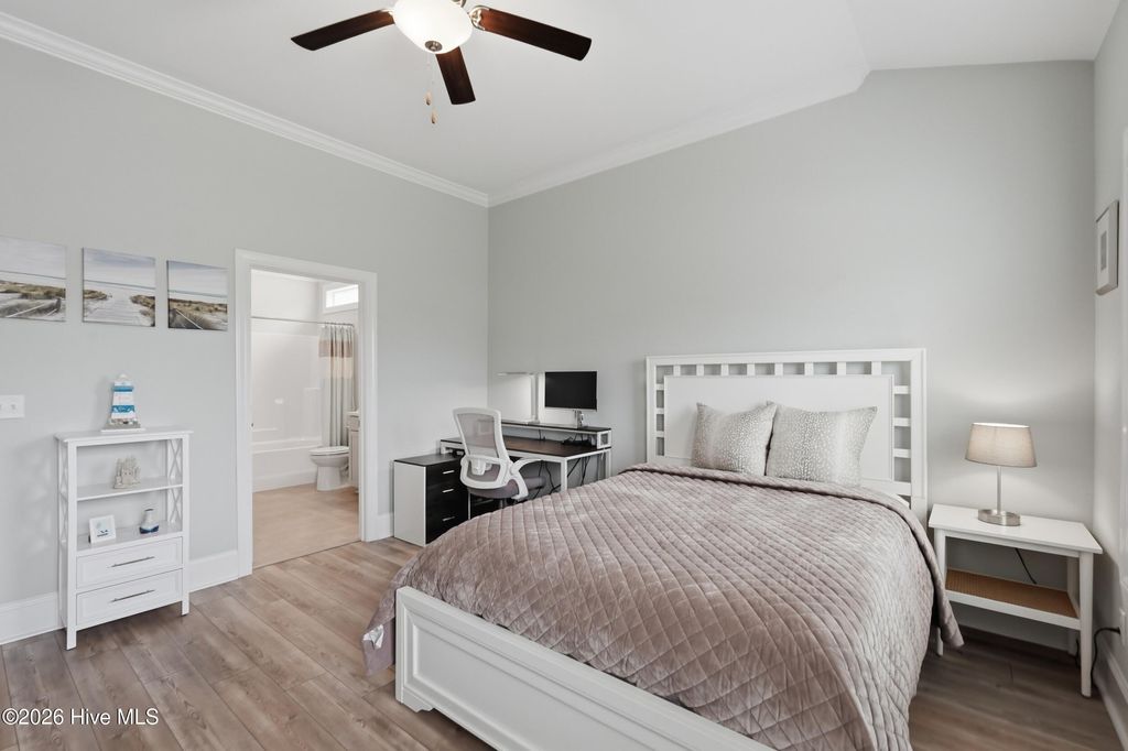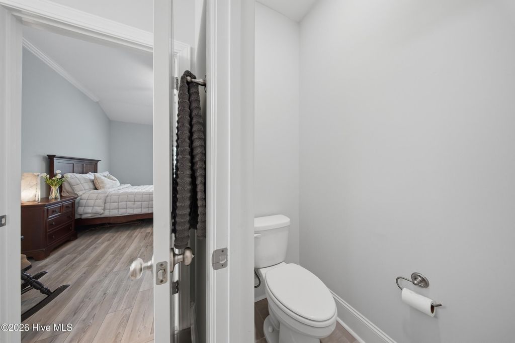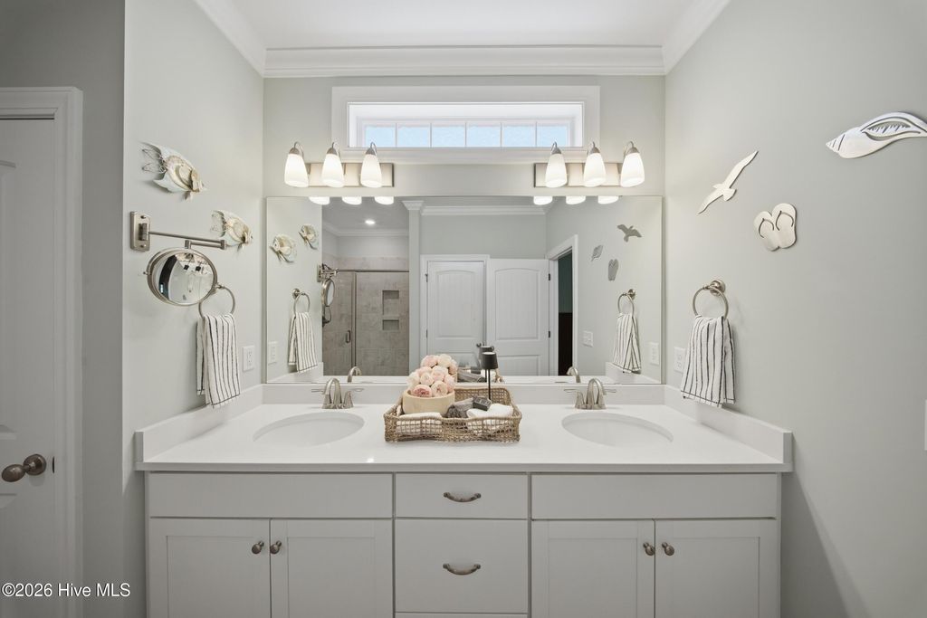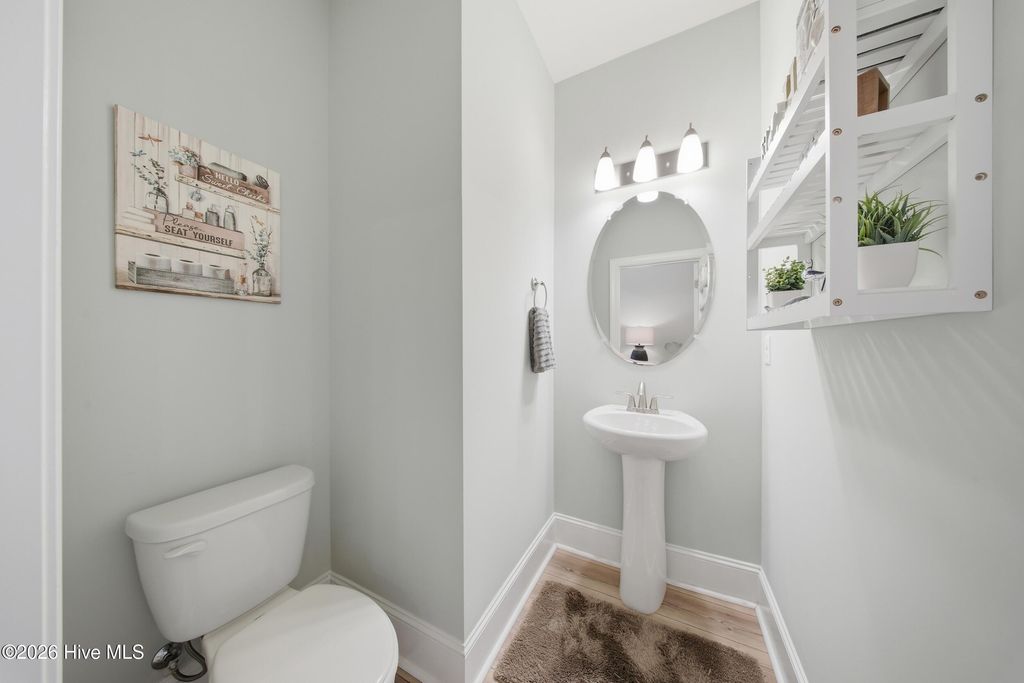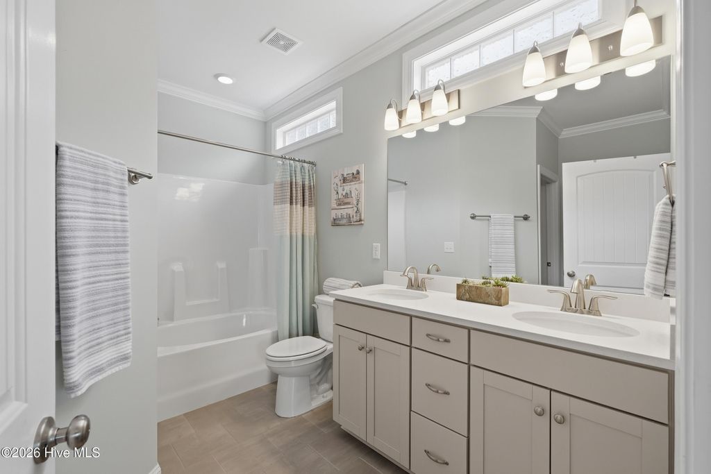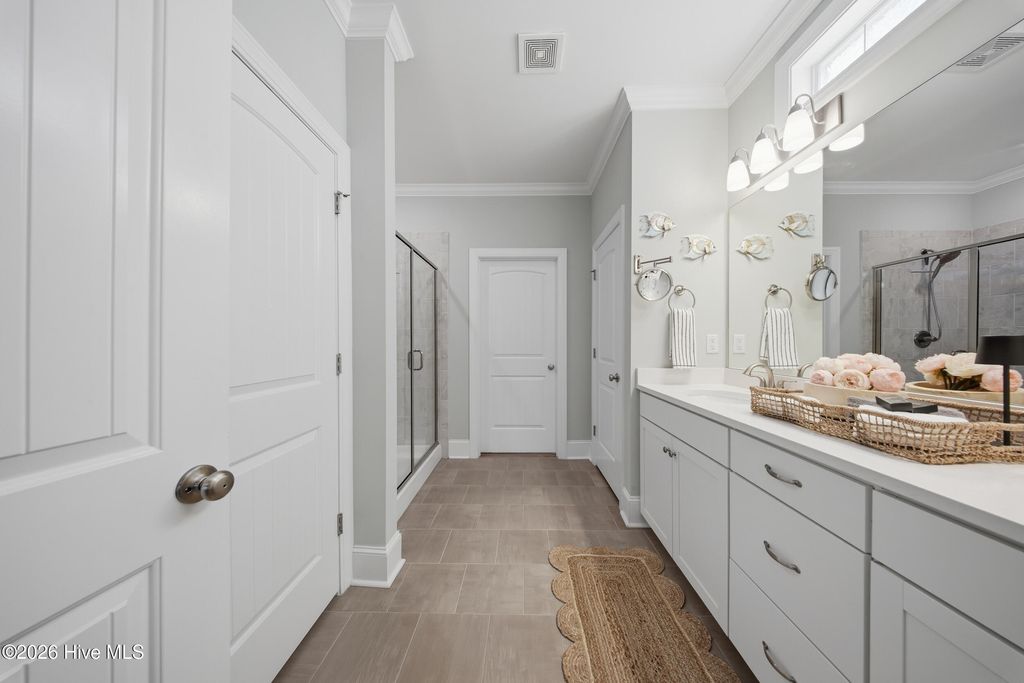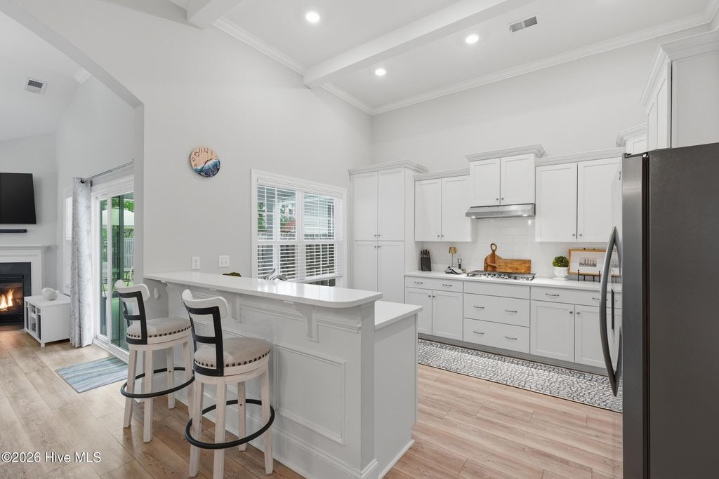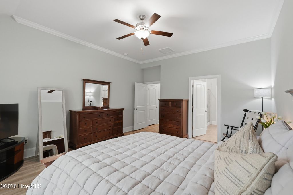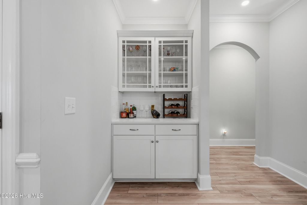 This meticulously maintained 3 bedroom, 3.5 bath home with elevated finishes is located in 28409's highly desirable Congleton Farms--a natural gas community with a pool, playground, walkable sidewalks, and access to highly regarded schools. County-only taxes & Wilmington, North Carolina's beaches, dining, + shopping just a short drive away. Your home sets itself apart with Hardi plank siding and charming double garage doors, delivering strong curb appeal with a coastal craftsman presence. Architecture elevates every space--wainscoting, crown molding, custom millwork, beams, & arched openings create depth + character. Vaulted ceilings enhance natural light. The chef's kitchen is designed for both performance and presentation: farmhouse sink, natural gas range + vent hood, tile backsplash, extended high-end stone surfaces, and top-tier glass-face soft-close cabinetry, along with a dry bar area. The space opens seamlessly to the dining area and a large great room with 12-ft ceilings and a natural gas log fireplace. The floor plan offers a dual suite configuration on the main level, featuring a spacious primary and a junior suite--each with double vanities, tiled showers, and walk-in closets. Upstairs, a private guest room with a full bath adds valuable separation for guests or work-from-home needs. The first-floor laundry room is oversized and well-equipped with a folding counter and cabinetry, positioned just off the garage entry for convenience. Outdoor living - covered porch and grilling patio extension overlook a fully fenced backyard with a wooded backdrop--providing privacy and a natural setting. The custom cobblestone patio with water feature creates a defined entertaining space, while the fully sodded and irrigated yard keeps maintenance streamlined. Your tankless water heater and oversized, finished 2-car garage with epoxy floor round out a home that balances design, function, and long-term livability in one of South Wilmington's most desirable neighborhoods.