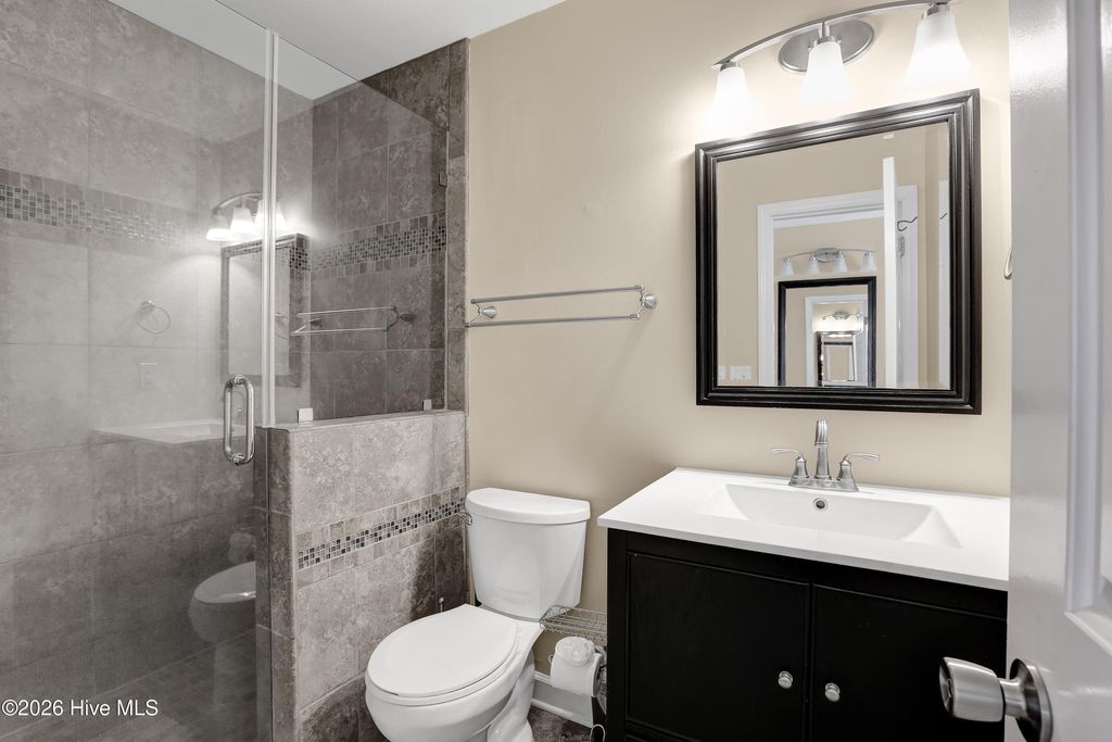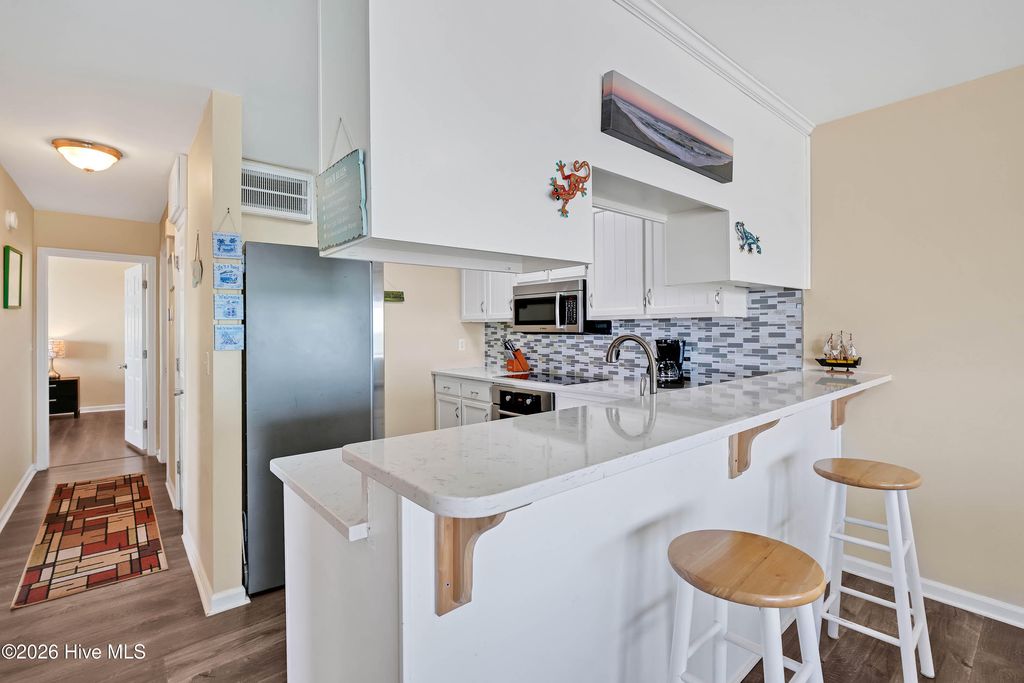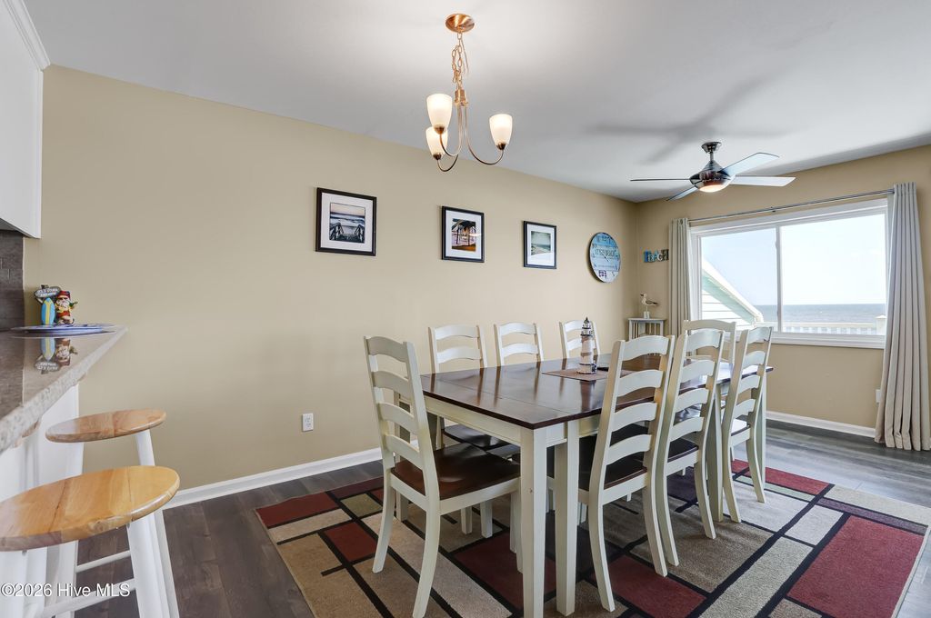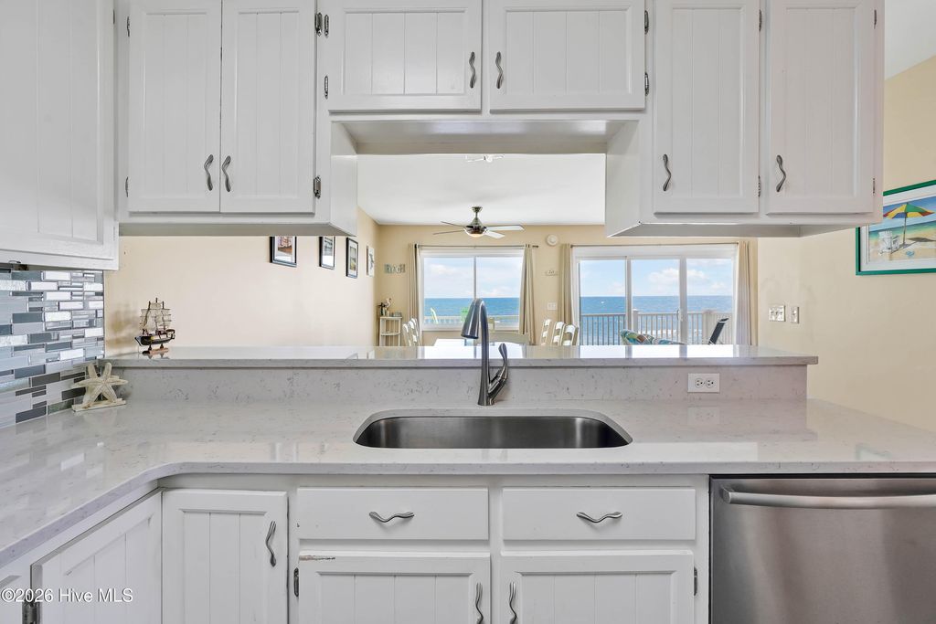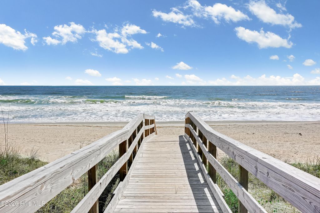This is an incredible ocean front condo with amazing panoramic top level end unit shoreline views. The seller has mostly used this as a vacation rental. As a 3 BR, with a larger capacity, it is also a wonderful getaway for family and friends, when there is a vacancy. Vacation rental income has ranged from $41K to over $43K with nearly $32,000 booked for 2026 as of April. Some of the popular features in this ocean front condo are the walk in shower in the owner's bath and the private balcony along the side of the owner's bedroom, the beautiful quartz kitchen counters and the very handy ground level storage for chairs, carts and toys. The large ocean front balcony is the favorite feature with many hours enjoyed reading, relaxing, eating, drinking and catching up with good friends. Location as an end unit on the south side of the building is also a convenience with close proximity to the beach access. Kitchen renovations including the quartz counters and glass tile backsplash occurred in 2024. Also new LVP was installed in the bedrooms, at this time. A brand new HVAC was just installed 4/2026. The HOA has also kept up with important upgrades to the decks, rails, siding and roof for a well maintained building. The location of Sands V makes for an easy walk to the popular Ocean Grill and Tiki Bar. If you are new to this restaurant and bar, it is actually on the Pier so you can enjoy waves rolling in underneath you. Granny's Country Kitchen is also very close so you can enjoy a great breakfast before you hit the beach.