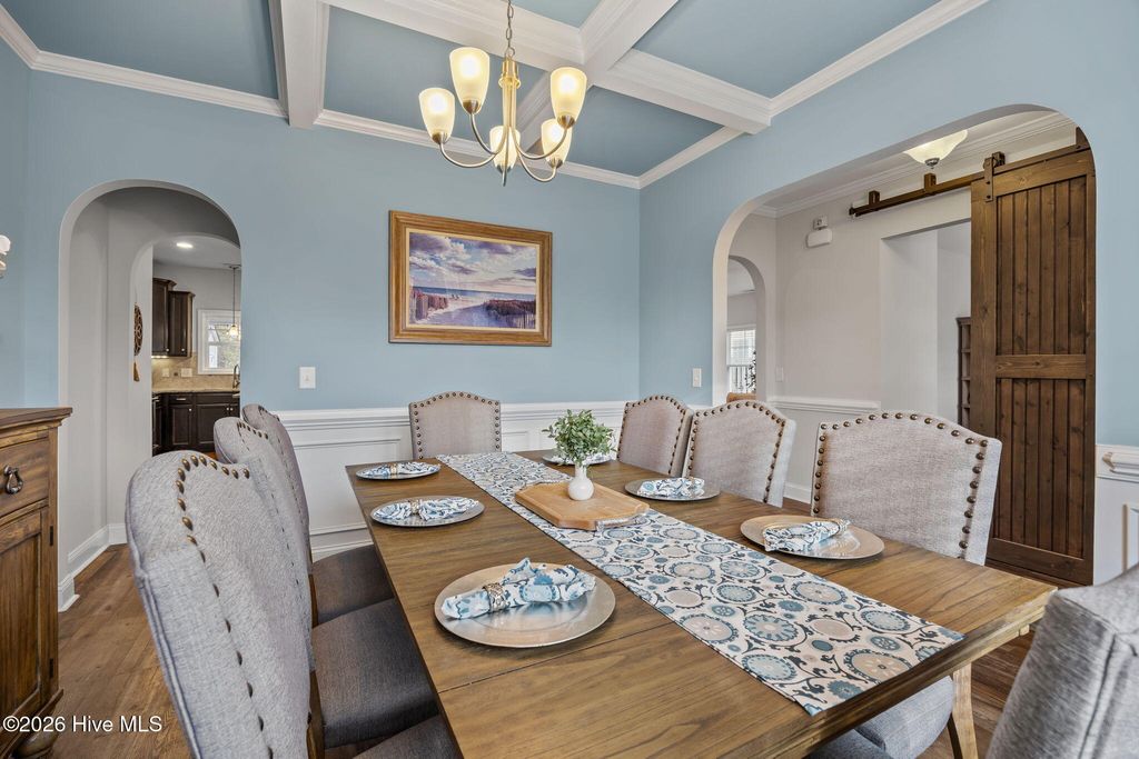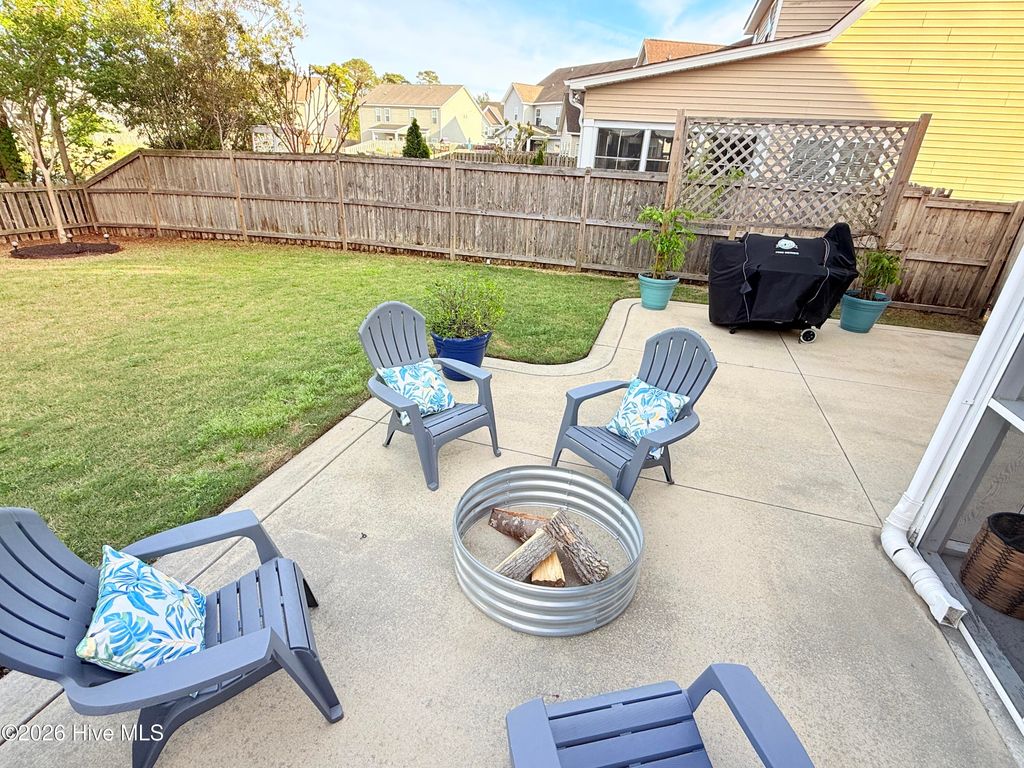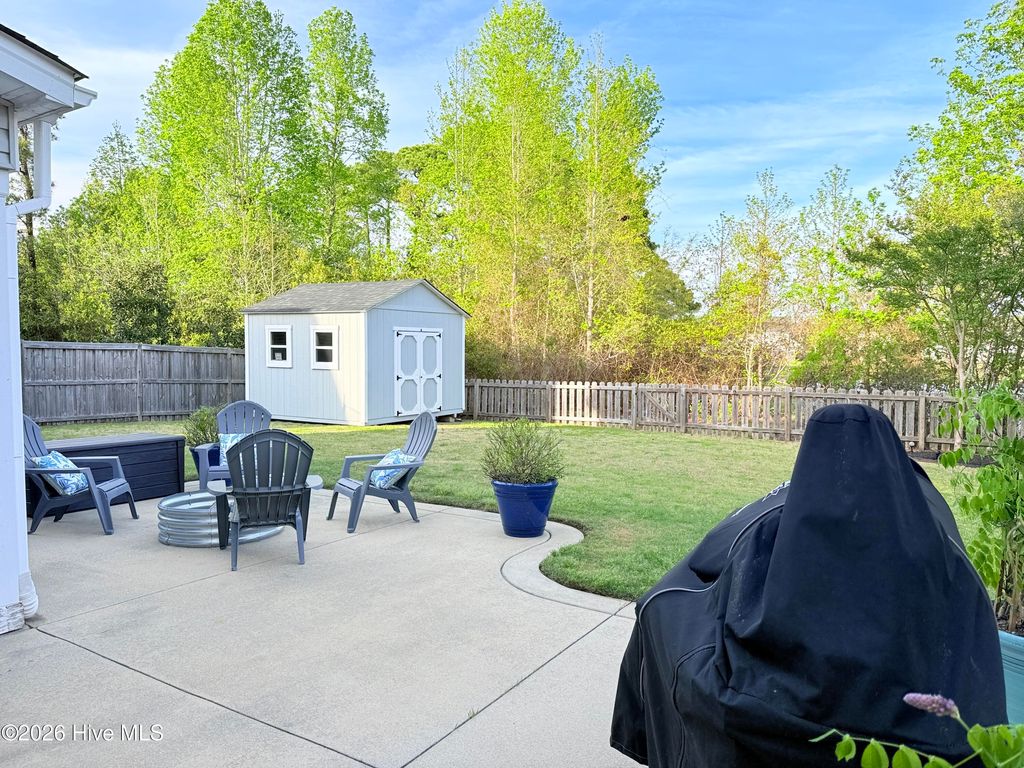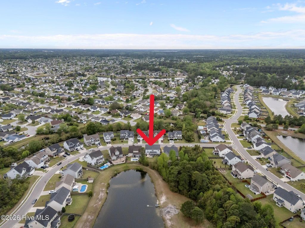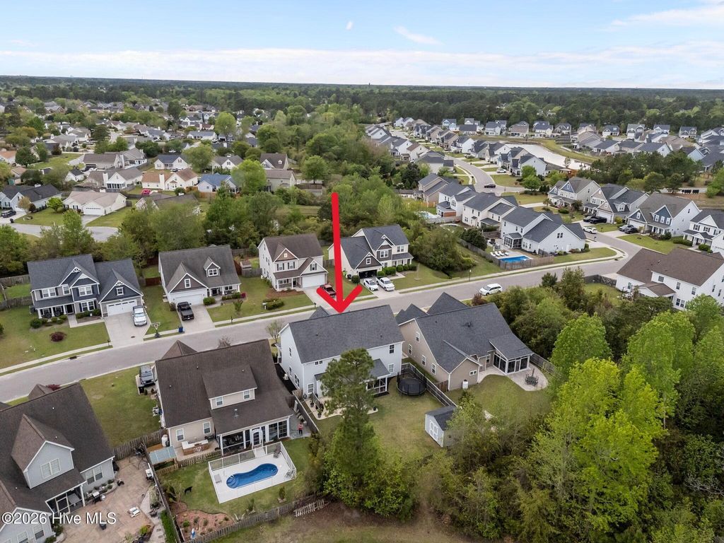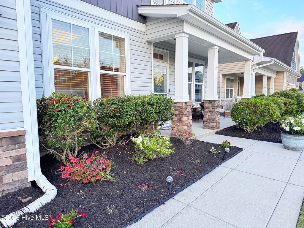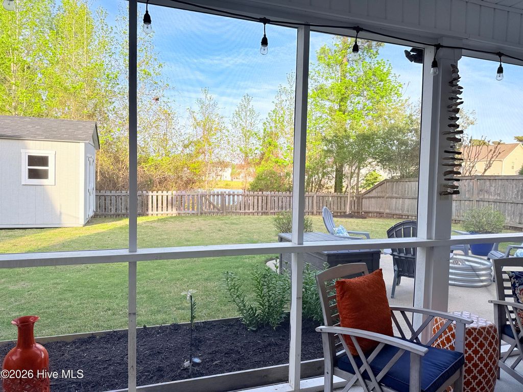 Welcome to this fresh and beautiful coastal retreat in one of Wilmington's most desirable locations! Featuring 5 spacious bedrooms, including one downstairs bedroom with full bath. A versatile bonus/playroom, plus a private office and 4 full bathrooms, this rare pond front home offers great views and privacy with both comfort and flexibility for today's lifestyle. Step outside to your private oasis--a large fenced backyard complete with an expanded screened in porch and an oversized patio overlooking a serene pond. Large clean shed added in 2022. Whether you're entertaining guests or enjoying a quiet evening, this outdoor space is truly special. Beautiful landscaping and charming stone accents create exceptional curb appeal, while fresh paint and new LVP flooring and carpet make the interior feel bright, modern, and completely move-in ready. Dining room features stunning coffered ceilings! This original owner home features sturdy 2x6 construction with radiant barrier roof sheething, designed for extra comfort. Sellers also added an extra HVAC return upstairs in its pre-construction phase. Outfitted with several smart features including irrigation and Ecobee thermostats and garage door, it also has multiple tech and convenience features. Home is set up for ring security system and base station conveys. Covered porch has outdoor smart tv with cover that conveys, as well as playroom tv upstairs. Kitchen features electrical outlets with USB ports for easy charging and the Great room is pre-wired for surround sound with Smart Box structured wiring with conduit, CAT5 Panel Wiring and RG6 CATV. Ideally located just minutes from Mayfaire-- with shopping, dining, and entertainment, and only a short drive to Wrightsville Beach, this home perfectly blends convenience with coastal living.