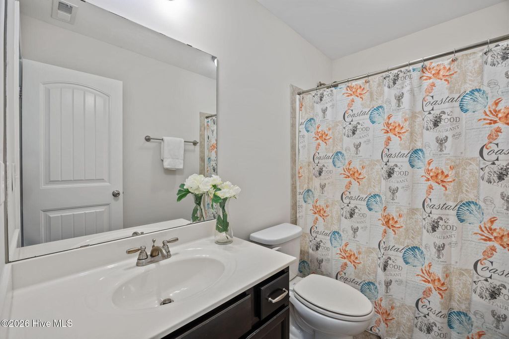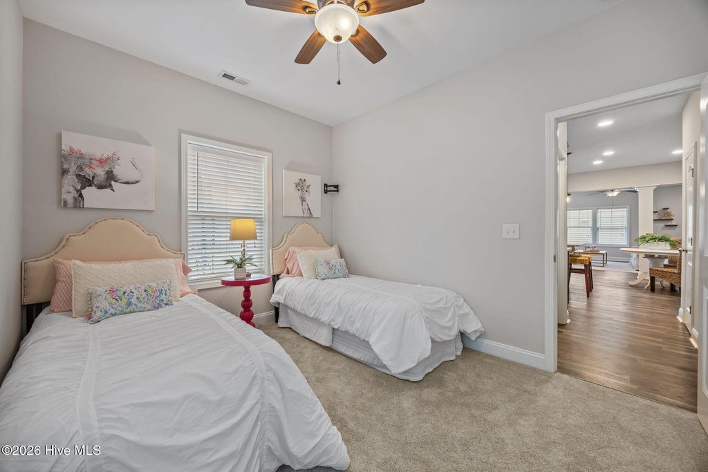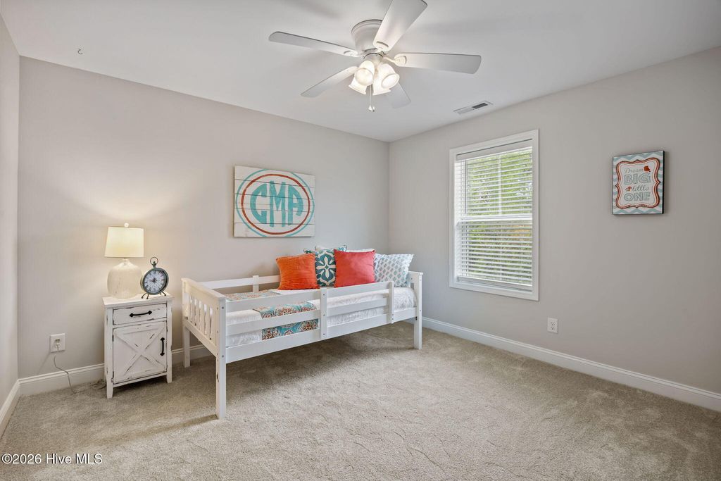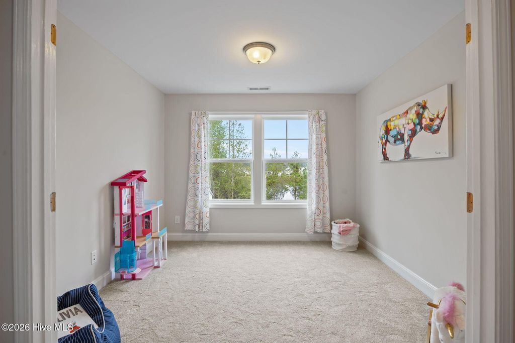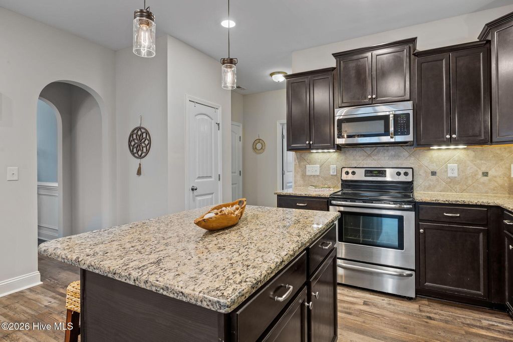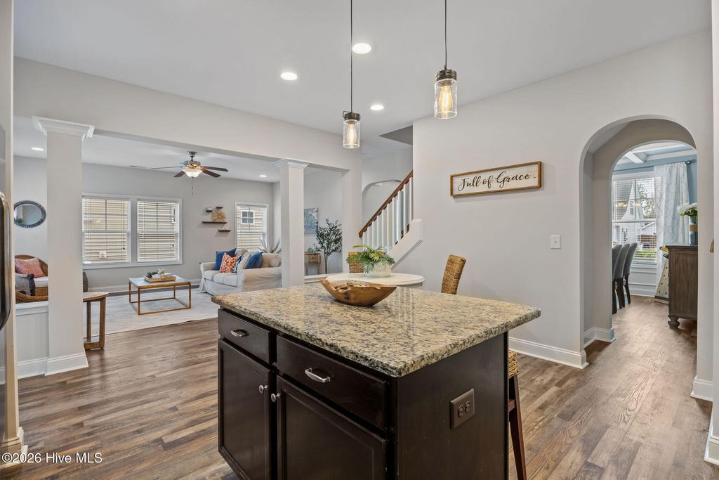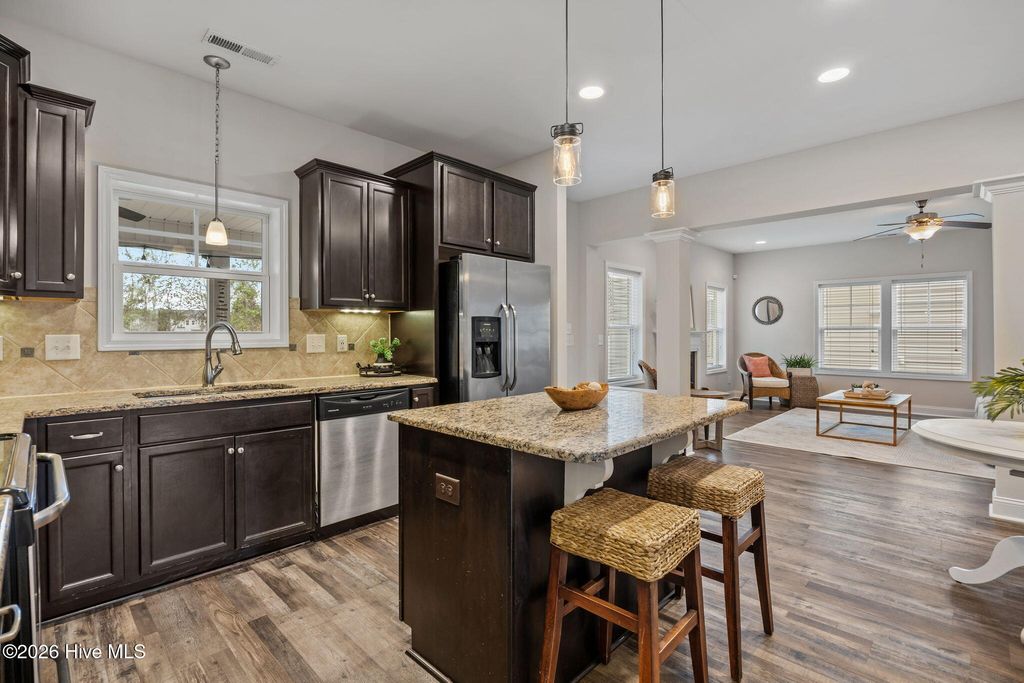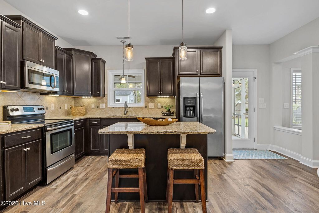 Welcome to this fresh and beautiful coastal retreat in one of Wilmington's most desirable locations! Featuring 5 spacious bedrooms, including one downstairs bedroom with full bath. A versatile bonus/playroom, plus a private office and 4 full bathrooms, this rare pond front home offers great views and privacy with both comfort and flexibility for today's lifestyle. Step outside to your private oasis--a large fenced backyard complete with an expanded screened in porch and an oversized patio overlooking a serene pond. Large clean shed added in 2022. Whether you're entertaining guests or enjoying a quiet evening, this outdoor space is truly special. Beautiful landscaping and charming stone accents create exceptional curb appeal, while fresh paint and new LVP flooring and carpet make the interior feel bright, modern, and completely move-in ready. Dining room features stunning coffered ceilings! This original owner home features sturdy 2x6 construction with radiant barrier roof sheething, designed for extra comfort. Sellers also added an extra HVAC return upstairs in its pre-construction phase. Outfitted with several smart features including irrigation and Ecobee thermostats and garage door, it also has multiple tech and convenience features. Home is set up for ring security system and base station conveys. Covered porch has outdoor smart tv with cover that conveys, as well as playroom tv upstairs. Kitchen features electrical outlets with USB ports for easy charging and the Great room is pre-wired for surround sound with Smart Box structured wiring with conduit, CAT5 Panel Wiring and RG6 CATV. Ideally located just minutes from Mayfaire-- with shopping, dining, and entertainment, and only a short drive to Wrightsville Beach, this home perfectly blends convenience with coastal living.