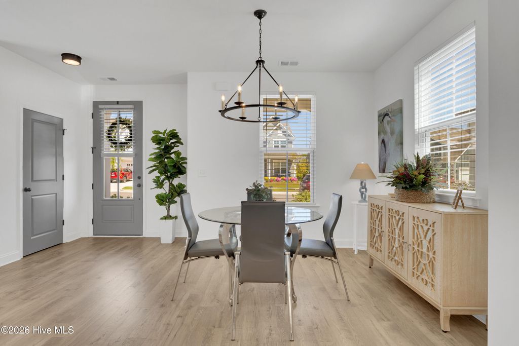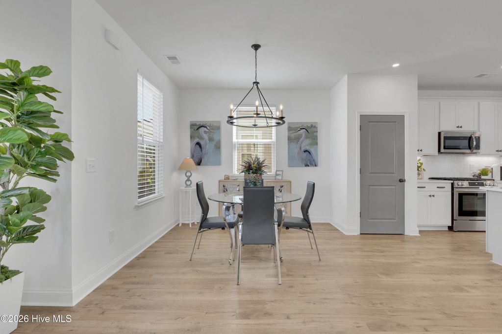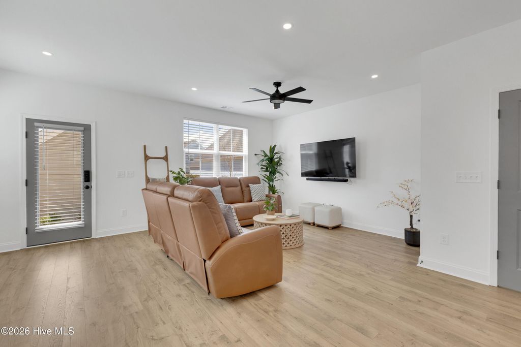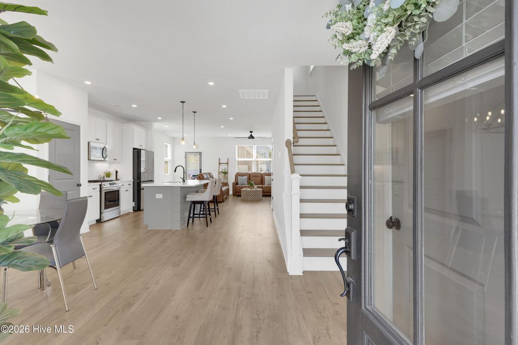Welcome to this well-kept 3-bedroom, 2.5-bath home in Riverlights. With a functional two-story layout, inviting outdoor spaces, and a bright open main living area, this home offers a comfortable mix of style and everyday livability. The first floor features LVP flooring, recessed lighting, and an open kitchen, dining, and living space that flows nicely for both daily life and entertaining. The kitchen includes quartz countertops, a large island, pantry, and stainless steel appliances, including a gas stove. A half bath is also conveniently located on the main level. Upstairs, all three bedrooms and two full bathrooms are tucked away for privacy. The primary suite includes double vanities and a walk-in shower, and one of the guest bedrooms has access to the covered balcony. Outside, you'll find a covered front porch, covered balcony, back patio, fenced backyard, and detached garage. Located in the Riverlights community, this home also offers access to neighborhood amenities including a pool, pickleball, and community center, with convenient access to downtown Wilmington and Carolina Beach.