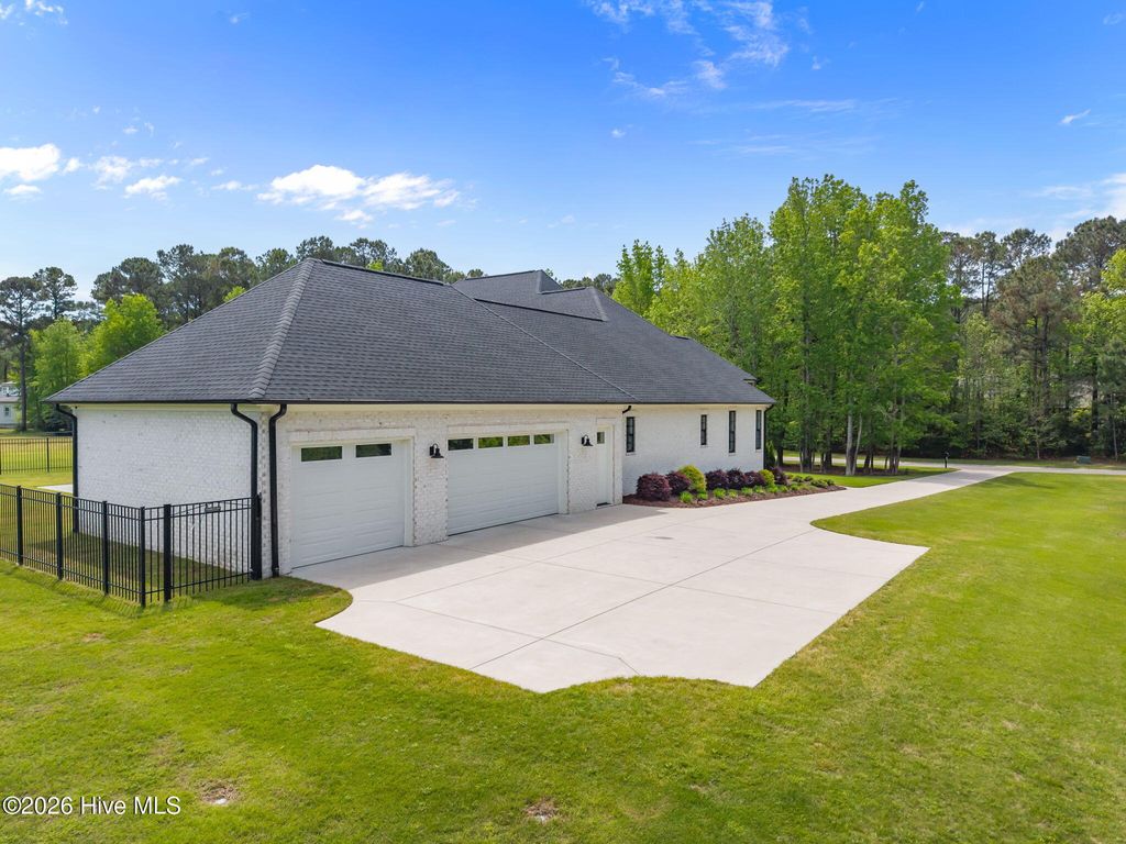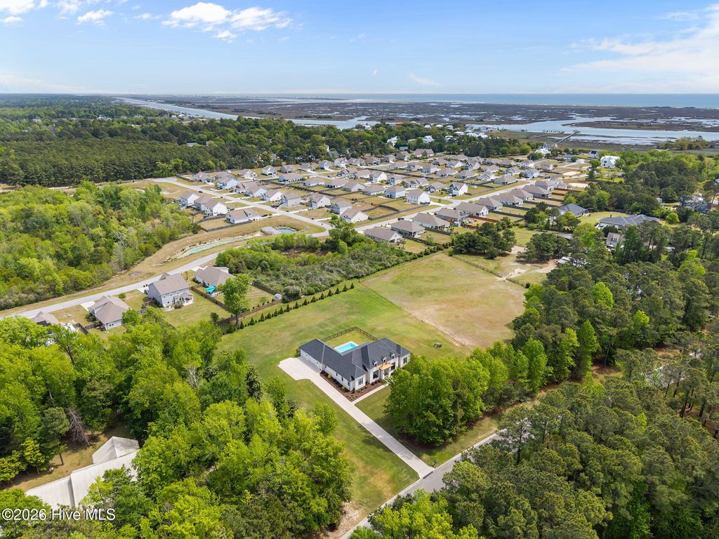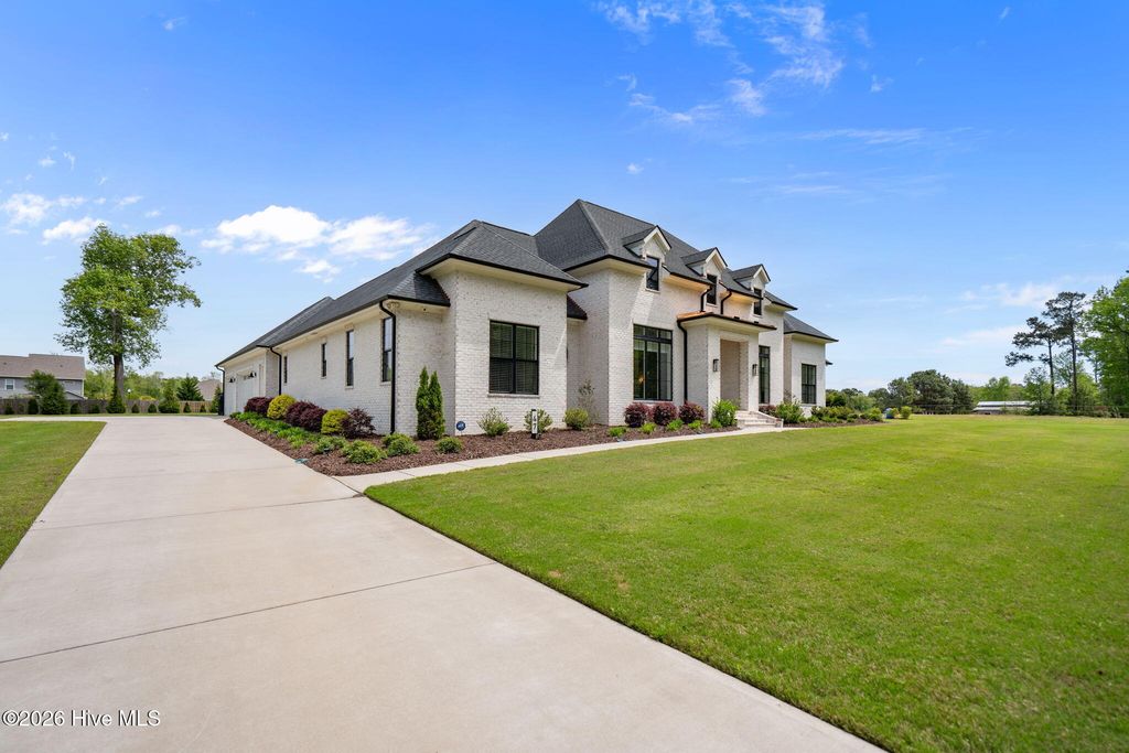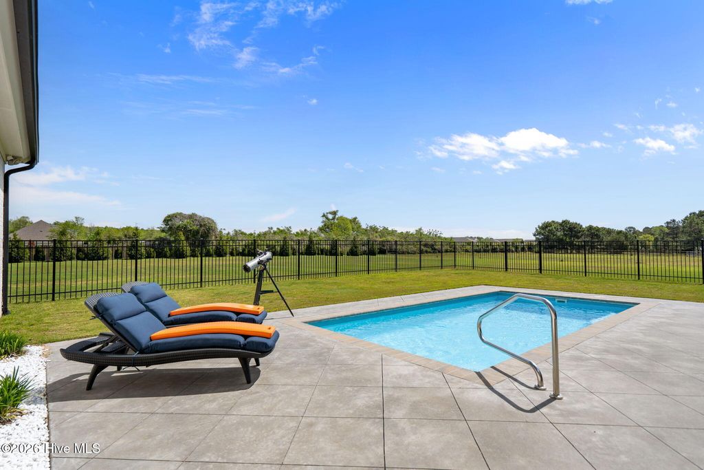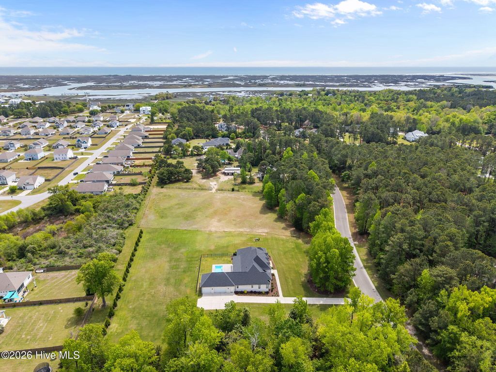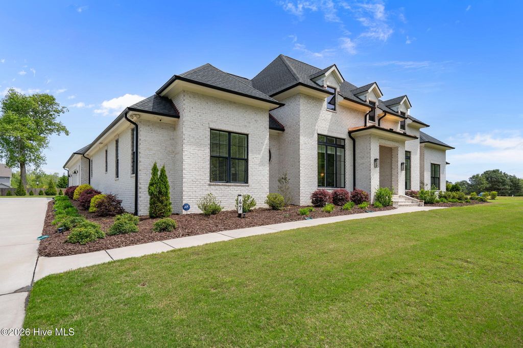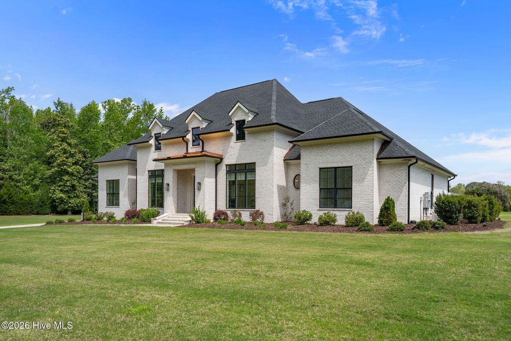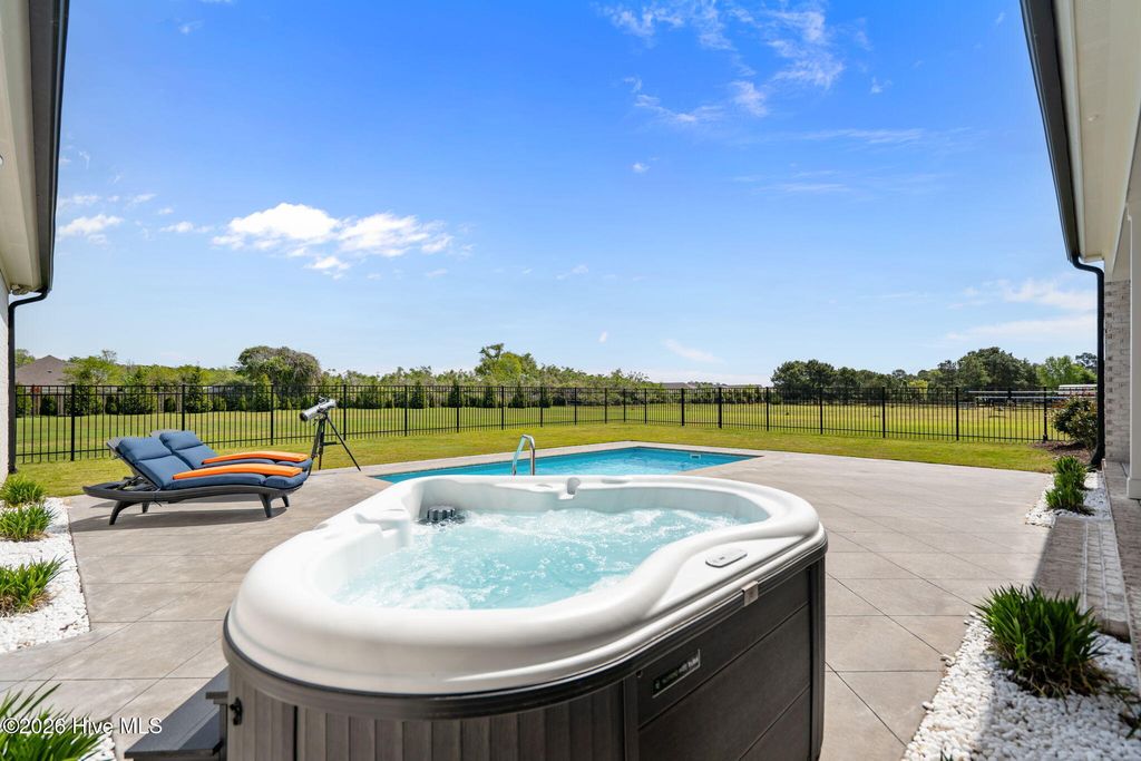 Welcome to a truly exceptional custom-built residence where timeless design meets modern luxury. The white brick, architectural rooflines & inviting front porch set the tone for what lies within. Inside, soaring ceilings, 8' doors, expansive windows & impeccable finishes a grand and warmly inviting feel. Every detail has been carefully curated, showcasing custom craftsmanship throughout and a thoughtful floor plan. The heart of the home is the stunning chef's kitchen, w/huge quartz island. Custom cabinetry features glass-front uppers, abundant storage & high-end appliances including a gas cooktop, wall ovens, and a wine refrigerator. The primary suite is a private sanctuary, offering spacious proportions and refined finishes. The spa-inspired bath elevates daily living w/ luxurious soaking tub, dual vanities, & a spectacular walk-through shower, creating a serene retreat. Large custom closets complete the suite with both style and function. Additional bedrooms are generously sized with access to beautifully finished baths, while a dedicated office provides flexibility for working from home or a quiet retreat space. A well-designed laundry room and ample storage enhance everyday convenience, while the home's layout offers the perfect balance of openness and privacy. Step outside to experience true resort-style living. The covered rear patio overlooks a stunning in-ground pool, complete w/ hot tub. Expansive lush yard w/ wifi controlled irrigation, offering exceptional space for animals, gardening, recreation, or simply enjoying unmatched privacy. Residents of Whitebridge enjoy an equestrian-friendly atmosphere along with a community pool, tennis courts, scenic bird sanctuary, ponds, and nature trails. Whitebridge offers the perfect blend of luxury living and an active outdoor lifestyle, all while being just minutes from shopping, dining, top-rated schools, and with easy access to Topsail Island beaches and coastal attractions.