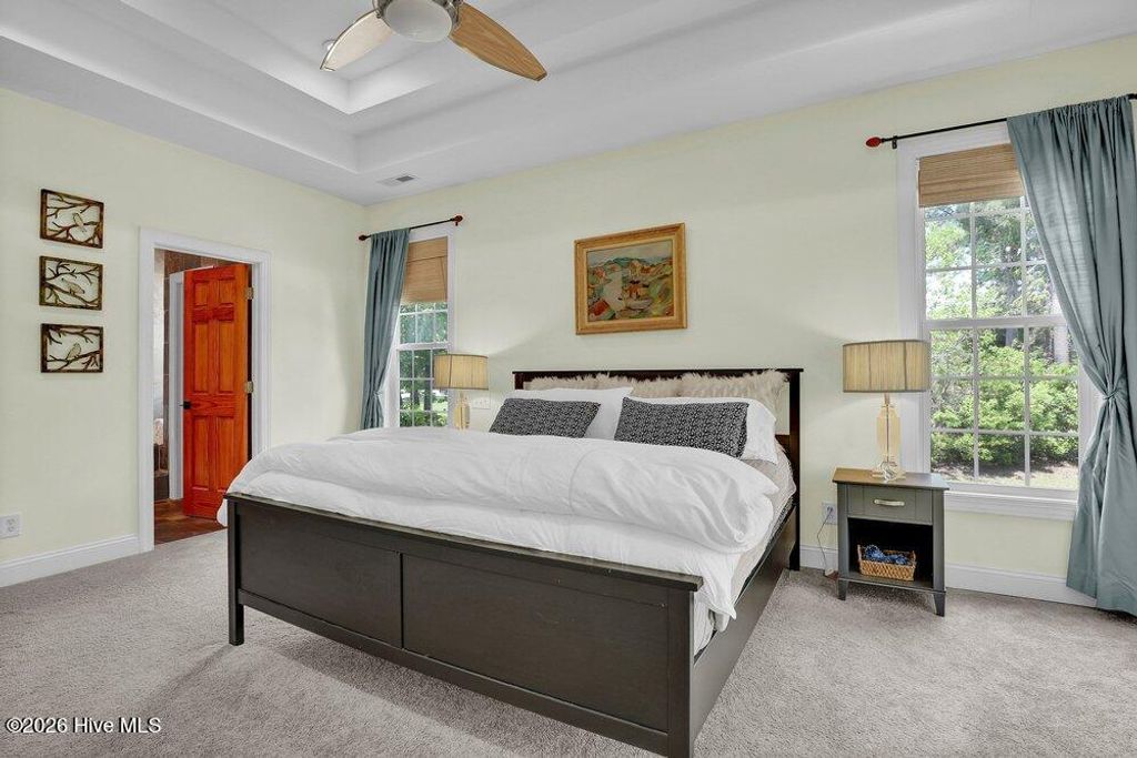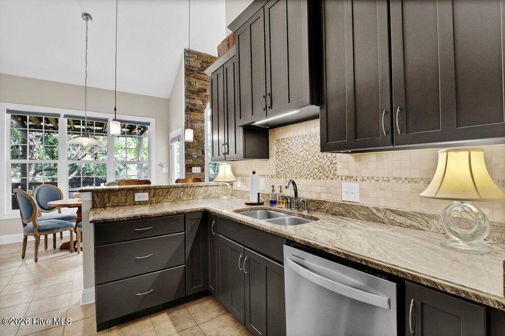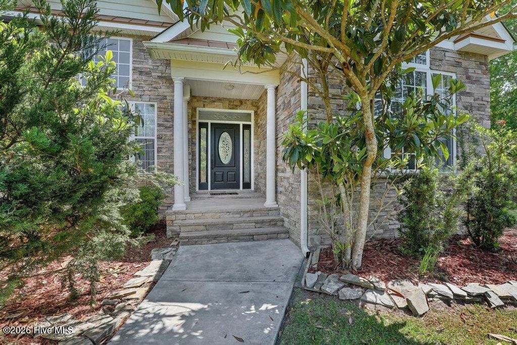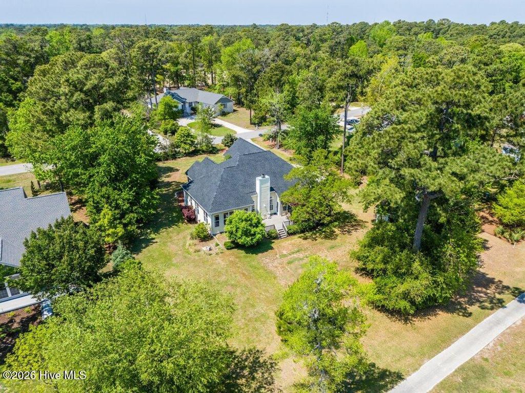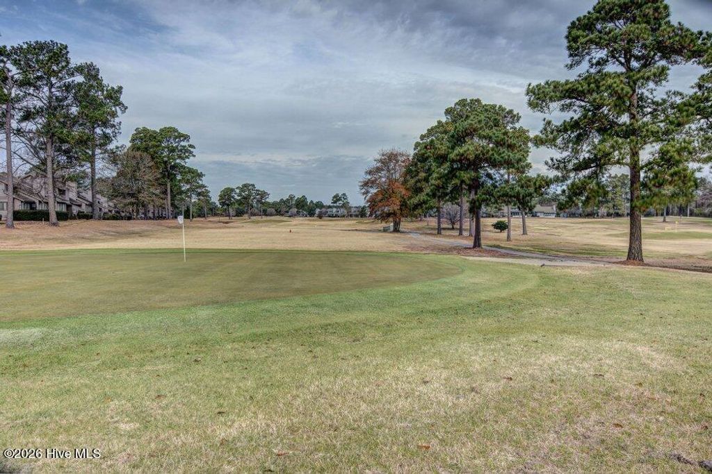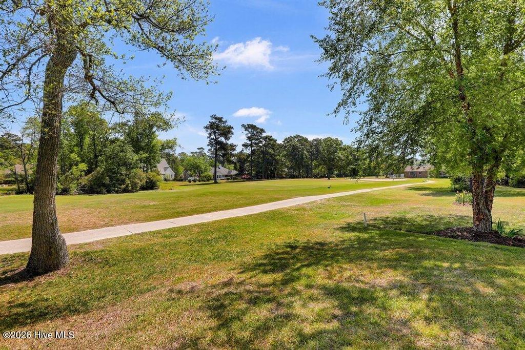 Front-row golf course views and easy one-story living come together in this custom-built home on the 4th green of Olde Point. Set on a spacious 0.59-acre lot, this 3 bedroom, 2 bathroom home includes a 3-car garage and a large yard with a detached wired shed for added flexibility. The home also features a sealed crawl space with a dehumidifier and a brand-new roof. Inside, Australian cypress hardwood flooring runs throughout the living room, formal dining room, home office, and flex space. The living room features a wood-burning fireplace with a floor-to-ceiling stacked stone accent wall, with matching stacked stone continuing into the formal dining room. The kitchen maintains definition within a transitional floor plan and includes modified dark Shaker-style cabinets with applied vertical molding, ogee-edged granite countertops, a tile backsplash, a pantry, a hop-up counter for stools, and an attached breakfast nook. The primary suite offers a tray ceiling, a custom walk-in closet, and a bathroom with floor-to-ceiling slate tile, a whirlpool tub, and a walk-in shower. The second bathroom has been renovated. A home office and a flex room with access to the rear deck provide versatile space. The partially-covered deck overlooks the golf course, greenery, and a pond, creating a scenic outdoor setting. Boat ramp access and use of the community swimming pool, clubhouse, golf course, and tennis courts are available for an additional expense.