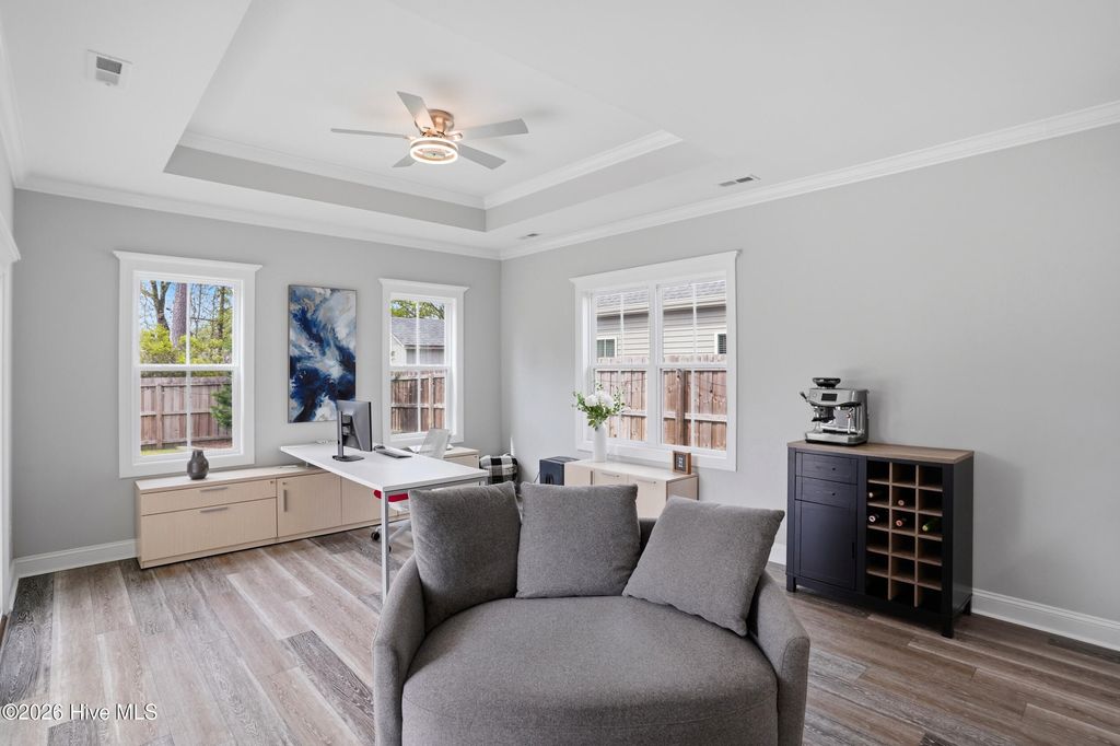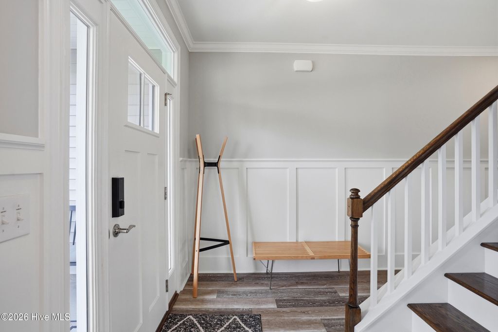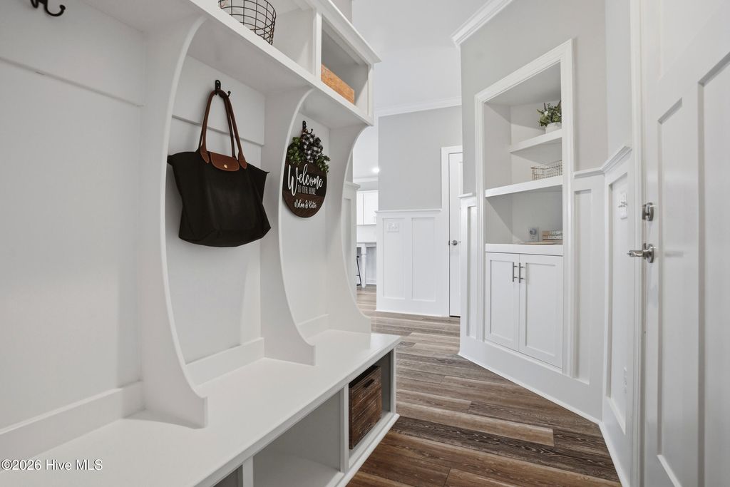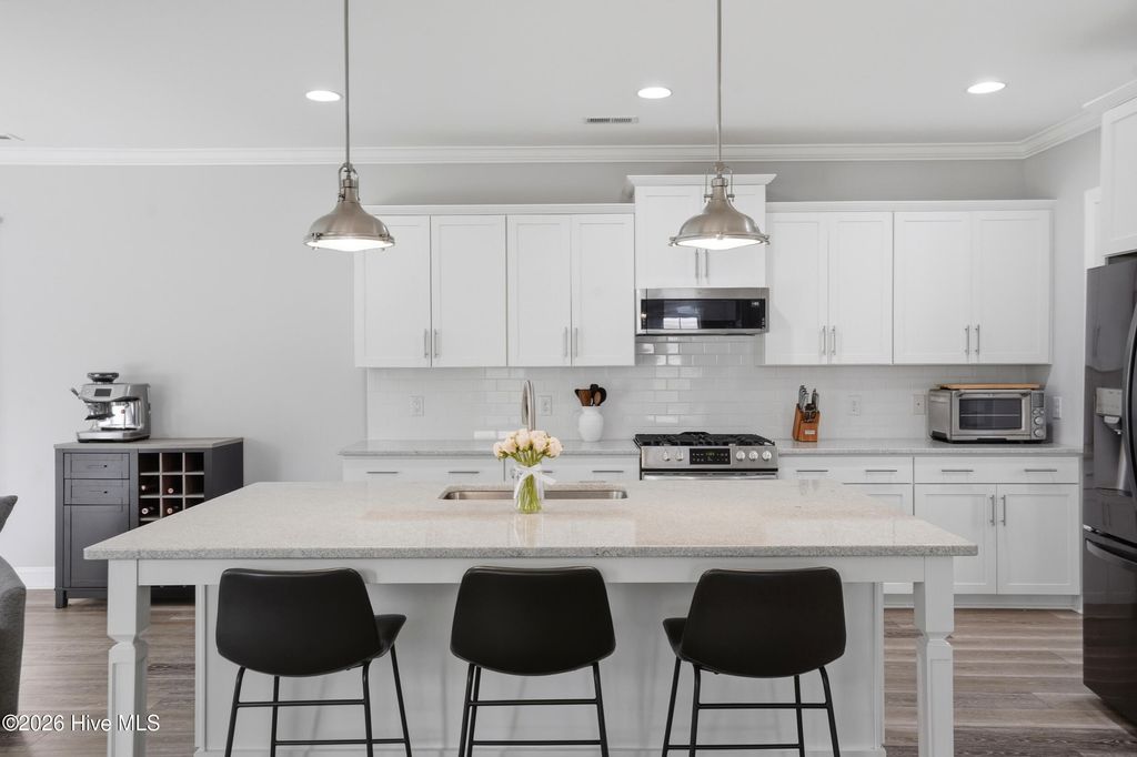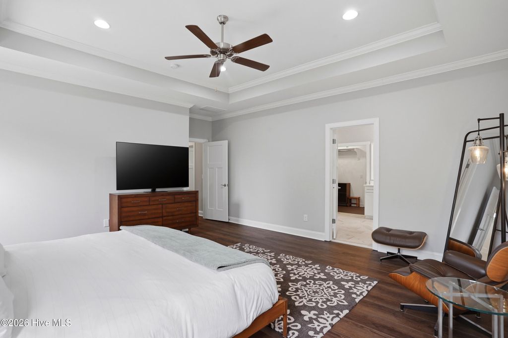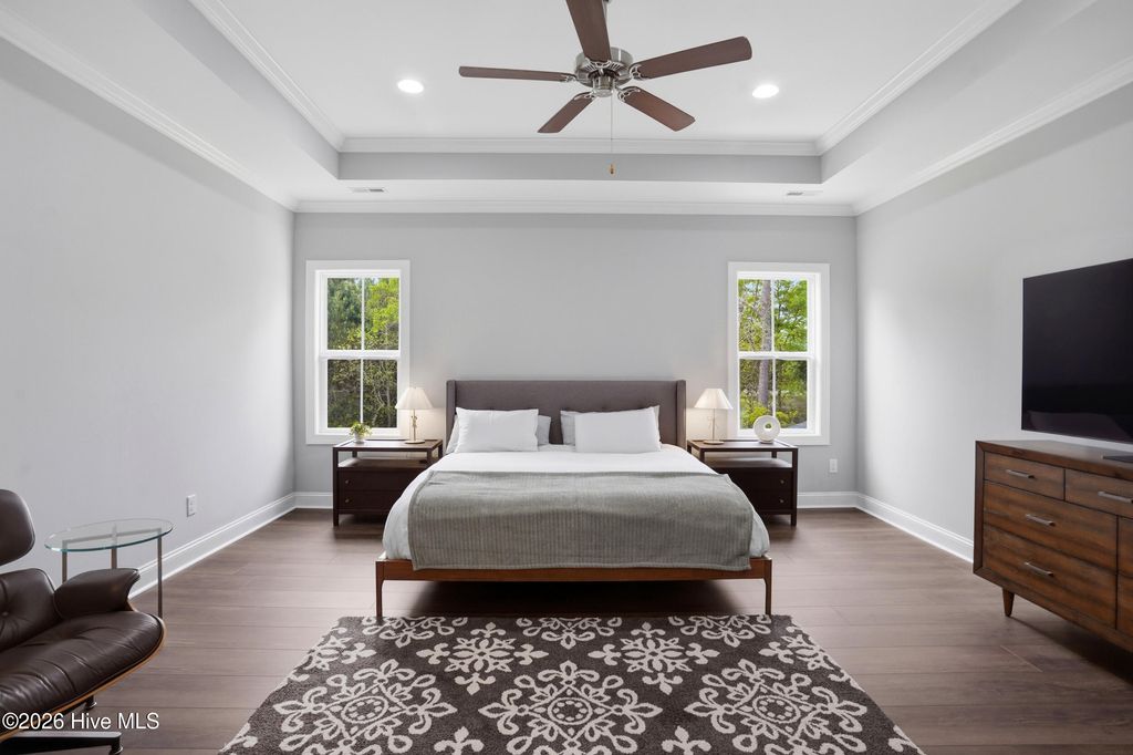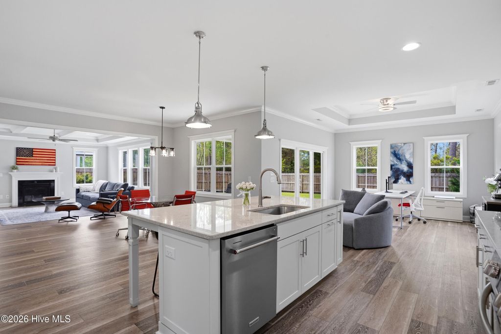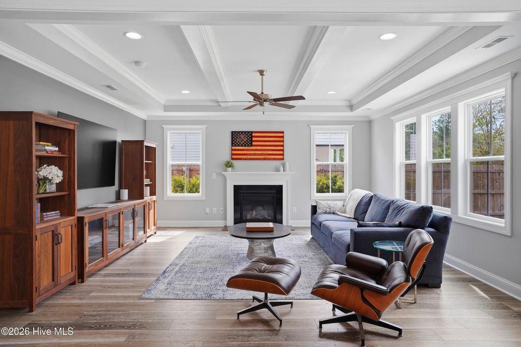 Experience the perfect blend of coastal tranquility and sophisticated modern living at 30 Man O War Lane, a stunning Hall Crest floorplan crafted by the award-winning Hardison Building Company. Located in the highly sought after community of The Sanctuary at Forest Sound, this home is situated just a mile from the Intracoastal Waterway, offering an unparalleled lifestyle for those who love the water. From the moment you step onto the charming rocking chair front porch, you are greeted by an interior designed for both grand entertaining and quiet relaxation, featuring expansive open spaces and high end finishes throughout. The heart of the home is a gourmet chef's kitchen, anchored by a massive center island, classic tile backsplash, and premium stainless-steel appliances including a natural gas range. This space flows seamlessly into a magnificent great room, where the warmth of a natural gas fireplace is complemented by elegant beam accented ceilings. Large windows invite natural light to dance across the stylish flooring, while a spacious covered rear porch extends the living area outdoors, overlooking a fully sodded and irrigated yard perfect for alfresco dining in the coastal breeze. Personal luxury awaits in the primary master suite, a true sanctuary featuring trey ceilings and a spa inspired bathroom. This private retreat boasts a fully tiled walk-in shower, dual quartz vanities, and a massive walk-in closet with convenient direct access to additional storage. The second floor provides ample space for family or guests with three additional bedrooms and two full bathrooms; all finished with the same attention to detail as found on the main level. Beyond the doorstep, the lifestyle offered by this location is second to none. Residents of The Sanctuary at Forest Sound will soon enjoy the convenience of dedicated RV and boat storage, reflecting the community's maritime spirit. Perfectly positioned in the heart of Hampstead, you are only fifteen minutes from the pristine sands of Topsail Island and a short drive to the vibrant shopping and dining of Wilmington. With a professionally landscaped lot and a thoughtful design, this home is not just a place to live; it is the ultimate backdrop for your coastal North Carolina chapter.