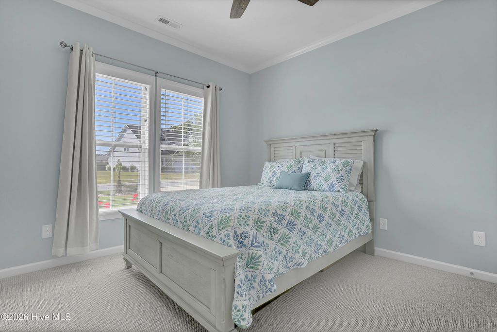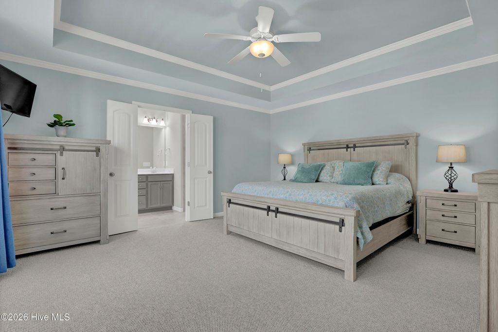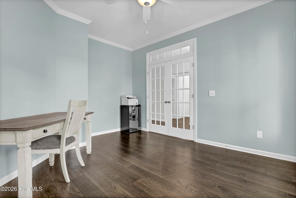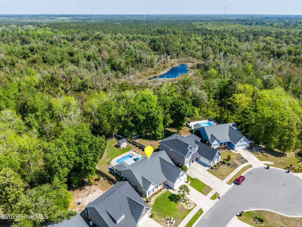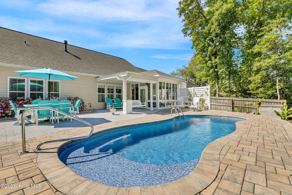 Welcome to this enchanted southern gem, situated in a cul-de-sac in the heart of the coastal town of Hampstead. On your arrival, you will admire the manicured landscaping which furthermore highlights the aesthetic appeal. As you enter the large foyer, you will immediately admire rich custom trim work that will follow you with each step. On your left is situated an office with beautiful French doors and transom. A large and bright living room with a vaulted ceiling and built-ins welcomes you and feels as though it was made for cozy evenings around a fireplace with a nice glass of wine, reading your favorite author, playing family games, conducting deep conversations or just watching movies. The open concept connects the living room with the gourmet kitchen which offers custom-built executive cabinetry with under-cabinet lighting which provides a wealth of storage space, glistening granite counter-tops, stainless-steel appliances, a working island with a double sink, a pantry and a dining room with wainscoting. A private Master Suite includes a tray ceiling, a double vanity, a custom tiled shower, a garden tub and a walk-in closet. On the opposite side of the home, you can explore a spare bedroom with a full bathroom and a linen closet. The large laundry room offers a sink, a countertop for folding laundry, storage cabinets, as well as a storage shelf. Two coat closets complete the main level. Upstairs is located a second Master Suite with a walk-in closet and a full bathroom. An over 200 square foot large walk-in attic is ready for all your holiday decorations and can be easily finished and used as a bonus entertainment room or a man cave. Through triple sliding doors you will enter a lovely Carolina sunroom and enjoy your Southern tea while overlooking this private piece of paradise. Invite your friends over to spend some time on a swing under a custom-built pergola, grill some Carolina BBQ, take a dip in your own saltwater pool or do some handywork in your garage and a storage/workshop room or just get wild with your gardening skills. Looking for more fun and activities? Whether you decide to gather with neighbors at the community pool and club house or hit a ball on some local golf courses or take a short drive and cross the bridge to Topsail island with highly rated beaches to relax and simply bask in the sun. This property is Southern Living at its finest! The absolutely amazing location of this property is another attractive feature to consider. Situated along the sparkling Intracoastal Waterway, with a short commute to the fabulous Kiwanis Park, highly rated schools, shopping, restaurants, many golf courses, ICW access, Topsail Island and Wrightsville beaches, and the city of Wilmington with a world class University, a tremendously growing network of businesses, and a historic river district. The sellers are offering a one-year home warranty.