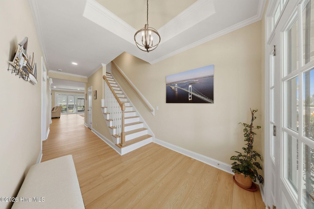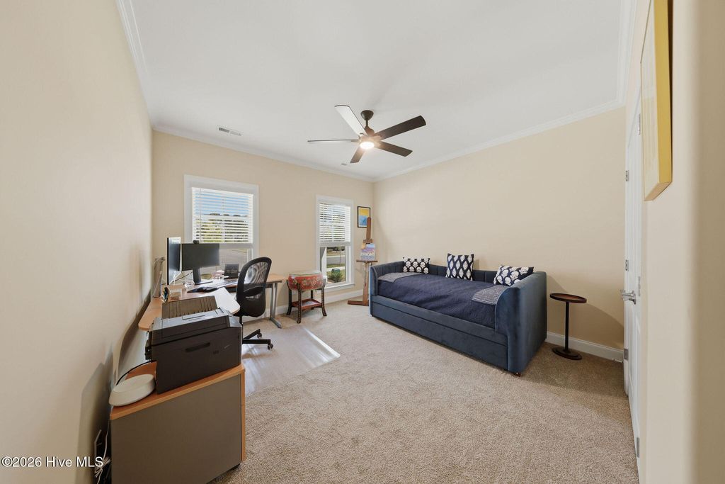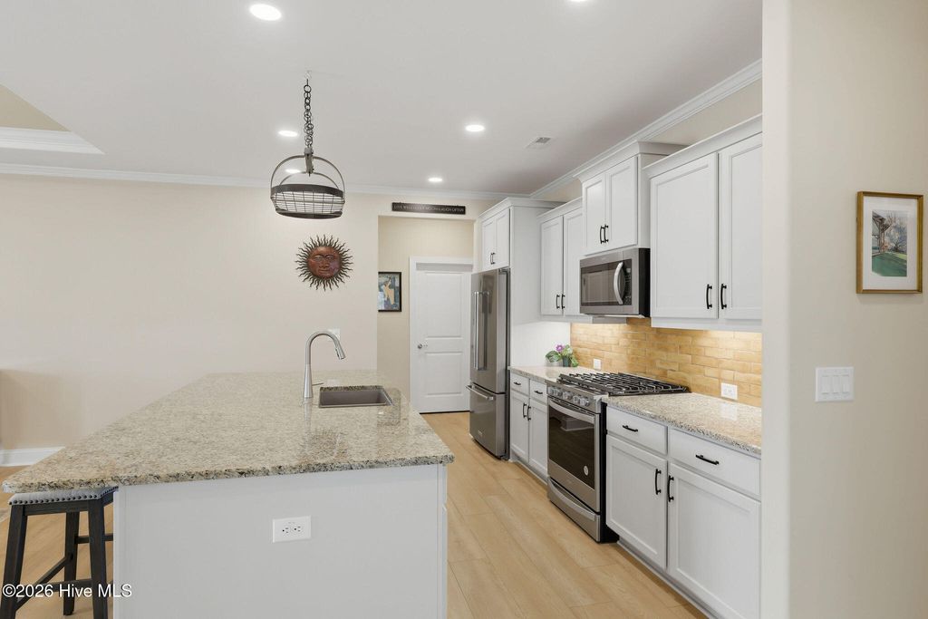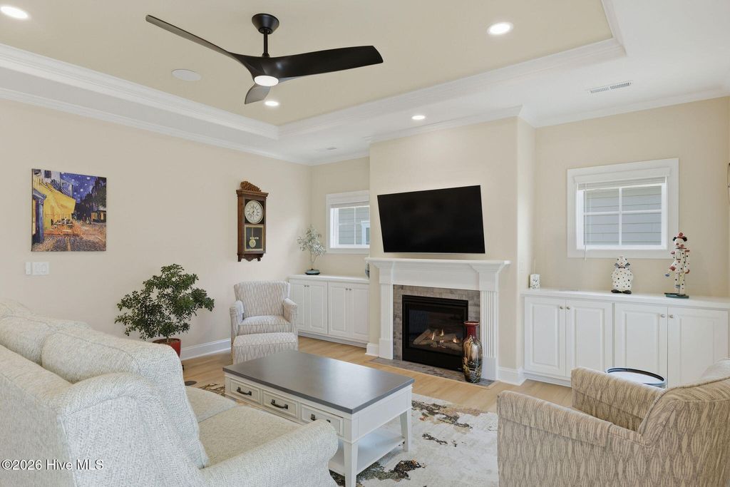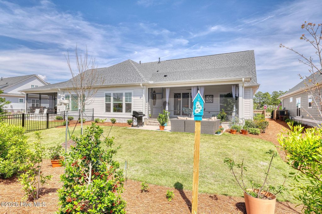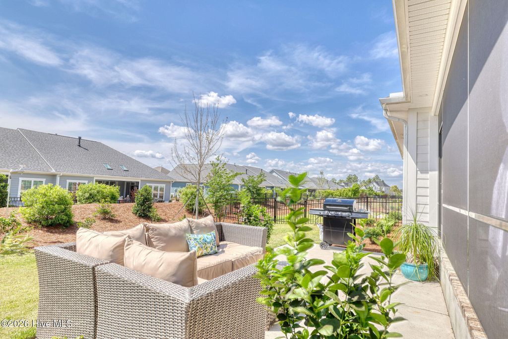 Welcome to low-maintenance living at its finest in this stunning, like-new duplex-style townhome in the RiverLights community. Built by Trusst Builder Group, the highly sought-after Linville floor plan offers a thoughtful blend of style, comfort, and functionality. Ideally positioned with an east-west orientation, the home is filled with natural light throughout the day while providing comfortable outdoor spaces in the afternoon. Designed for primarily one-level living, the main floor features a private primary suite with a spacious walk-in closet, dual-sink vanity, and a beautifully designed walk-in tile shower with a seamless, no-step entry and frameless glass door. A secondary bedroom, full guest bath, and a versatile flex space--perfect for a home office--complete the first floor. The open-concept living area is ideal for both everyday living and entertaining, highlighted by custom built-ins, tray ceilings, crown molding, and a cozy gas fireplace. The gourmet kitchen is a standout, featuring a large center island with an extended breakfast bar and additional storage, granite countertops, soft-close cabinetry, a 5-burner natural gas range, composite sink, stylish brick-look tile backsplash, under-cabinet lighting, and a custom pot rack above the island. A lanai slider leads to a spacious screened porch, perfect for morning coffee or evening gatherings, with an expanded concrete patio beyond for additional outdoor enjoyment. Upstairs, guests will appreciate a private suite with a full bath, generous walk-in closet, and access to a large floored attic space--ideal for storage. Additional highlights include a two-car garage with epoxy flooring, utility sink, comfort-height toilet in the primary bath, added electrical outlet in the living room, and thoughtfully designed landscaping, including a backyard shade tree for added comfort during warmer months. Enjoy truly low-maintenance living, with the HOA covering exterior maintenance, landscaping, irrigation, building upkeep, pressure washing, termite bond, and a master insurance policy. RiverLights offers an exceptional lifestyle with access to a 38-acre lake, a scenic 3.4-mile walking and biking trail, and a vibrant mixed-use district featuring restaurants, a bike shop, nail salon, and more. Community amenities include a clubhouse with billiards, two fitness centers, two pools, dog parks, playgrounds, bocce courts, and pickleball. With its ideal layout, high-end finishes, and move-in ready condition, this home offers the perfect blend of luxury, convenience, and coastal living in one of the area's most desirable communities.