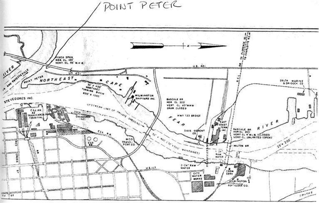 7.8 plus acre Riverfront Development Tract on the Cape Fear Overlooking Downtown Wilmington Waterfront. Prime Location!! Centrally located directly across from the Convention center and PPD Headquarters. Approx 2100 feet of water frontage. Point Peter has frontage on Cape Fear and Northeast Cape Fear Rivers. Zoned as Light Industrial so great location for marine facilities. This land had been used as a marine salvage and bulkhead business so there is a lot of that still on site. The potential for this location is what is to be evaluated. and GREAT NEWS.water and sewer services brought across to this western side of the Northeast Cape Fear. MER 2015)