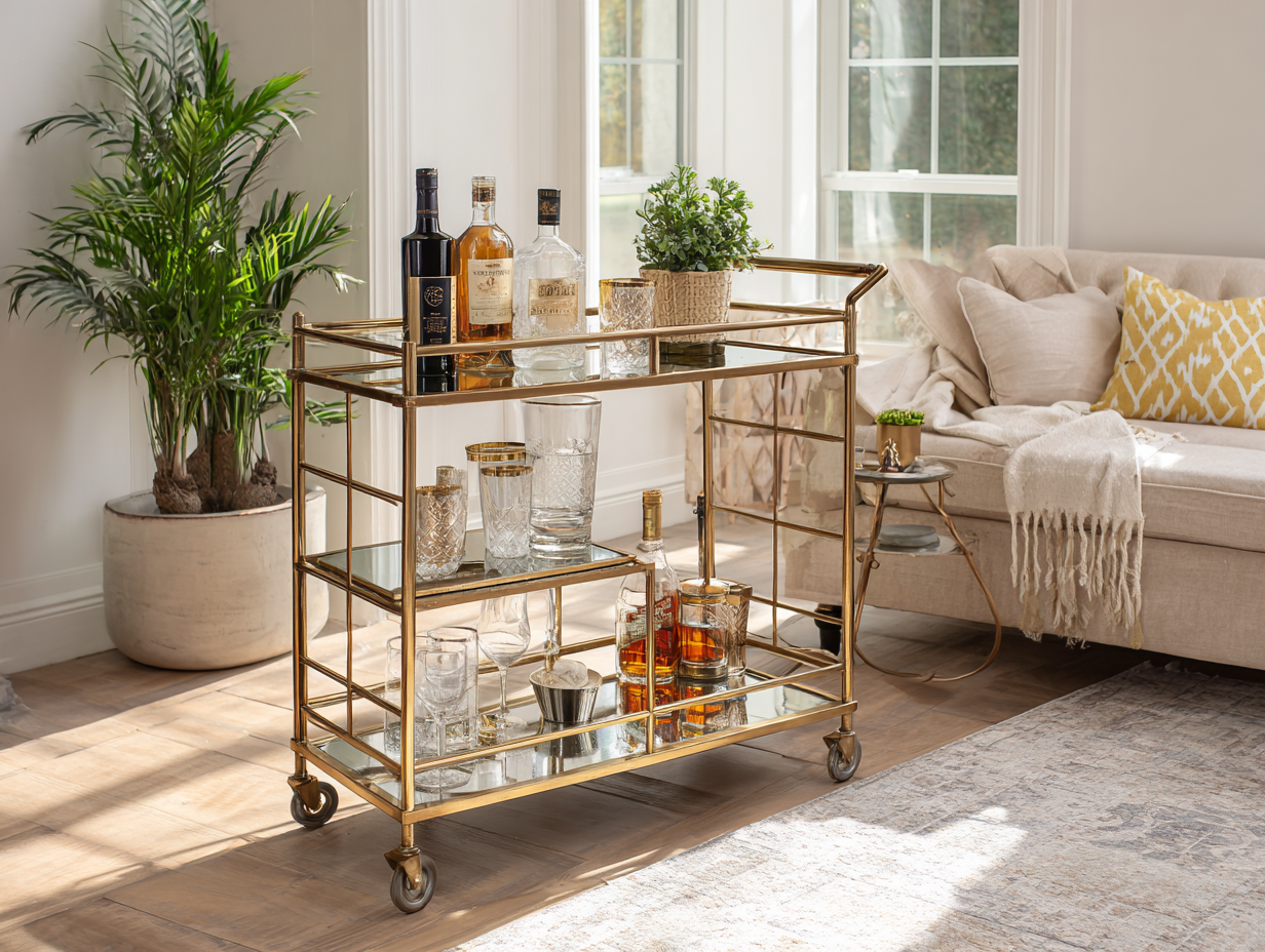 The living room is often the easiest place to experiment with Neo Deco. Begin with one or two strong focal points and build out from there. A great starting move is to introduce a sculptural drinks station that feels both practical and glamorous. For example, an antique bar cart with a warm metal frame, mirrored shelves, and space for glassware immediately sets a Deco tone without overwhelming the room.