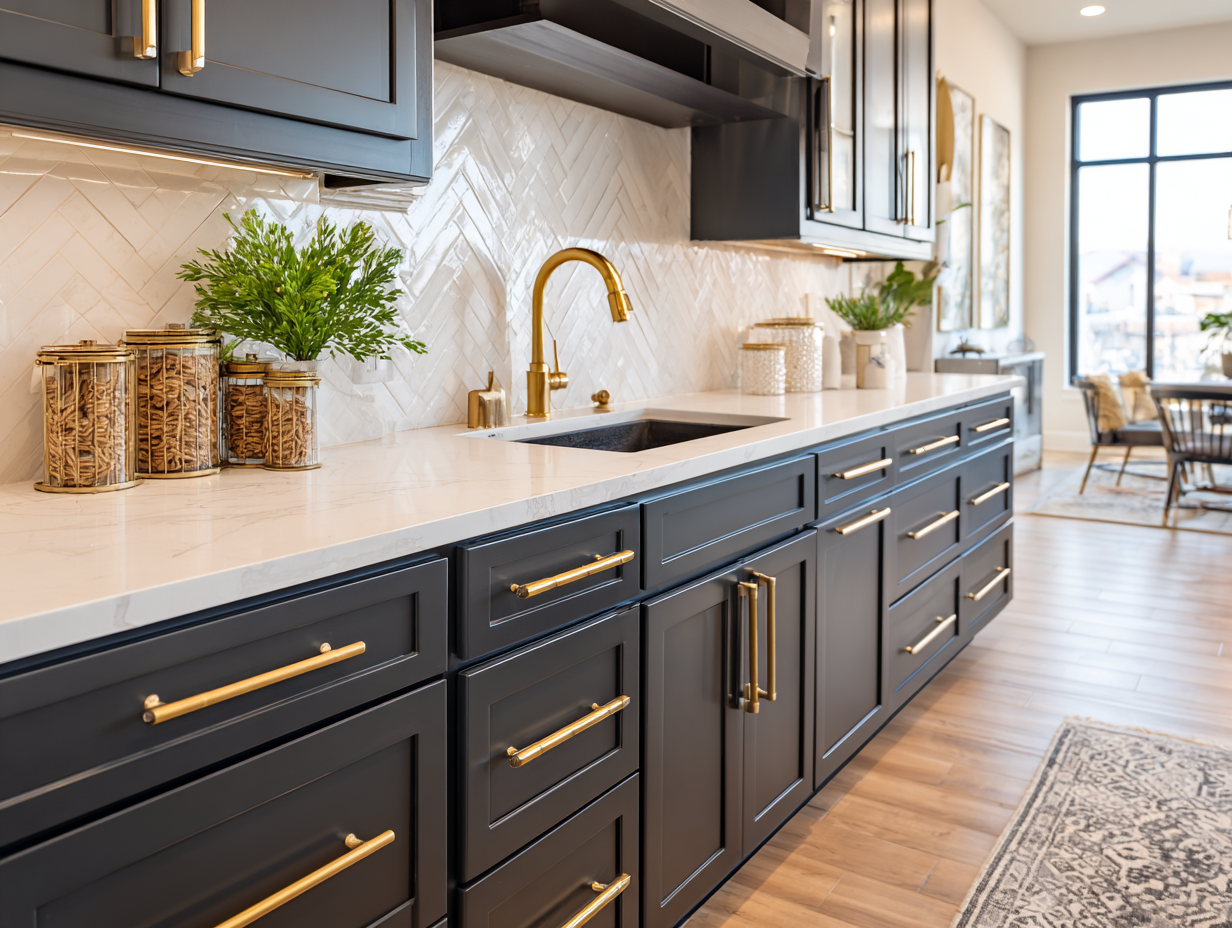 To reinforce that brass aesthetic, look for cabinet pulls in satin or brushed brass with a simple, elongated shape. Sets designed with clean edges and subtle detailing bring just enough structure to feel Deco-inspired without looking too busy.