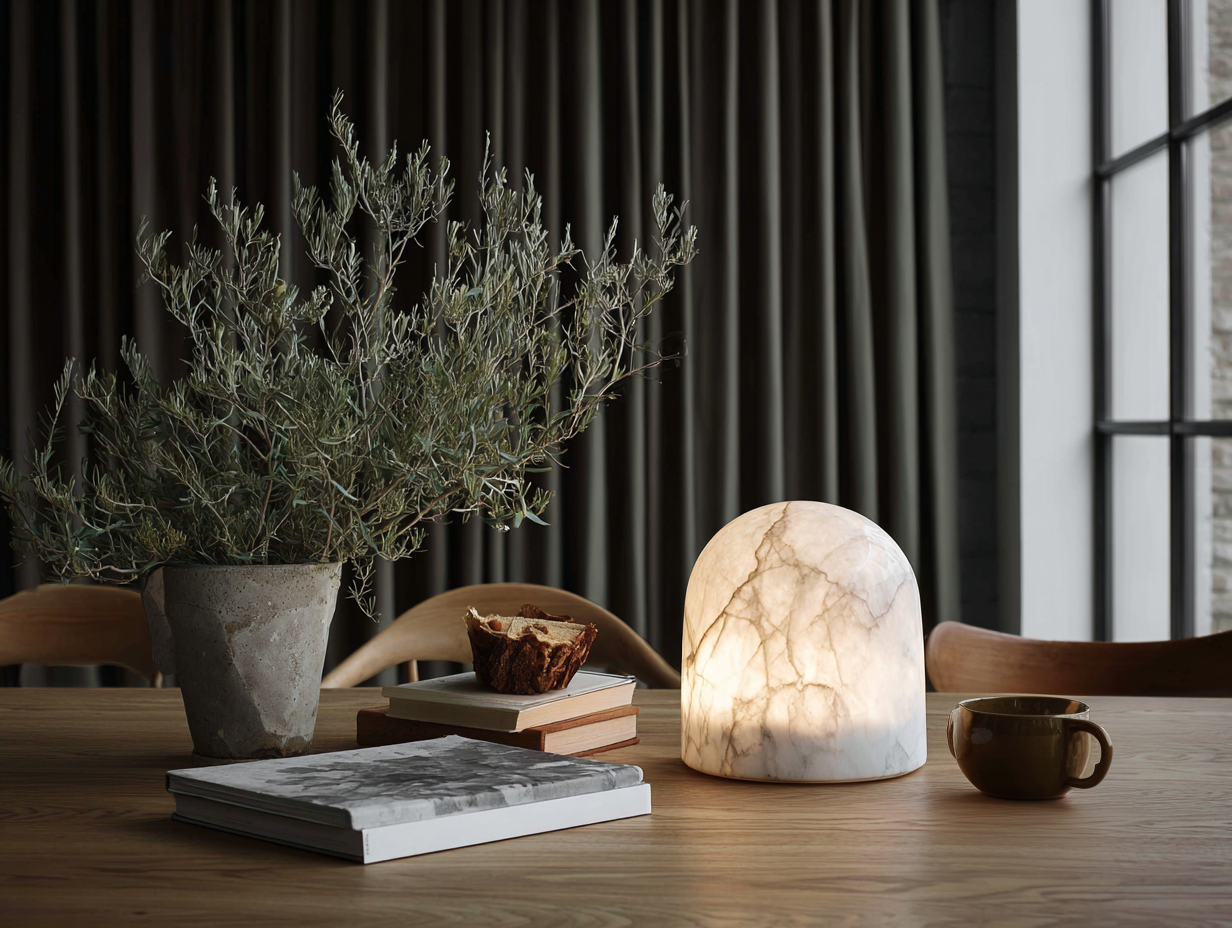 You don’t have to stop at ceiling fixtures. A sculptural alabaster table lamp with a simple shade can bring height and elegance to a console table or nightstand, especially when paired with metal or marble accessories nearby. Its clean silhouette and rich materials fit perfectly into the Neo Deco vocabulary.