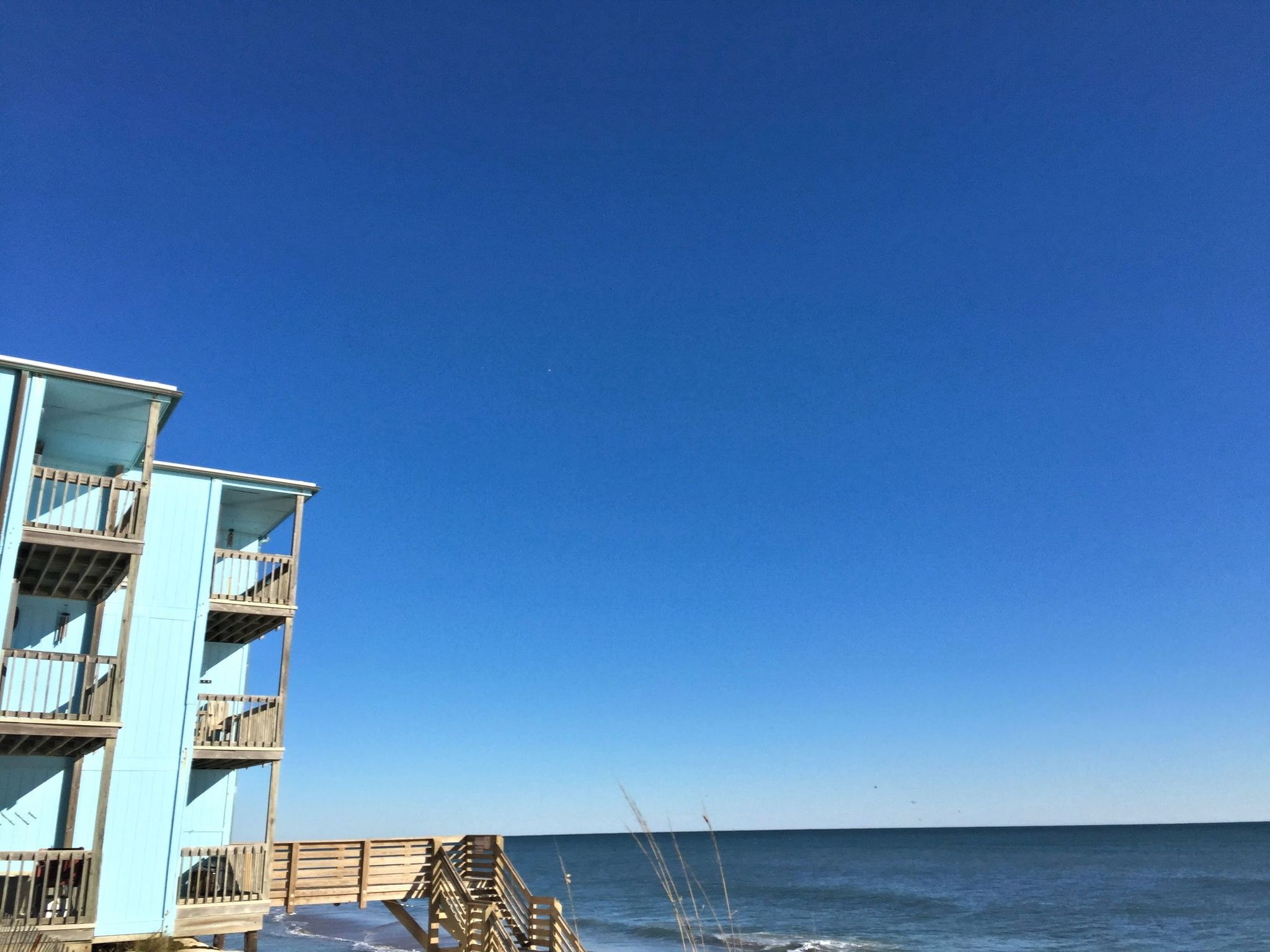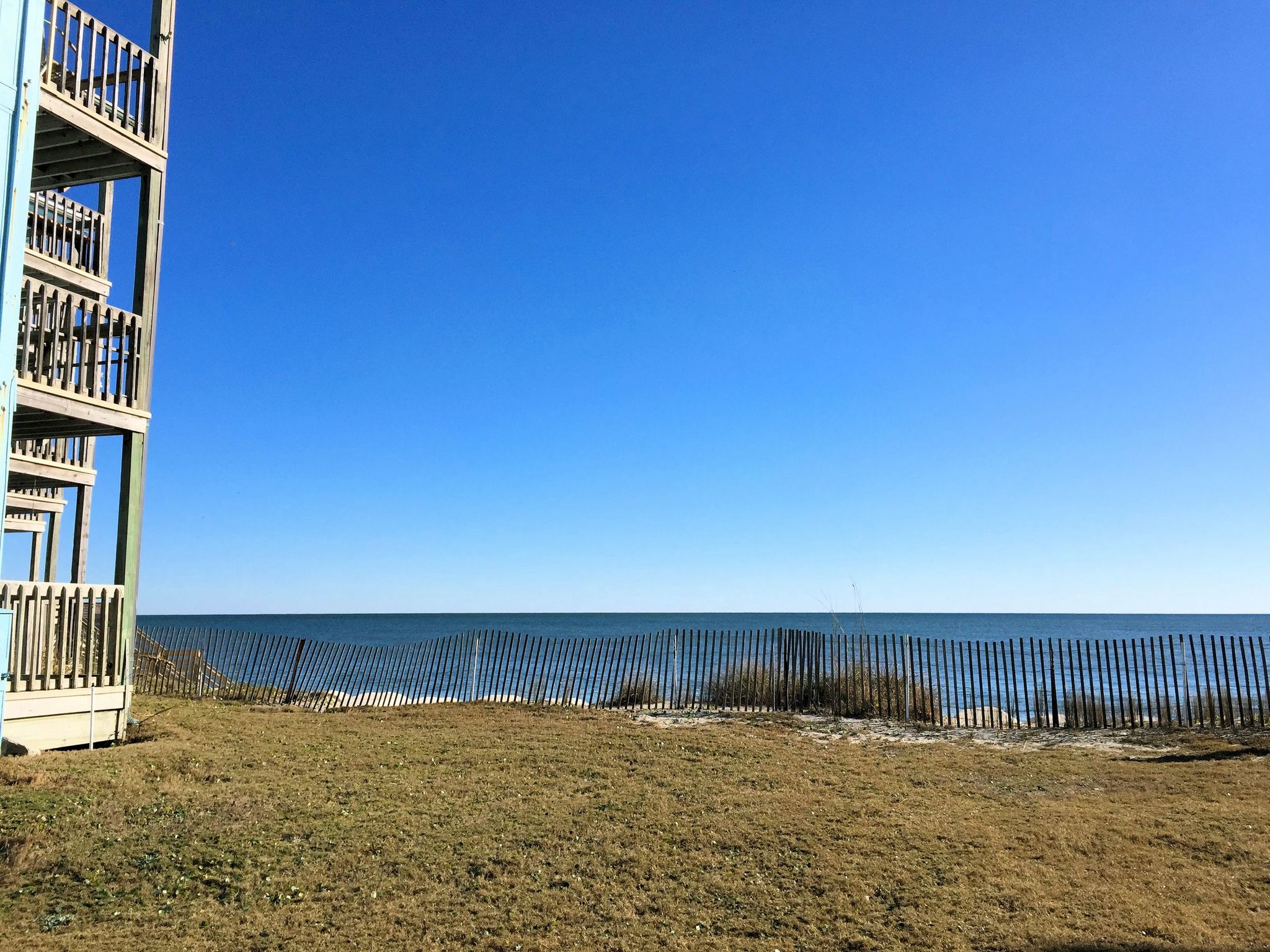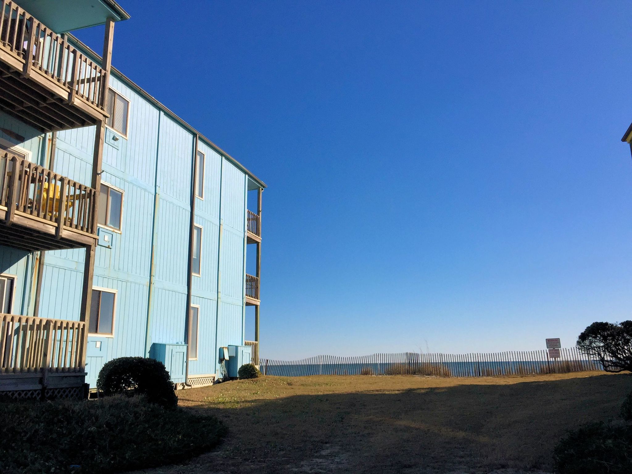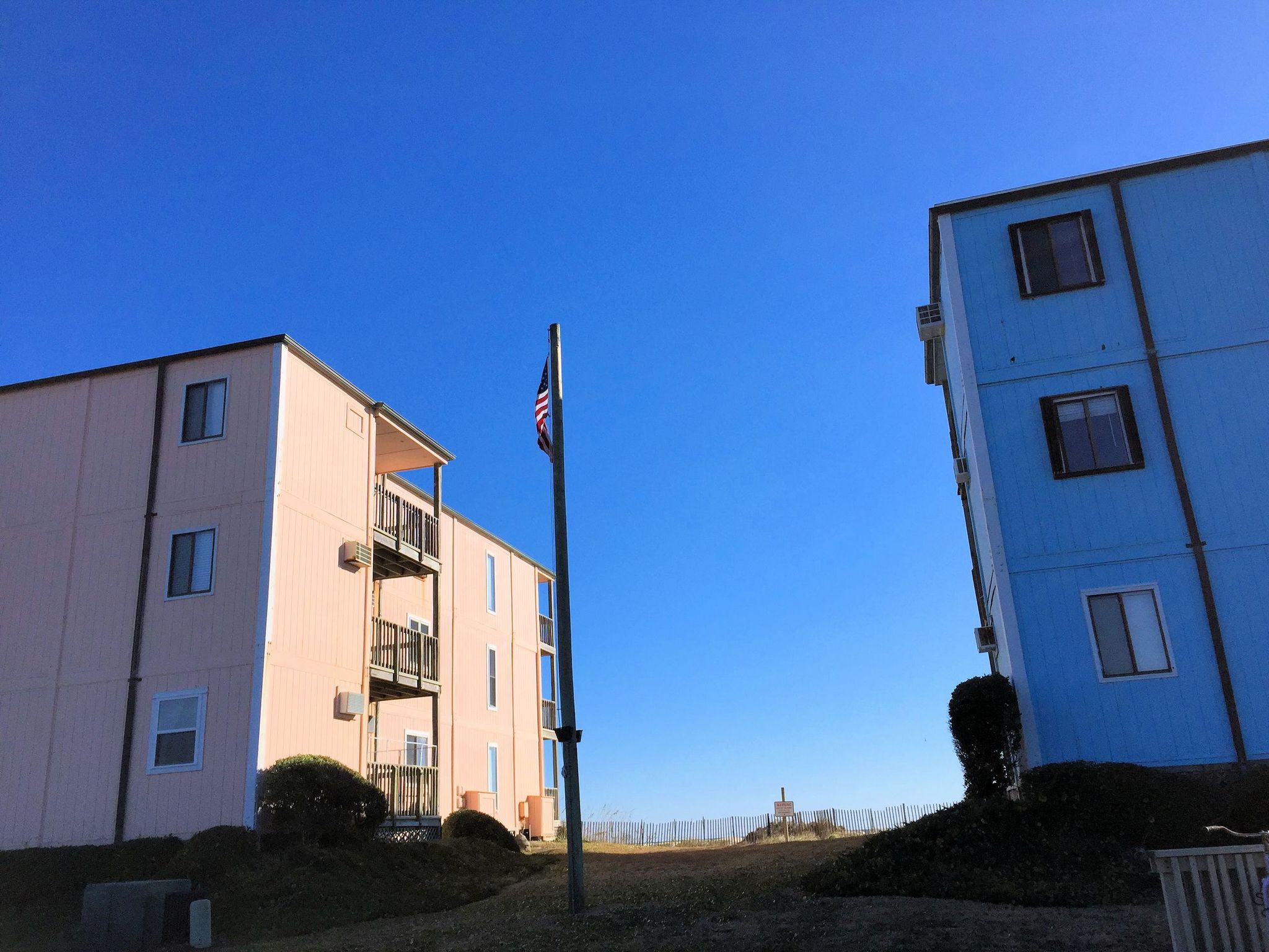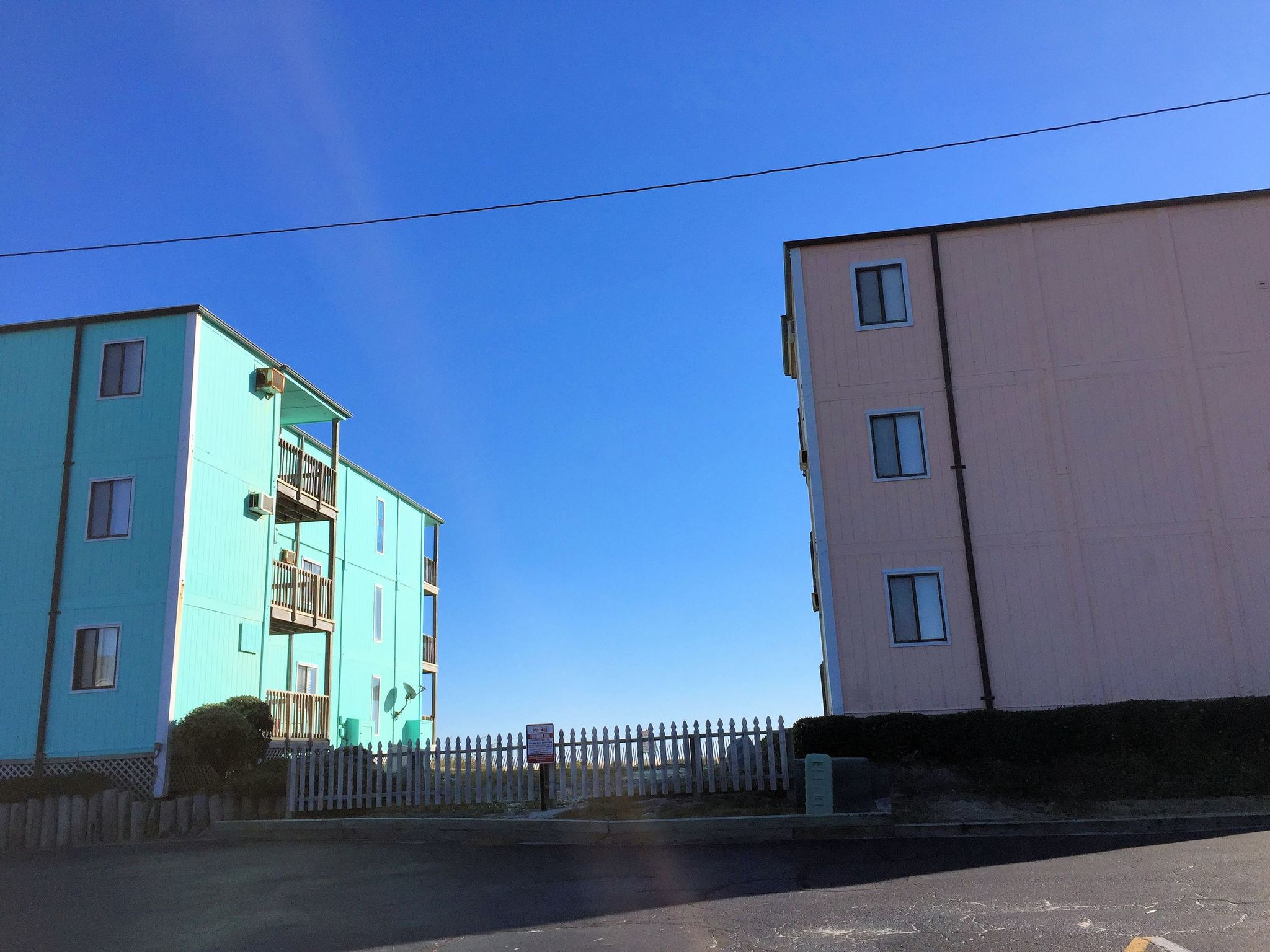 Topsail Reef is an oceanfront condo complex located at the northern-most point of North Topsail Beach, North Carolina. The community consists of 8 buildings of 1 or 2-bedroom units, many of which have balconies with gorgeous ocean views. One-bedroom units are a little more than 500 square feet, and two-bedroom units are around 800. Each Topsail Reef unit has the same number of bathrooms as bedrooms (less fighting over who has been in the shower too long).