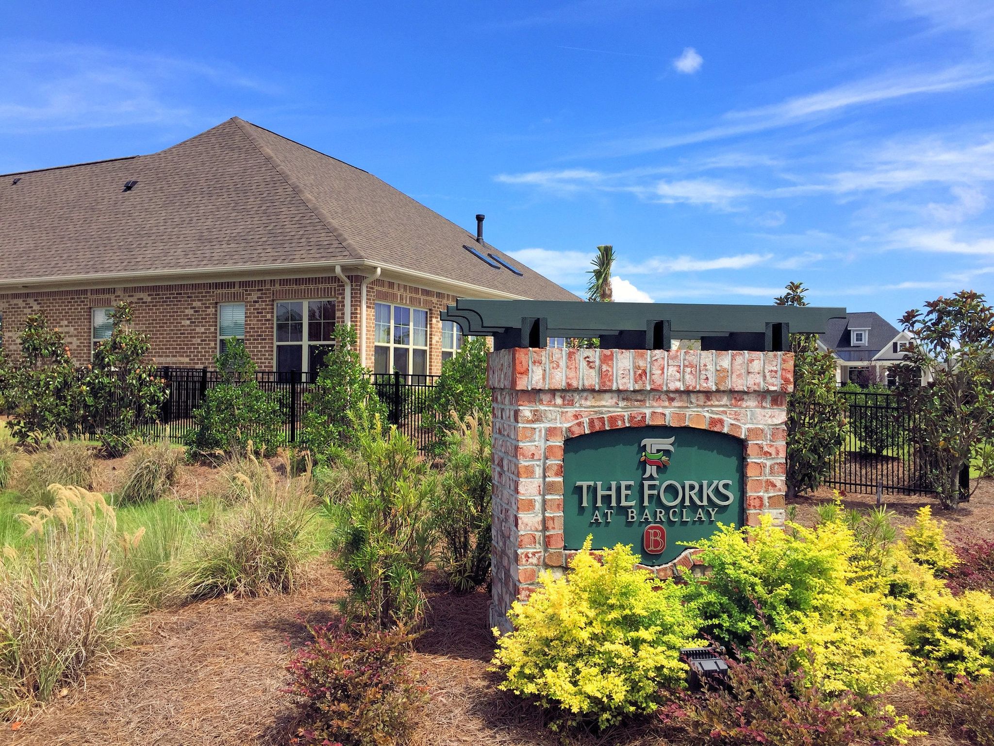 This 46-acre community features 71 single-family homes and 52 townhomes built by Trusst Builder Group. Homes in The Forks at Barclay range from 1,600 sq.ft. to 3,565 sq.ft. with 2-4 bedrooms, 2-4 bathrooms, and 2-car garages. Elevations reflect the Southern cottage styles popular among buyers and are finished with brick veneer and fiber cement board. Most properties, including the townhomes, have a rear patio.