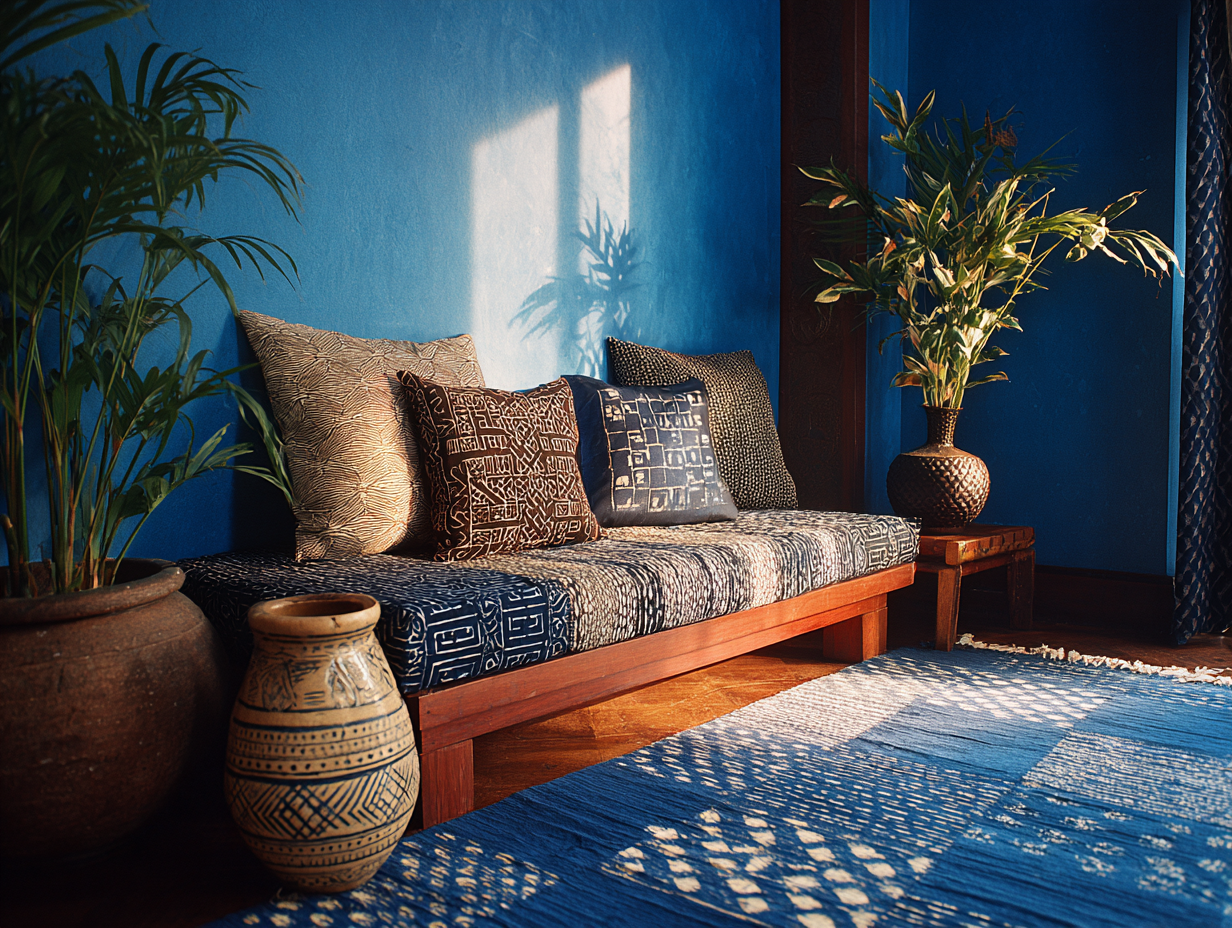 - Throw pillows: Use indigo adire pillow covers on a neutral sofa to add depth and global character.
