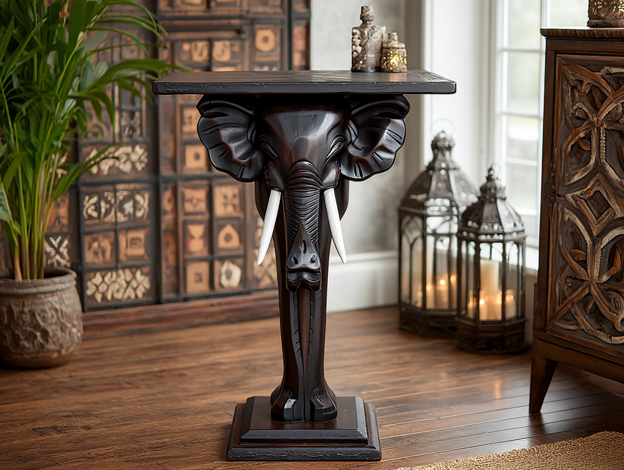 Specific product ideas to search for: “hand carved African stool,” “wood tribal stool side table,” or “carved wood accent table.”