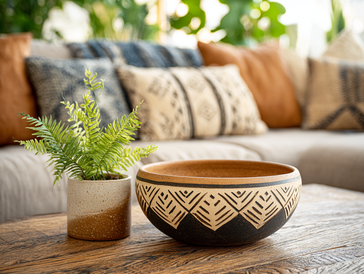 Ceramics help Afrohemian spaces feel grounded. Look for imperfect shapes, matte finishes, and earthy tones that echo terracotta, sand, and charcoal. Group vessels on a mantel, style them on open shelving, or use larger clay pots as planters.